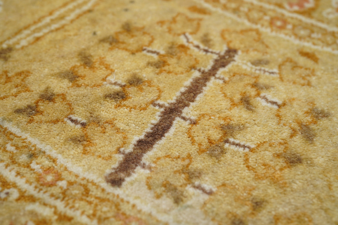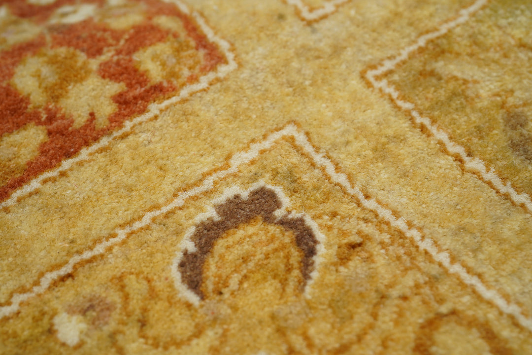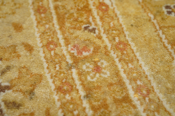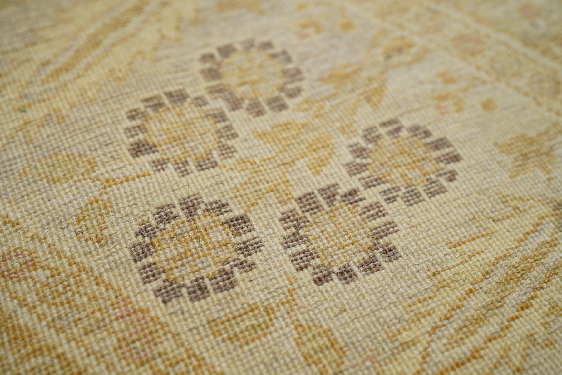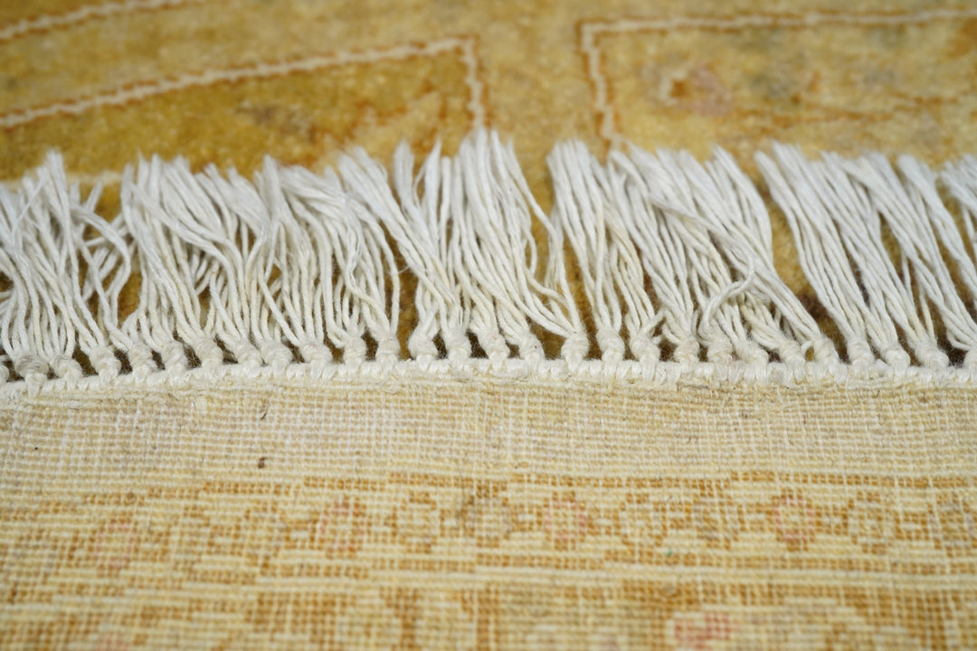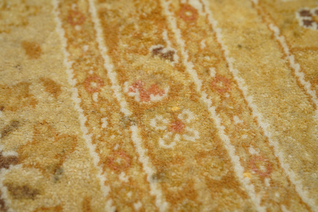 An unusual, lightly toned, circular version of the paneled "garden design". with three echelons of lollipop and branching trees, cypresses, and dense floral compositions, on rust, red, tangerine and straw. Sandy border of two alternating upright flower modules. Ecru round centre. Finely woven. Recent. New condition.