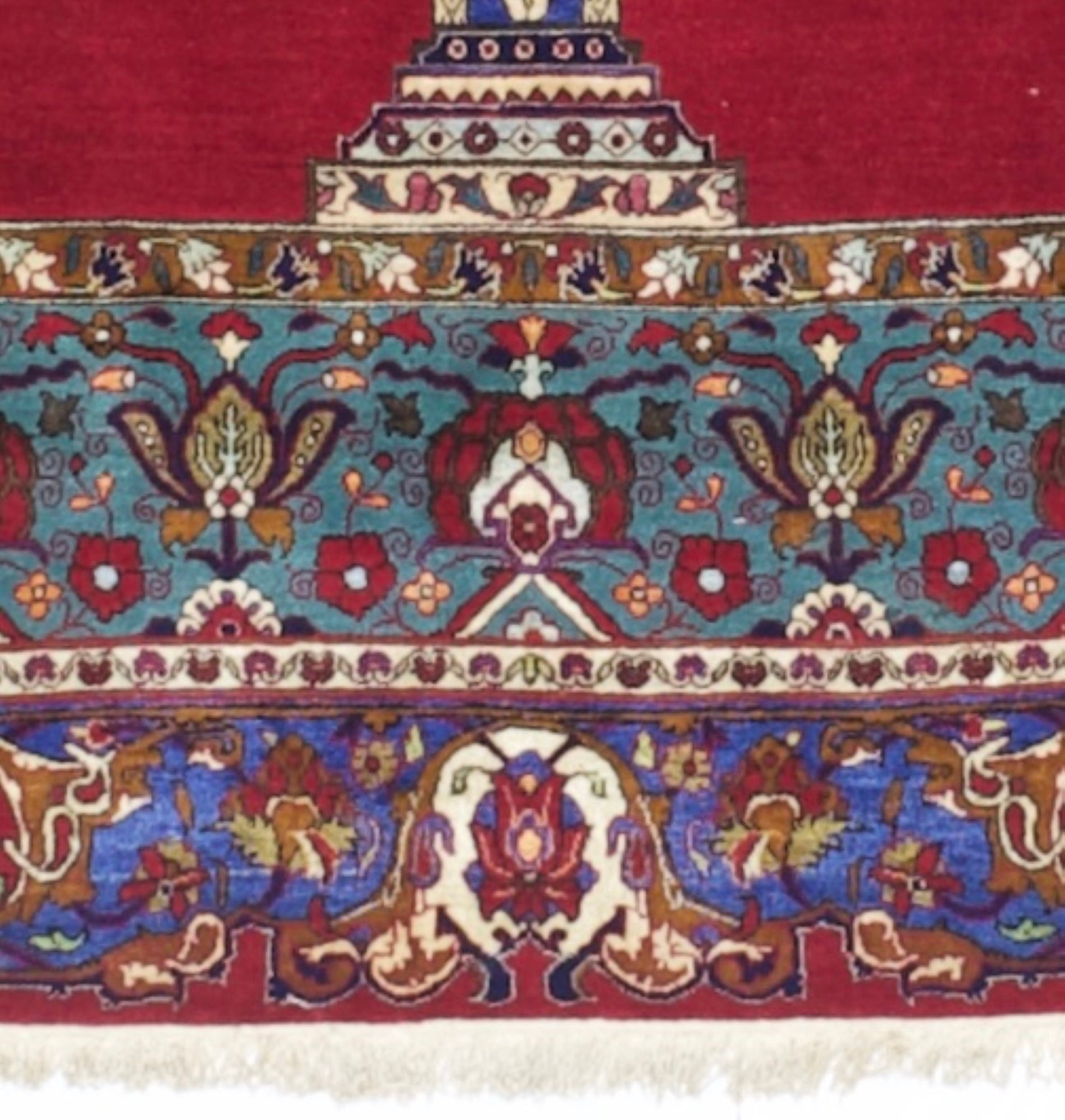 Central Persian city known for finely woven. room size and scatter rugs, with dominant reds and navy, and medallion patterns and swirling palmettes. Wool and a few silk pieces. Active since the 16th century, but with breaks, Revival began with Mohtasham (see below) in the 1880’s.