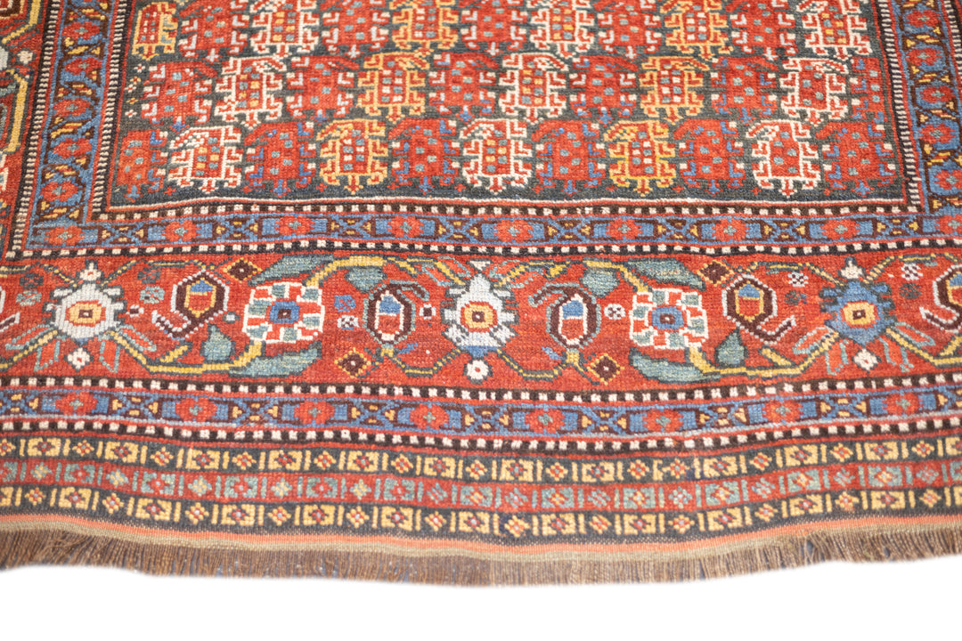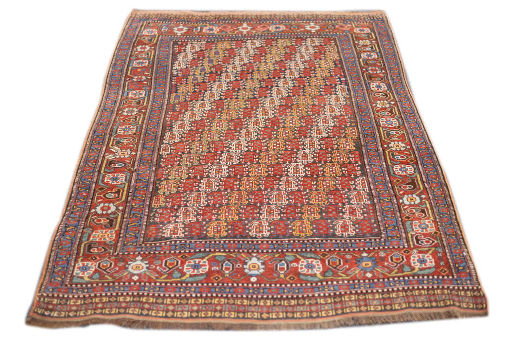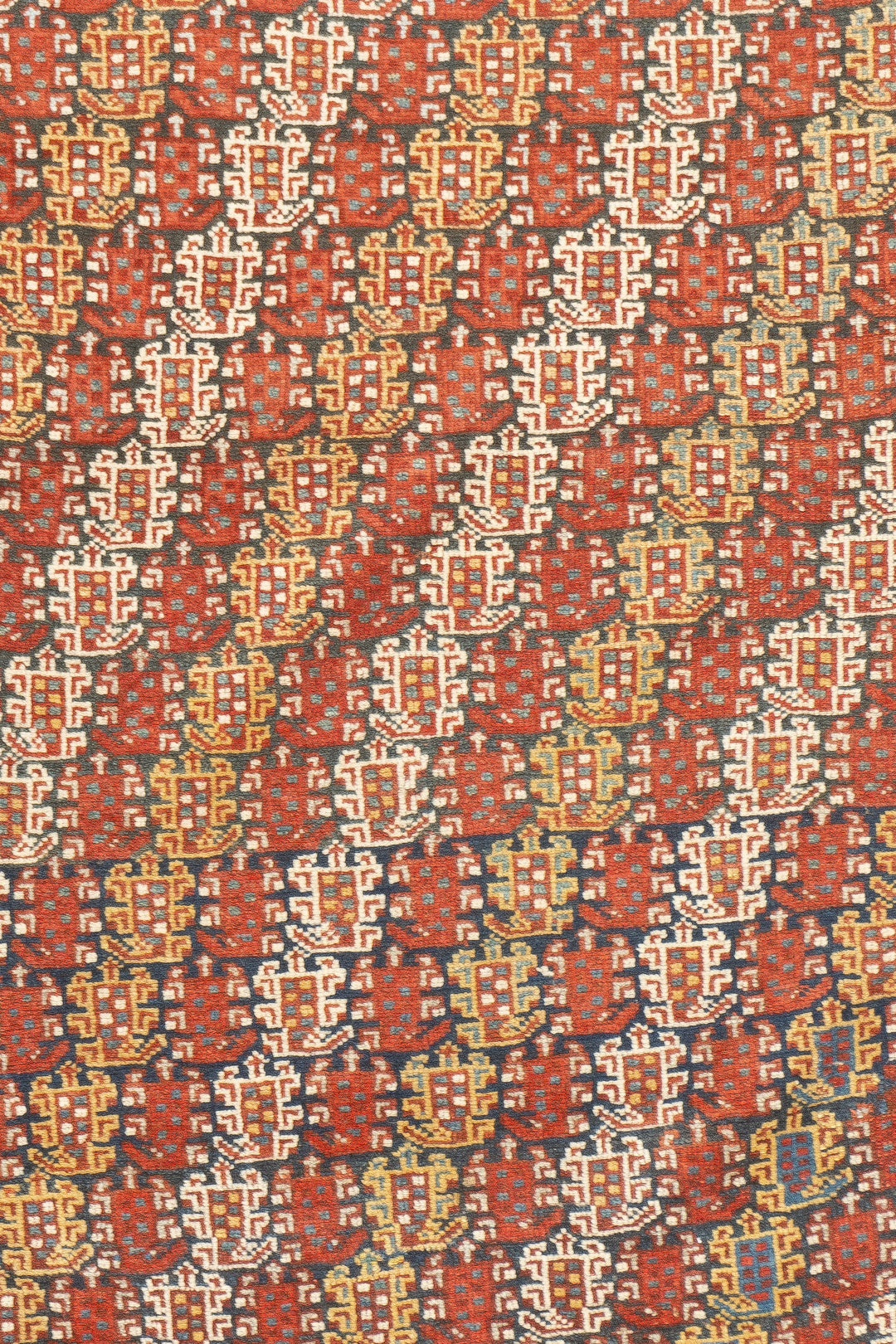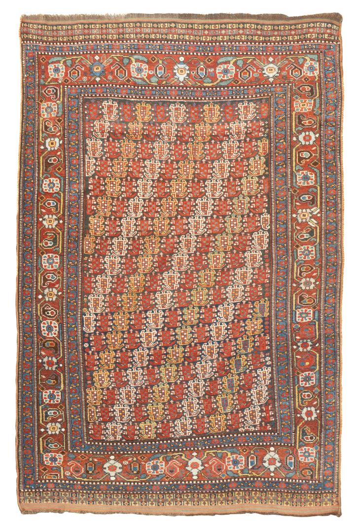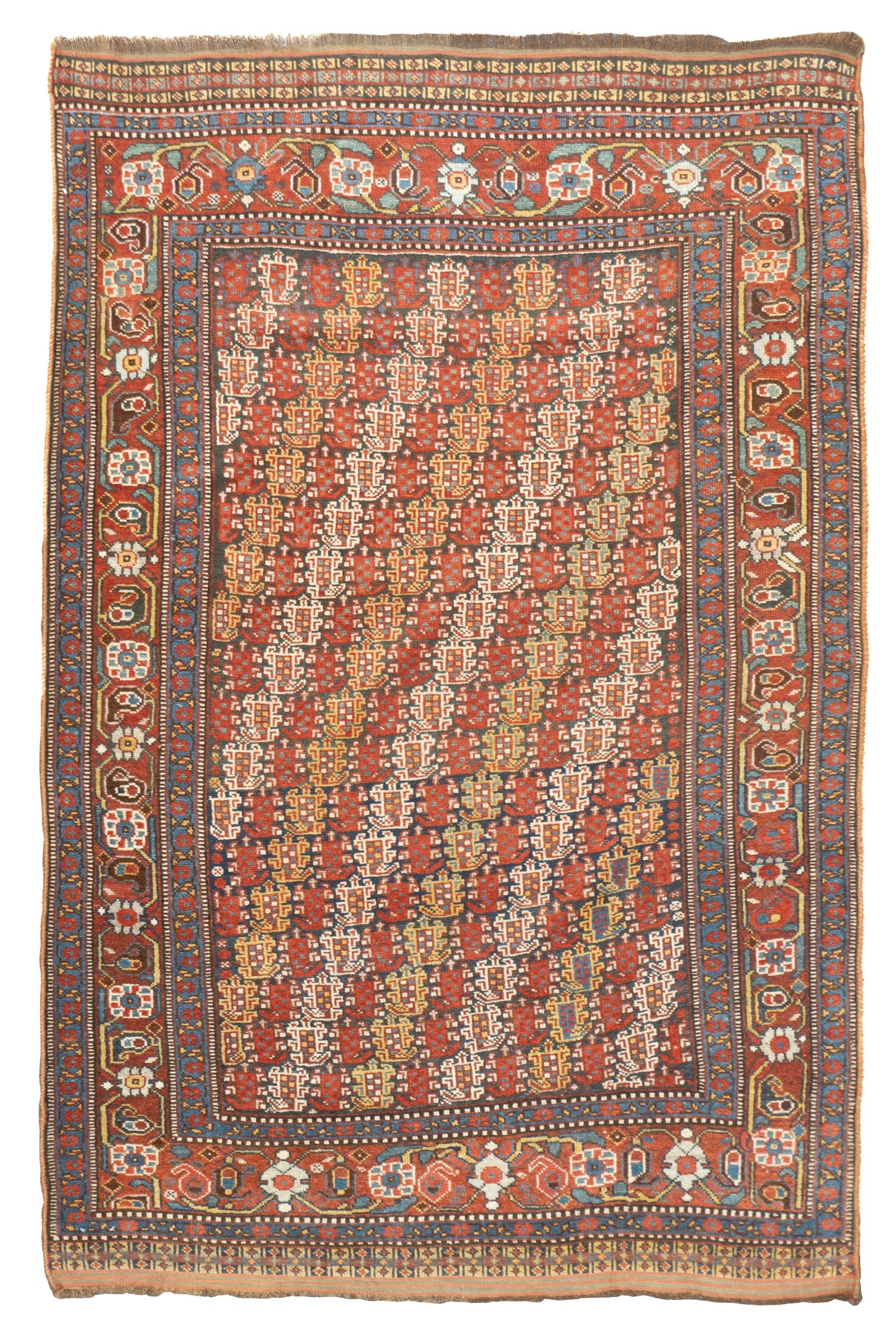The non-Qashghai tribes in SW Persia weaving a wide variety of geometric and abstract scatters and bagfaces. The best weavers are the Baharlu of Turkic descent, Both symmetric and asymmetric knots; wool foundations predominate. Chickens are a popular secondary motif. Also called ‘Shiraz’. Moderate to medium weave. Bright palettes.