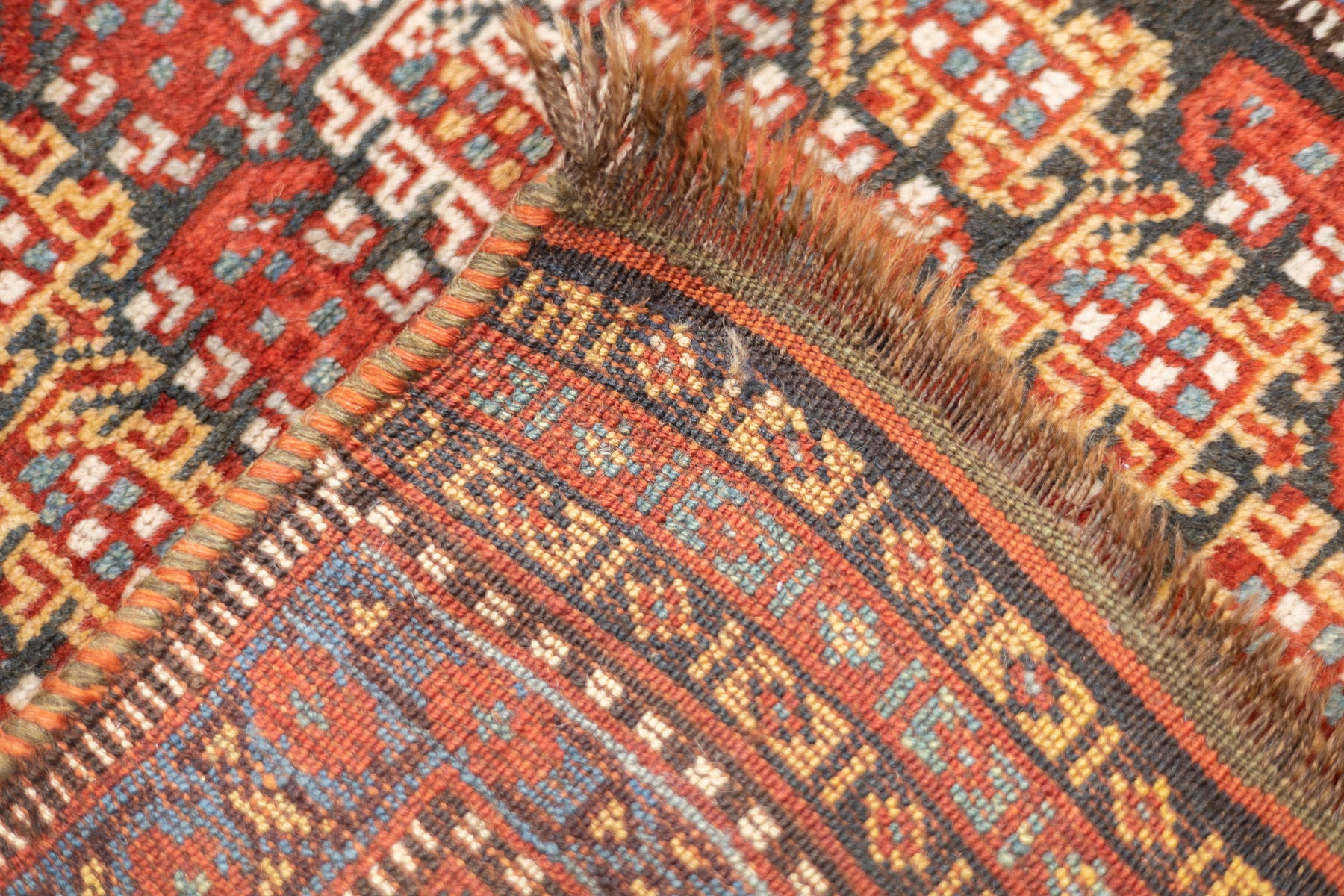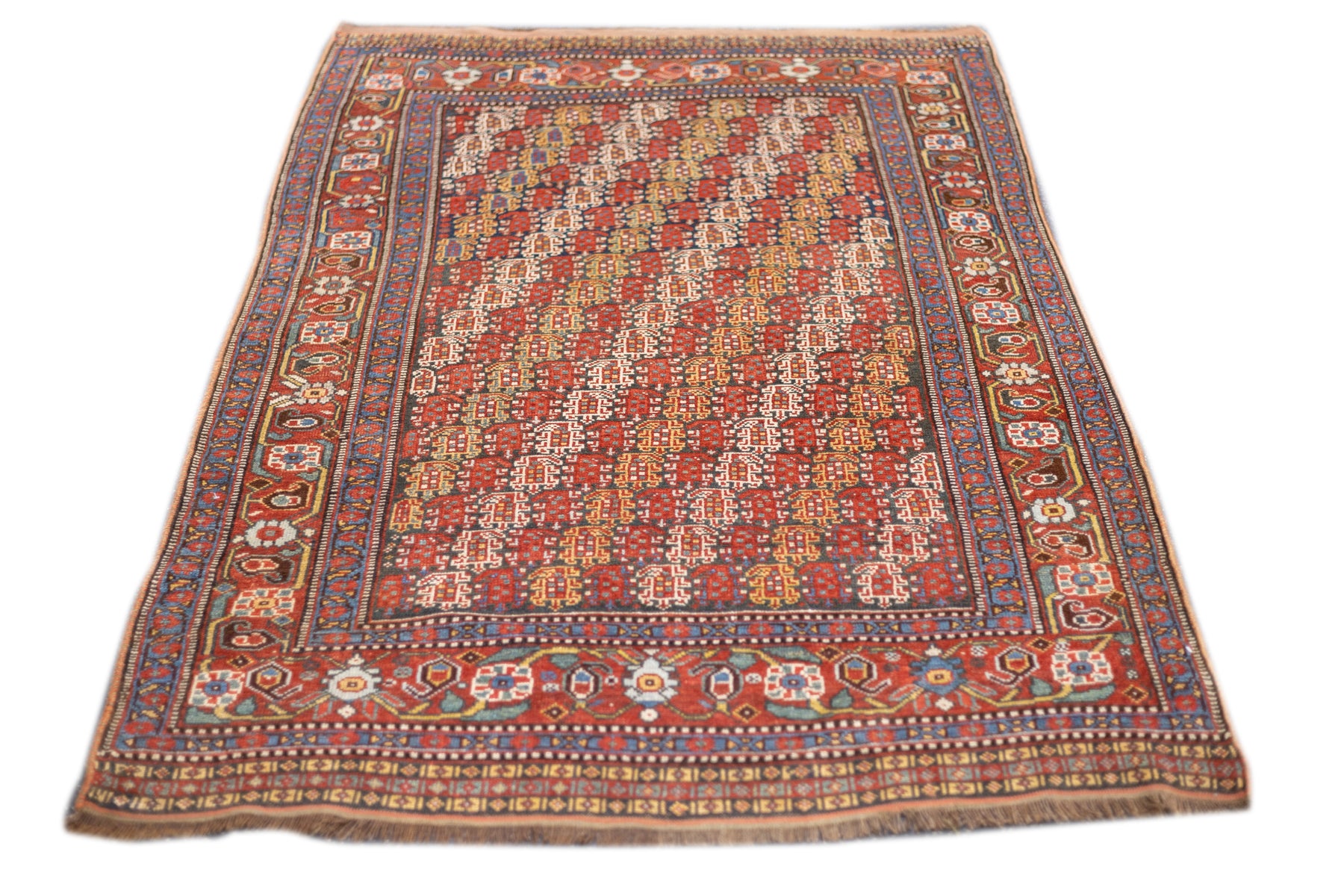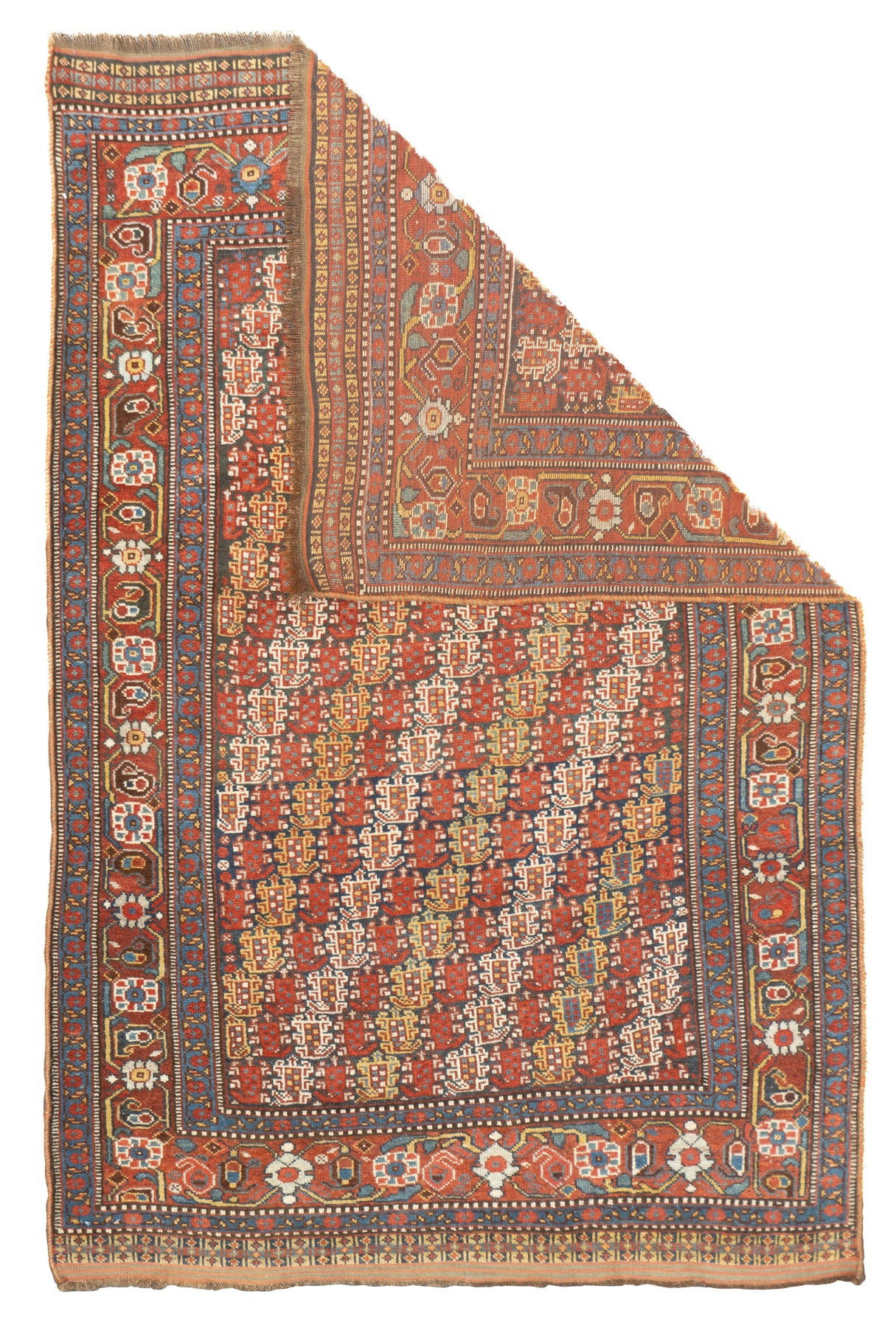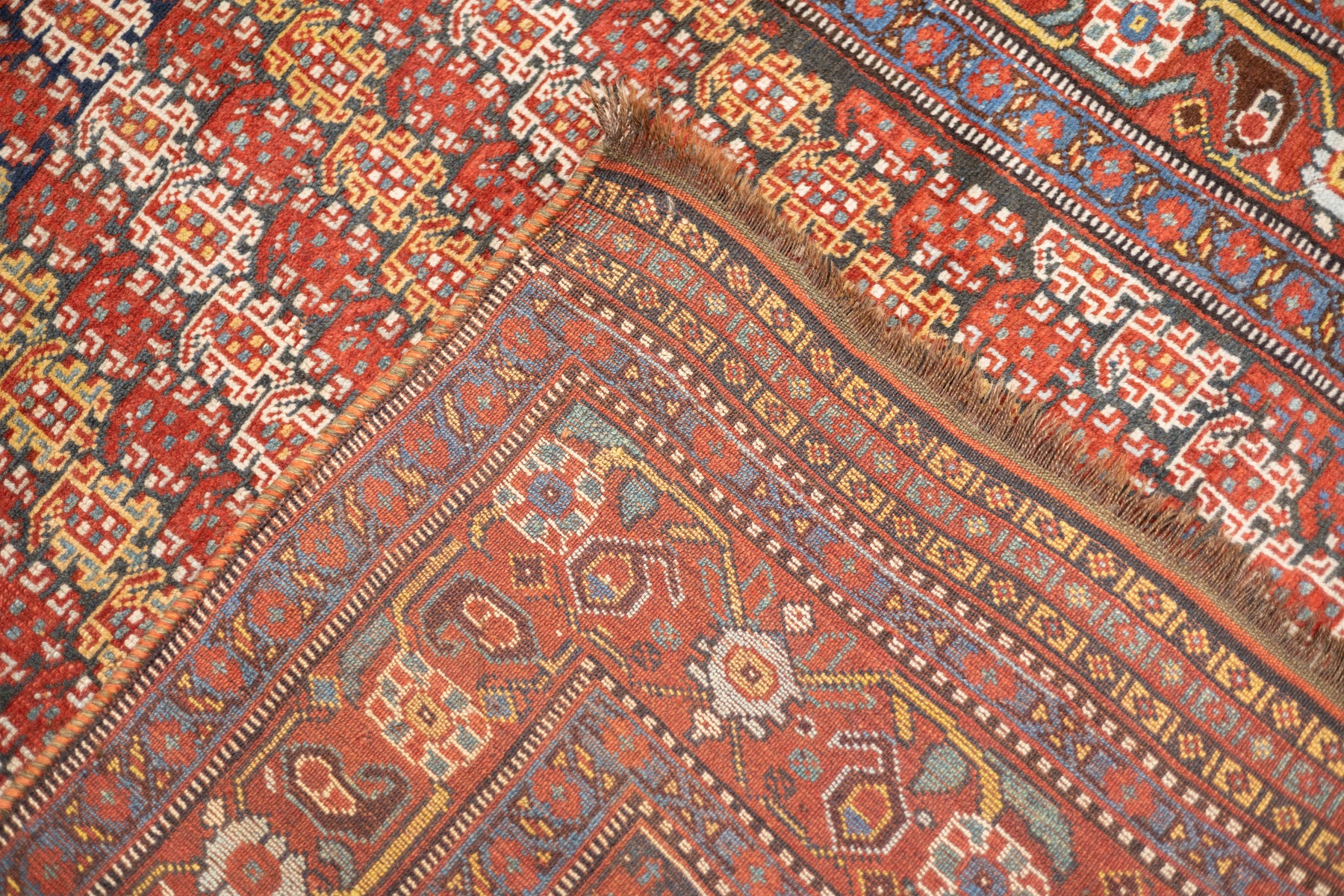 The non-Qashghai tribes in SW Persia weaving a wide variety of geometric and abstract scatters and bagfaces. The best weavers are the Baharlu of Turkic descent, Both symmetric and asymmetric knots; wool foundations predominate. Chickens are a popular secondary motif. Also called ‘Shiraz’. Moderate to medium weave. Bright palettes.