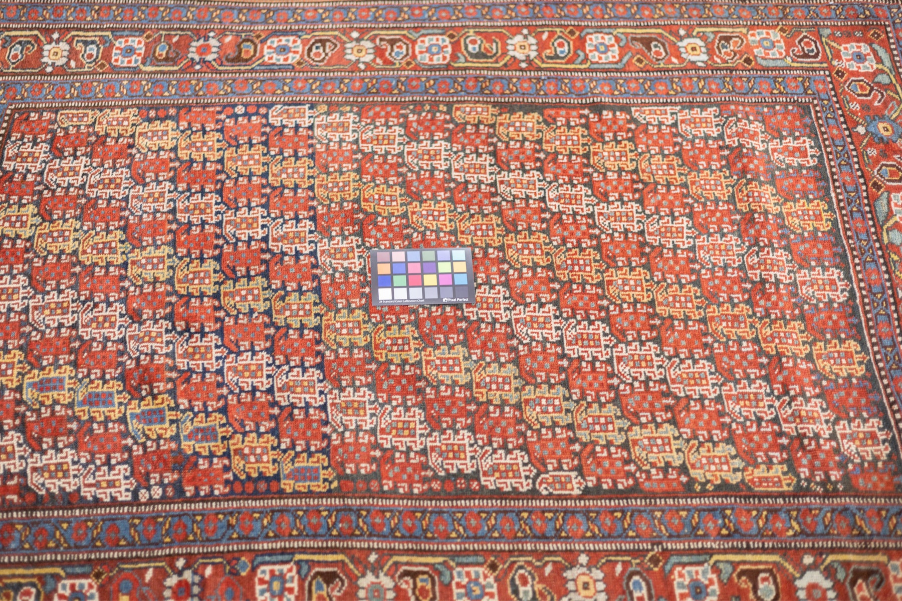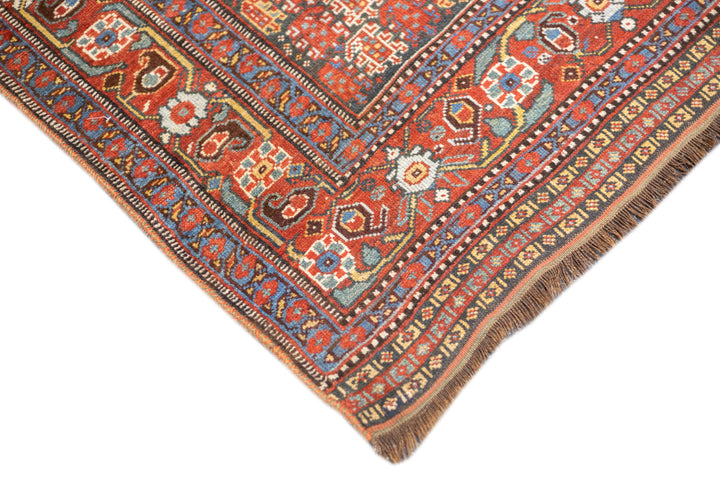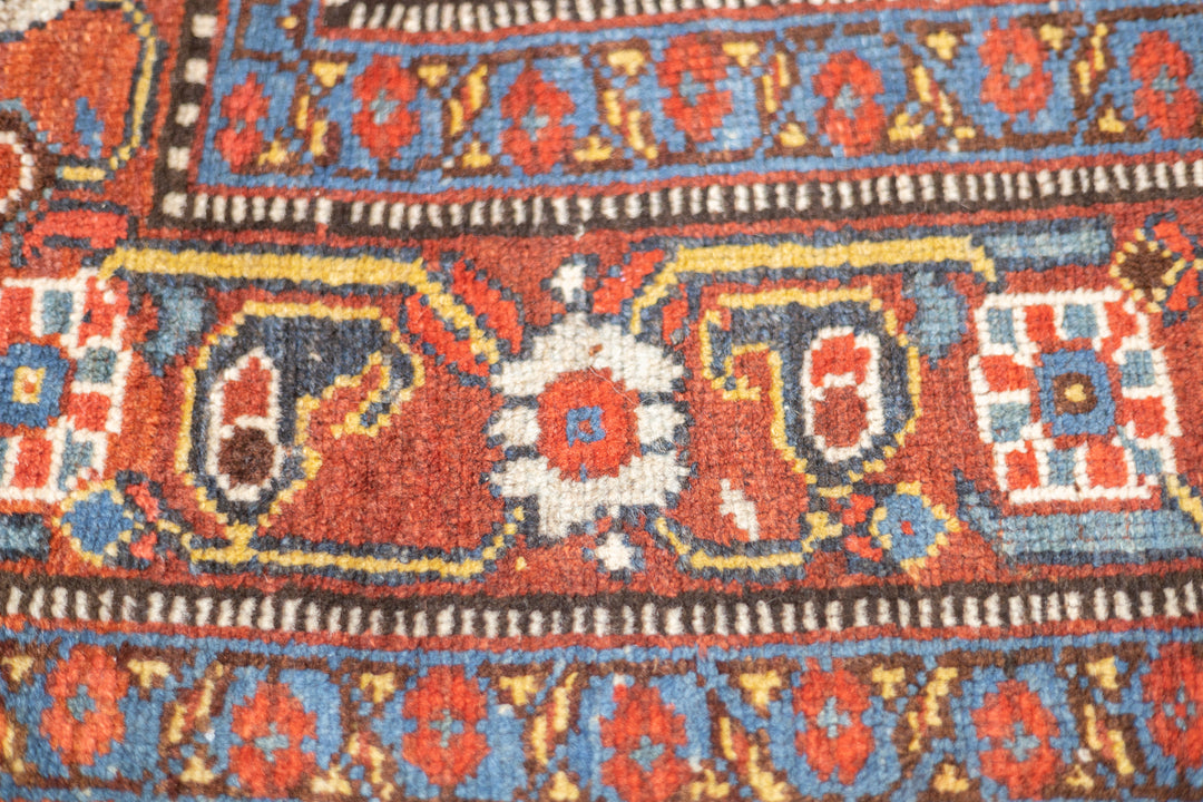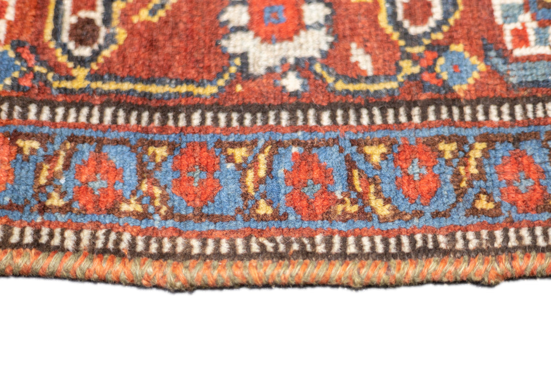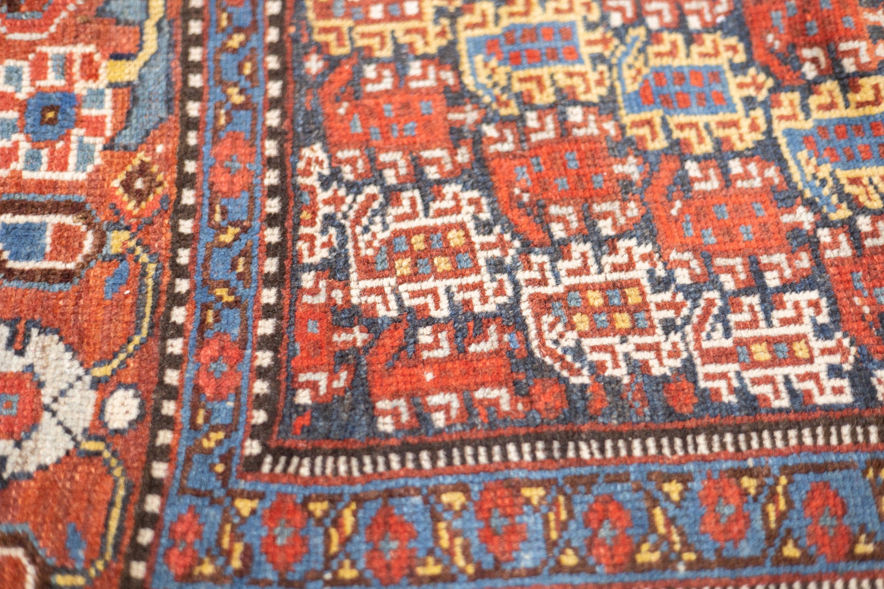 The non-Qashghai tribes in SW Persia weaving a wide variety of geometric and abstract scatters and bagfaces. The best weavers are the Baharlu of Turkic descent, Both symmetric and asymmetric knots; wool foundations predominate. Chickens are a popular secondary motif. Also called ‘Shiraz’. Moderate to medium weave. Bright palettes.