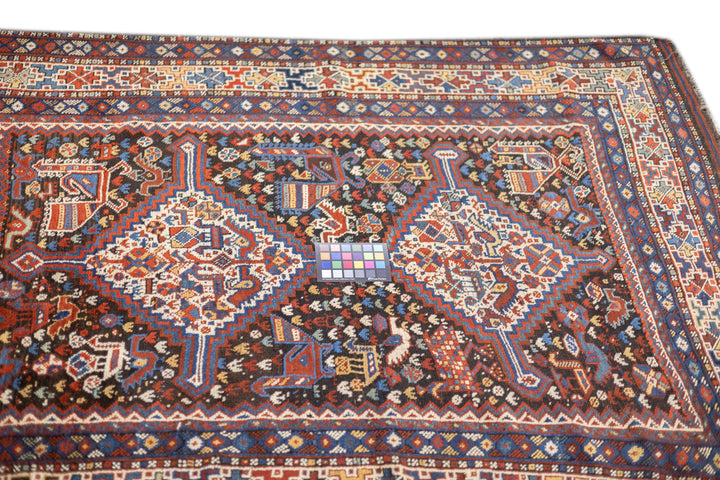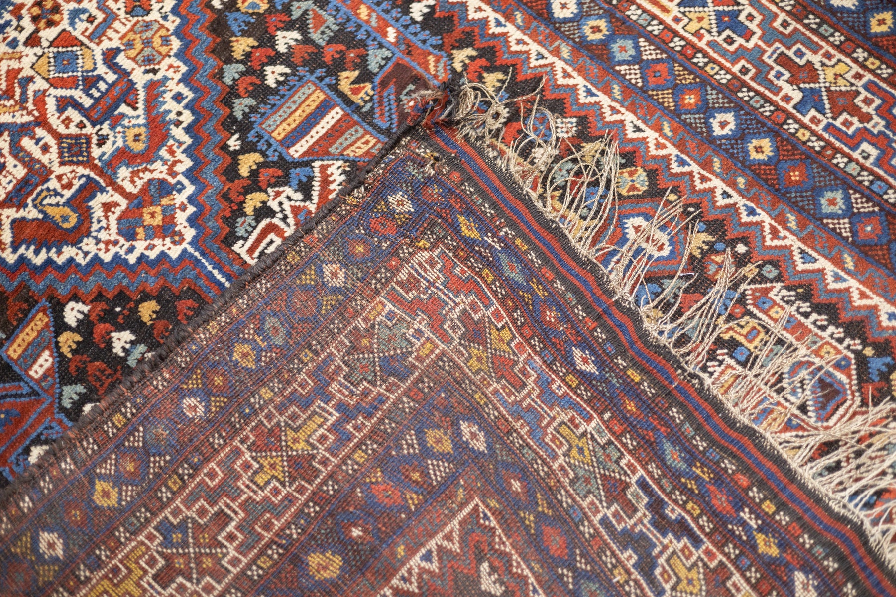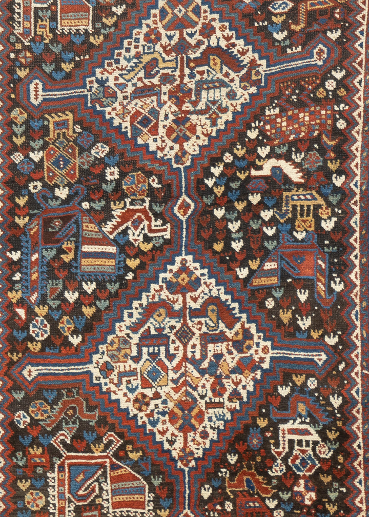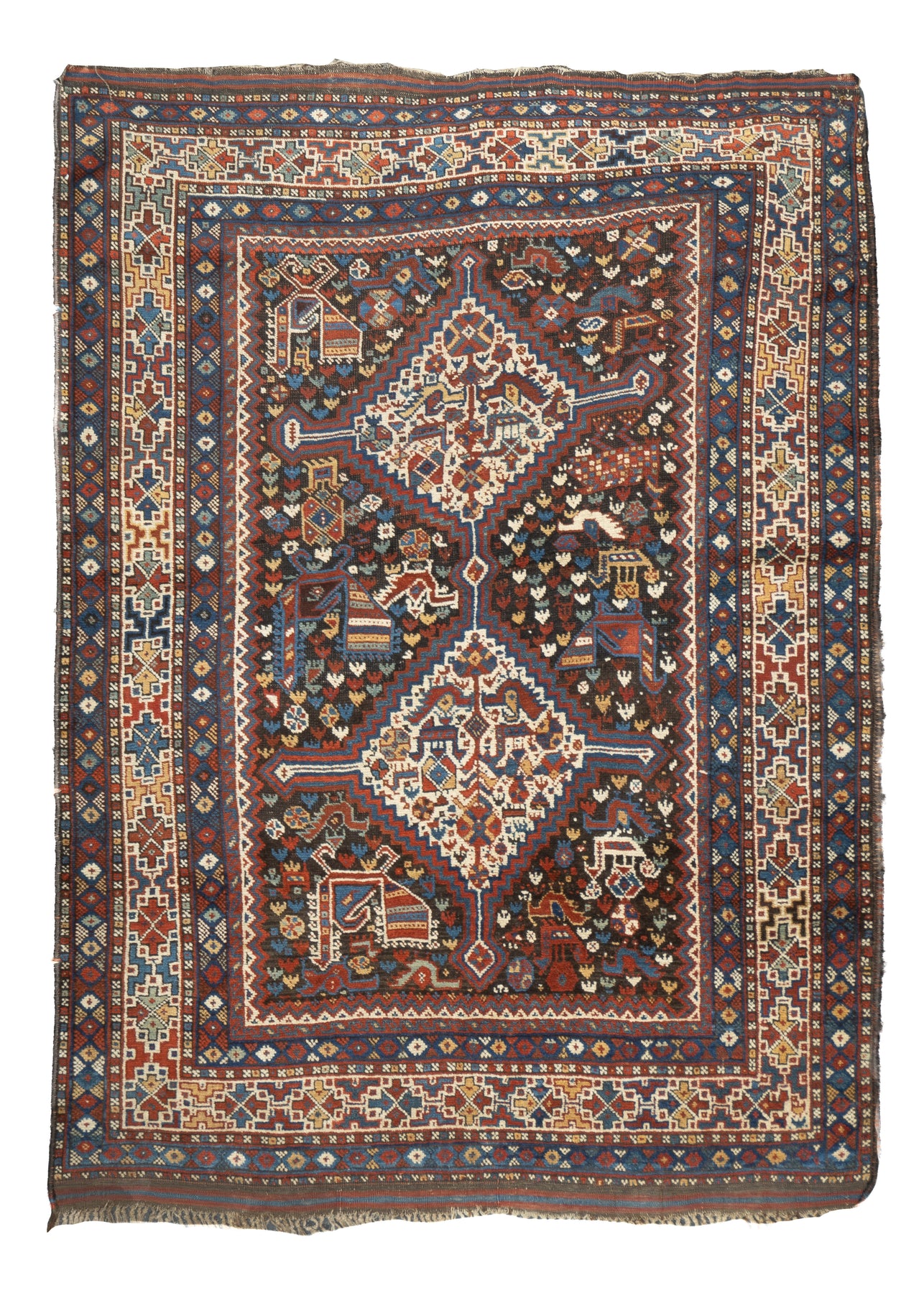 The best SW Persian, Fars Province nomadic rugs, mostly in scatter formats. Geometric Gabbehs, lion rugs, adapted Persian curvilinear styles. Some well-woven prayer rugs. All-wool constructions. Pictorial rugs. Weaving goes back to at least the mid-19th century. Excellent wool quality.