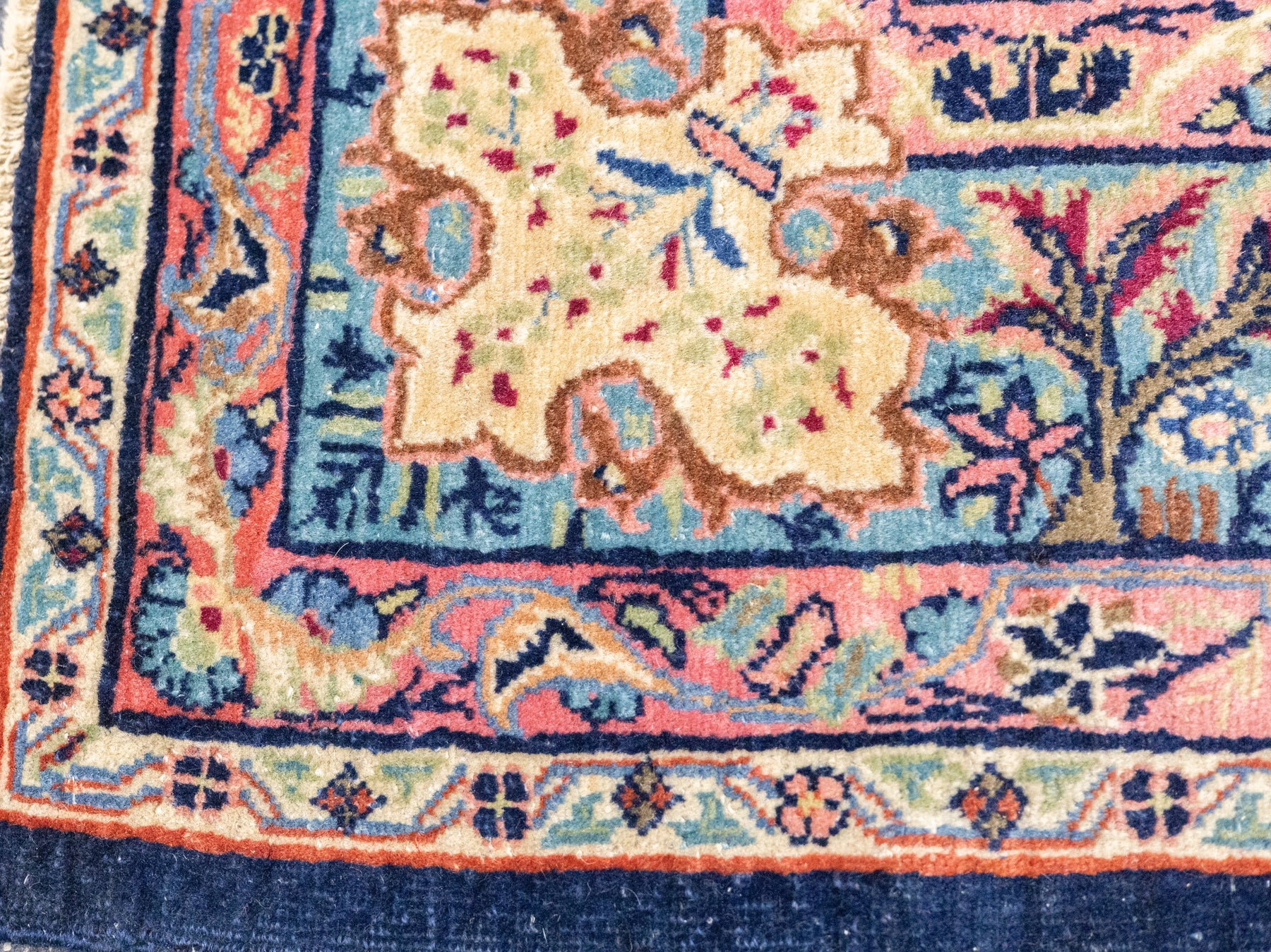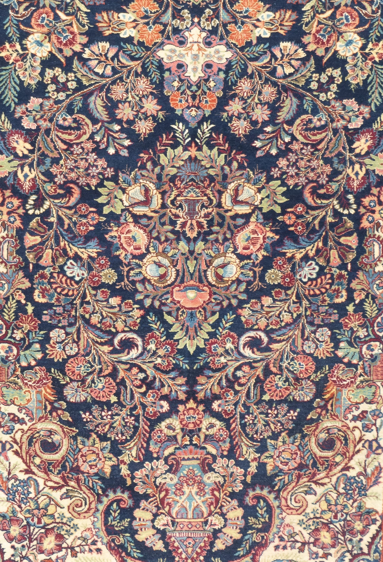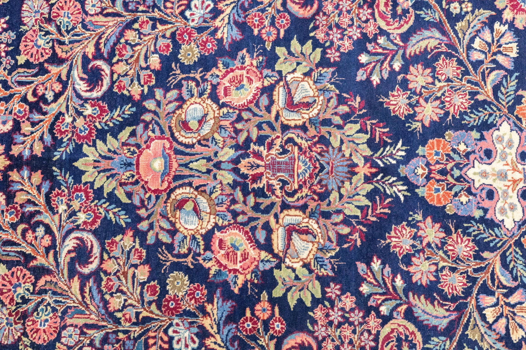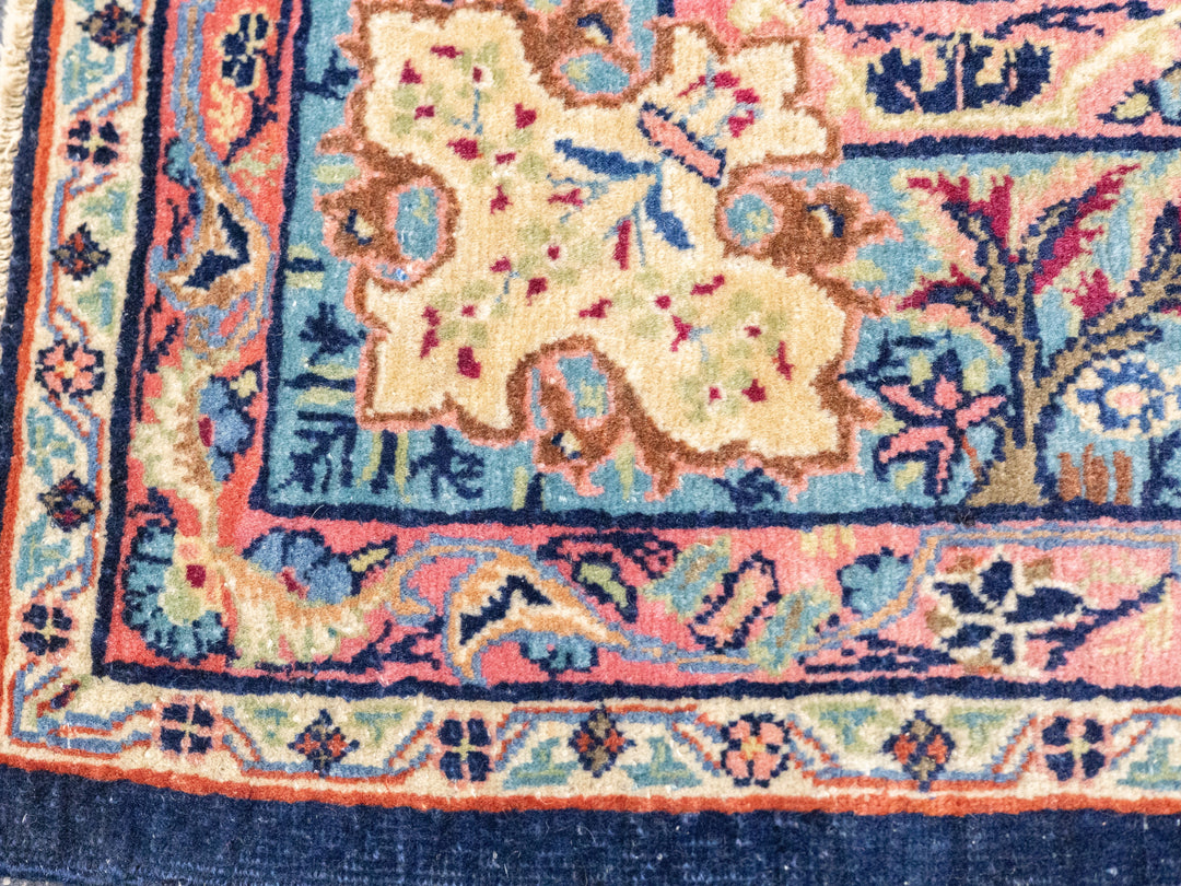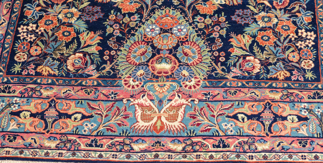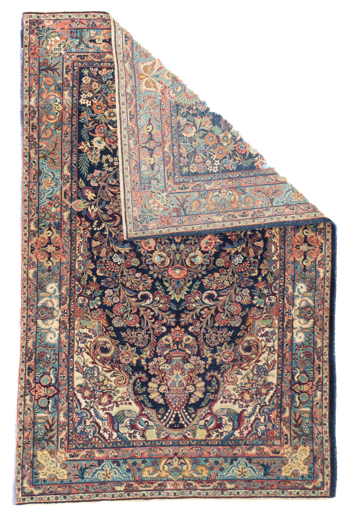The well-woven village carpets from the Arak/Sultanabad area, especially the red field/navy border, detached floral spray pattern “American Sarouks” of the 1920-1970 period. Robust and leathery, on cotton. Recent examples show medallions and classic allover patterns. Best Sarouks are reputed to be Mohajerans.