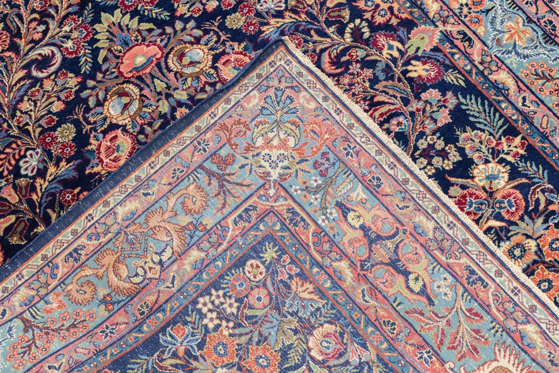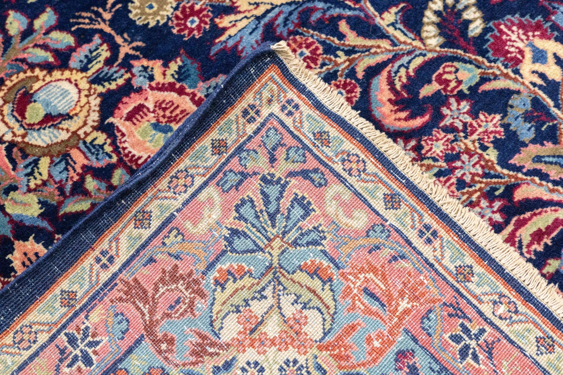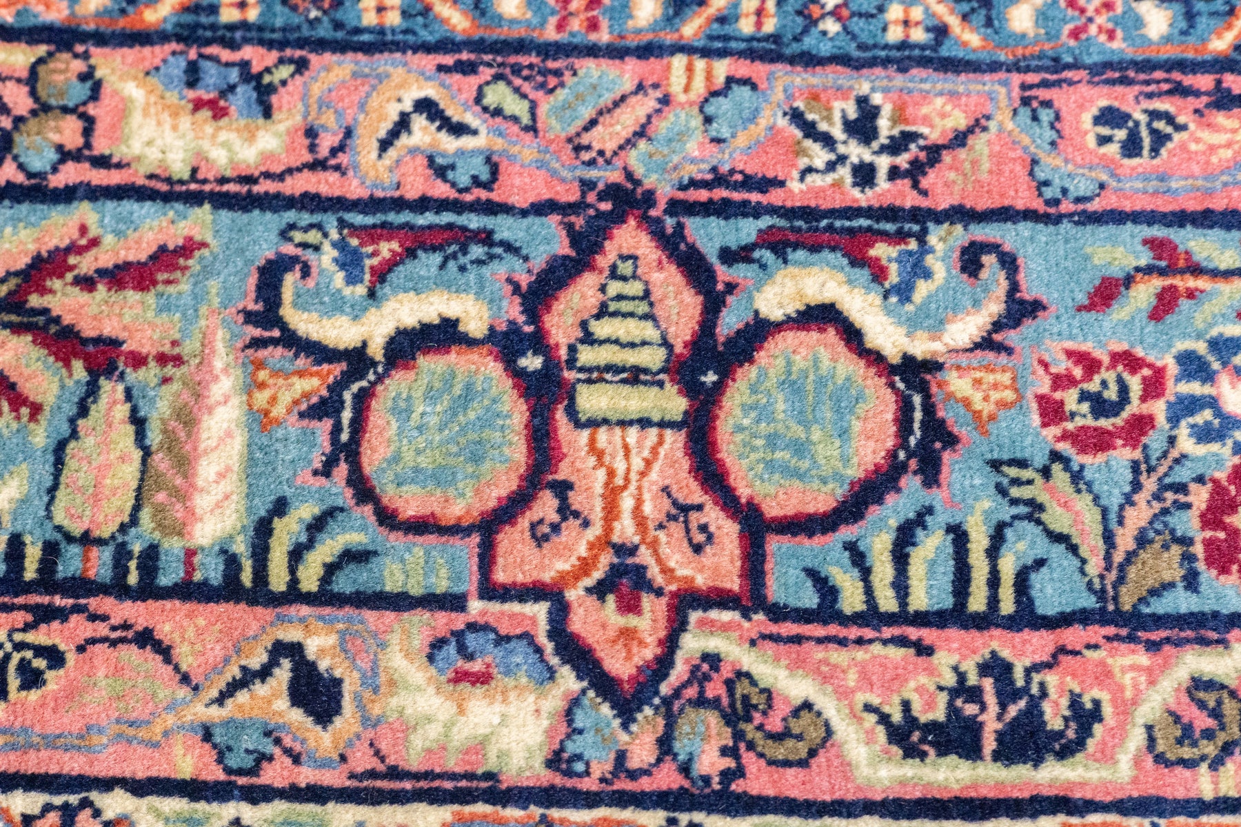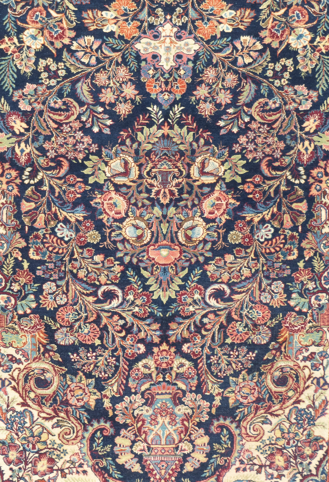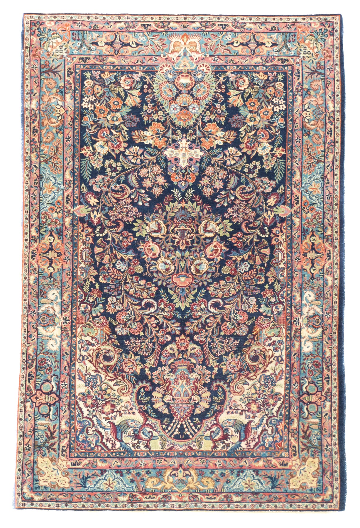The well-woven village carpets from the Arak/Sultanabad area, especially the red field/navy border, detached floral spray pattern “American Sarouks” of the 1920-1970 period. Robust and leathery, on cotton. Recent examples show medallions and classic allover patterns. Best Sarouks are reputed to be Mohajerans.