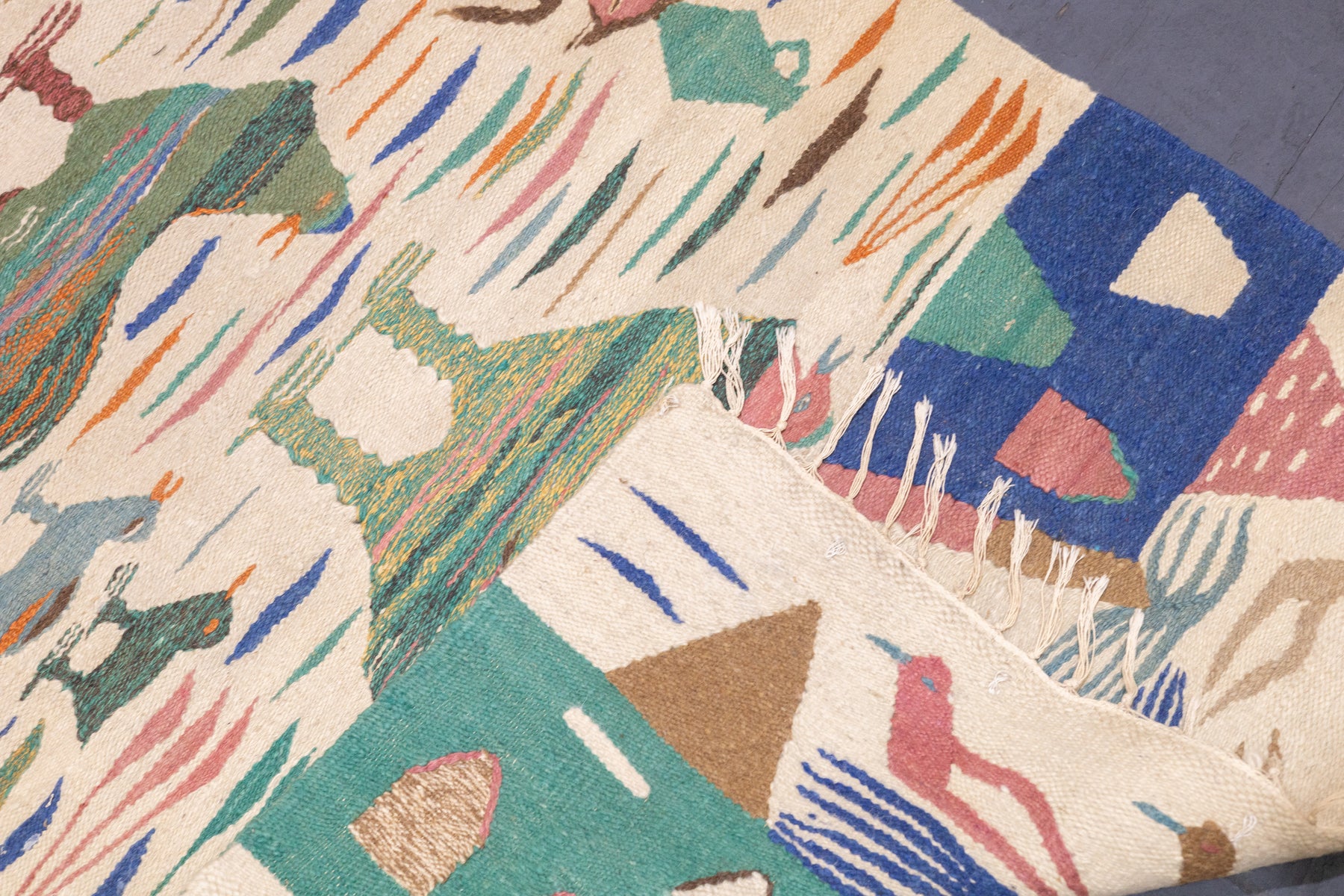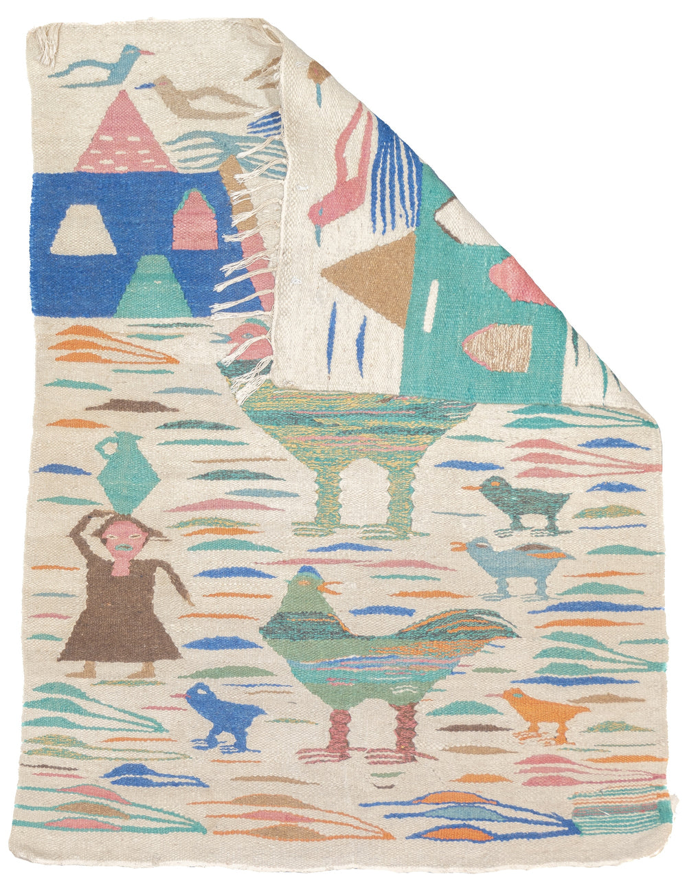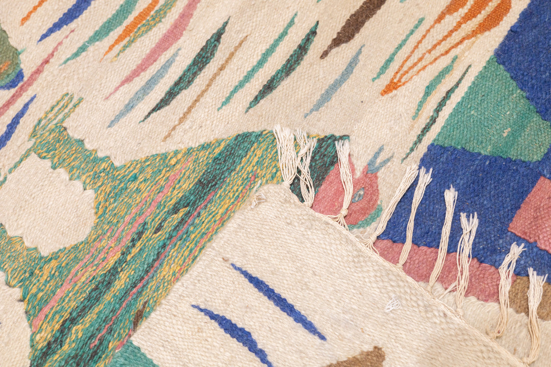 A technique rather than a type of rug. Technique is: slit tapestry, warp shared wefting, single or double weft interlocking. Also refers to plain-weave bands at end finishes. Kilims are light weight, generally made by villagers and nomads originally for household use. Senna kilims are extremely fine and are more like wall tapestries than floor rugs. Dhurries are Indian all-cotton kilims.
