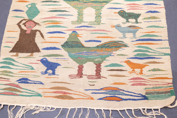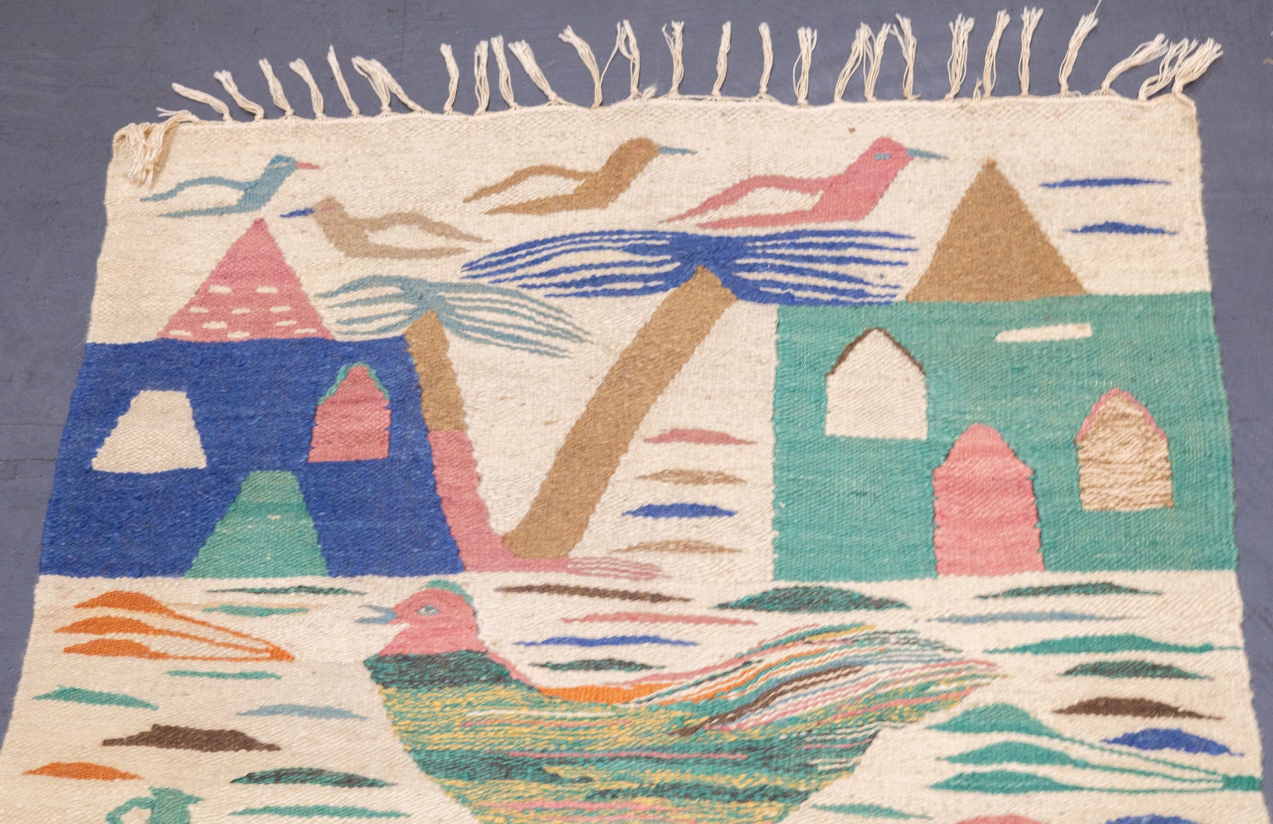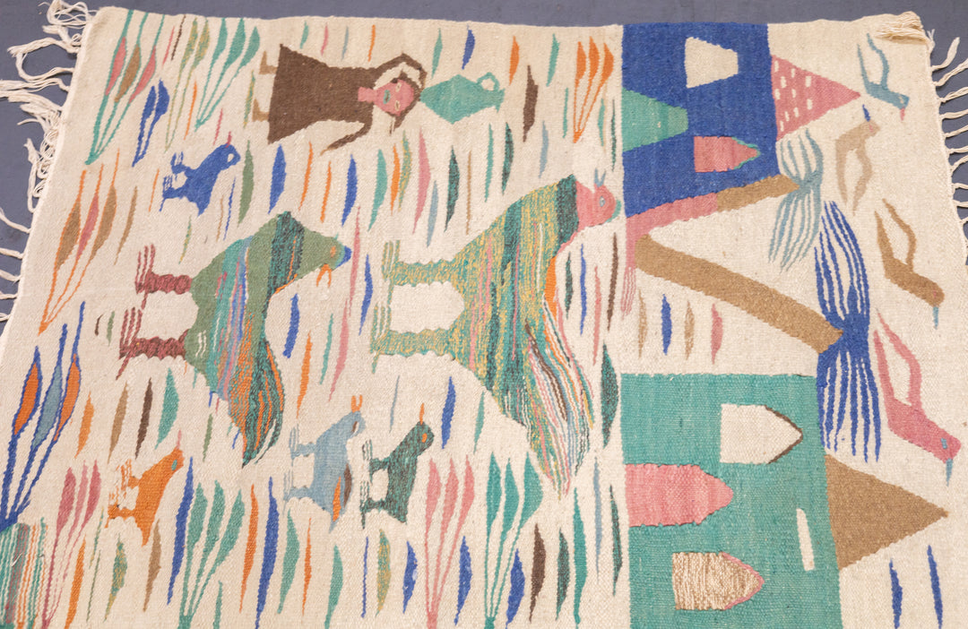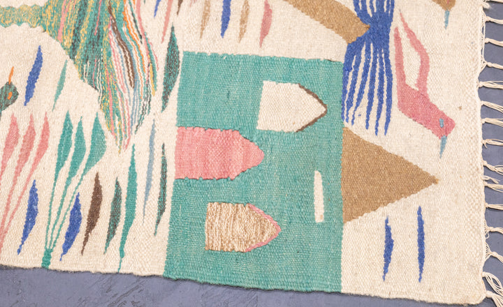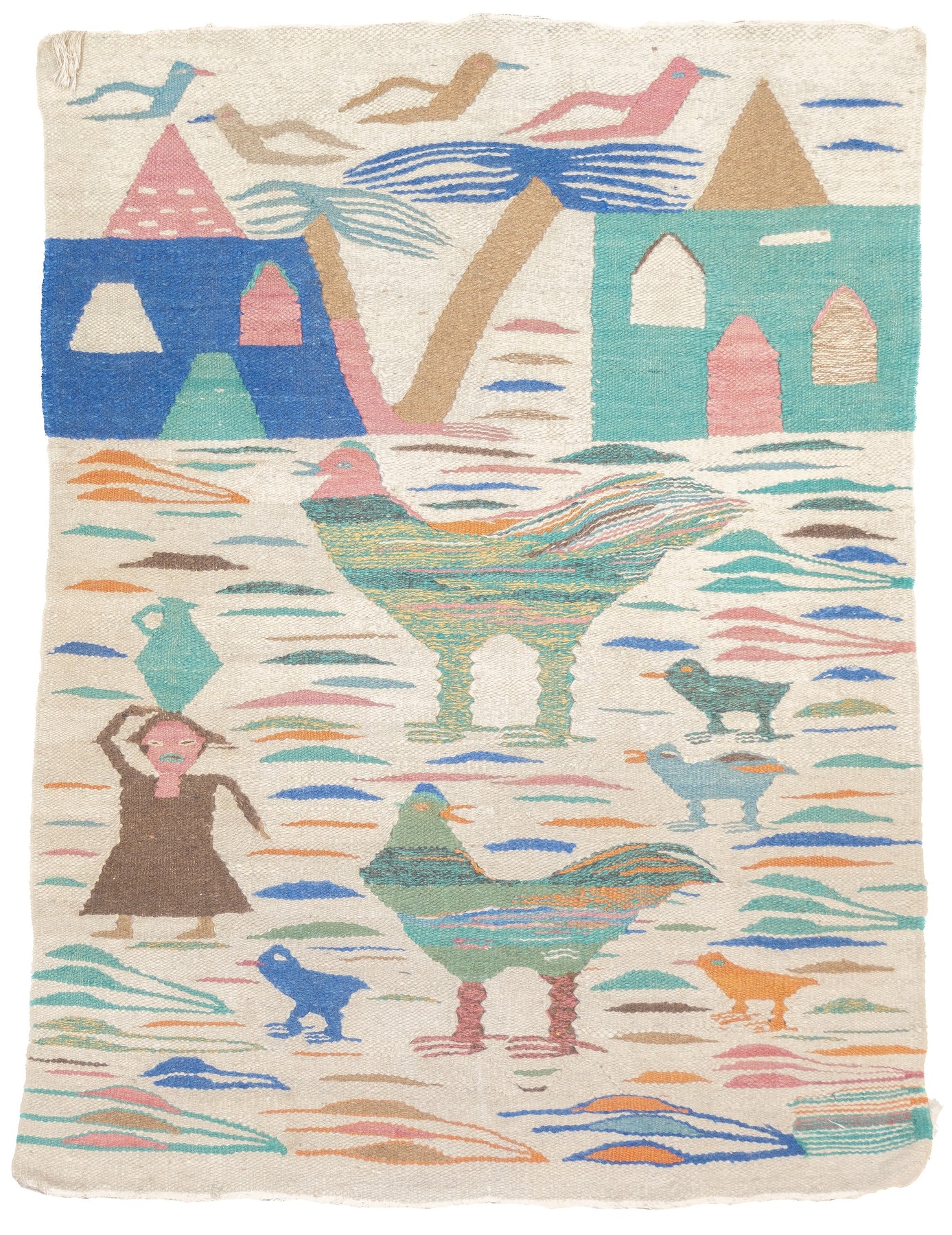A technique rather than a type of rug. Technique is: slit tapestry, warp shared wefting, single or double weft interlocking. Also refers to plain-weave bands at end finishes. Kilims are light weight, generally made by villagers and nomads originally for household use. Senna kilims are extremely fine and are more like wall tapestries than floor rugs. Dhurries are Indian all-cotton kilims.