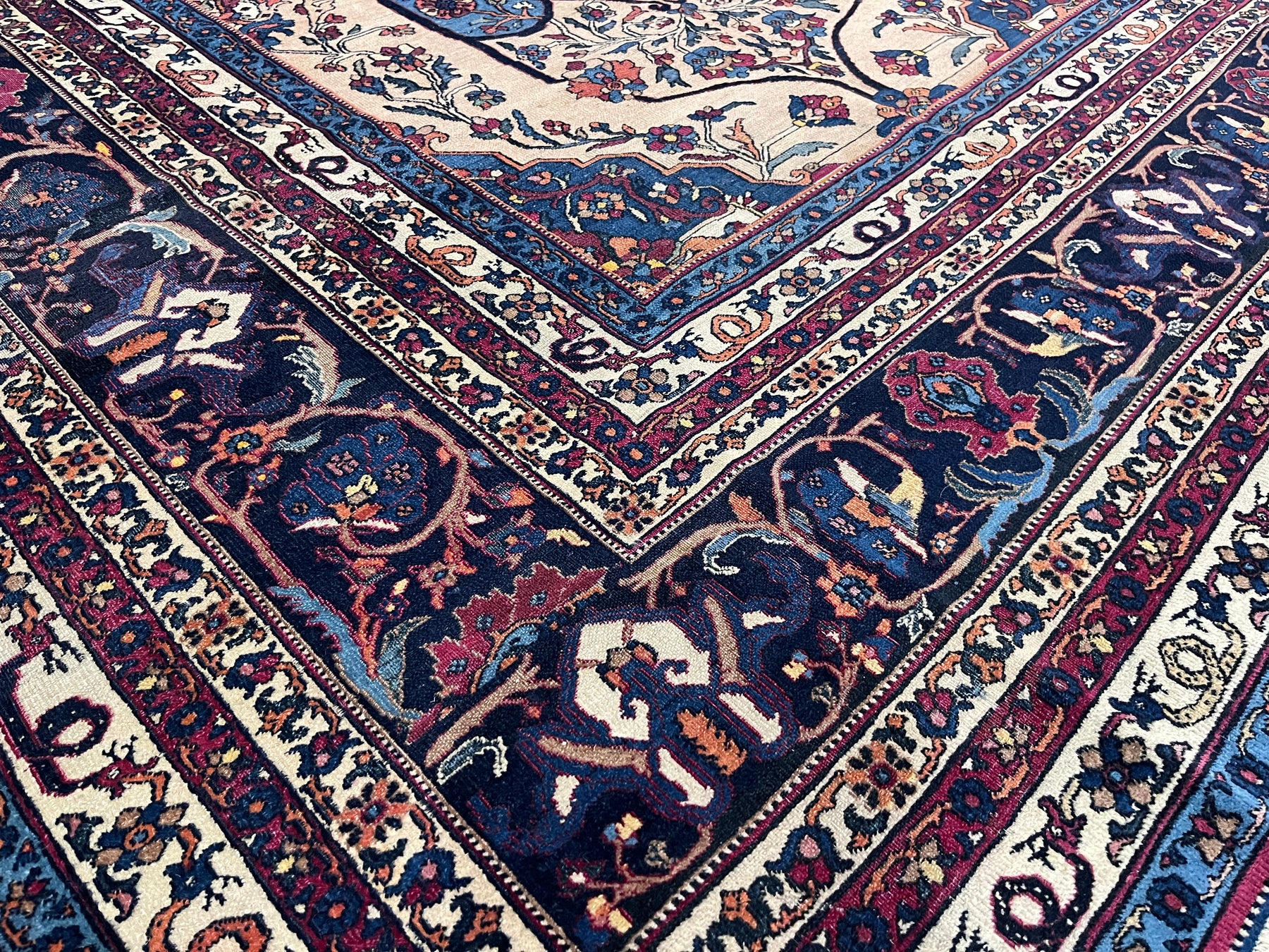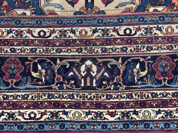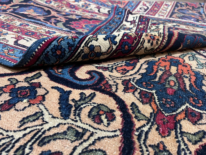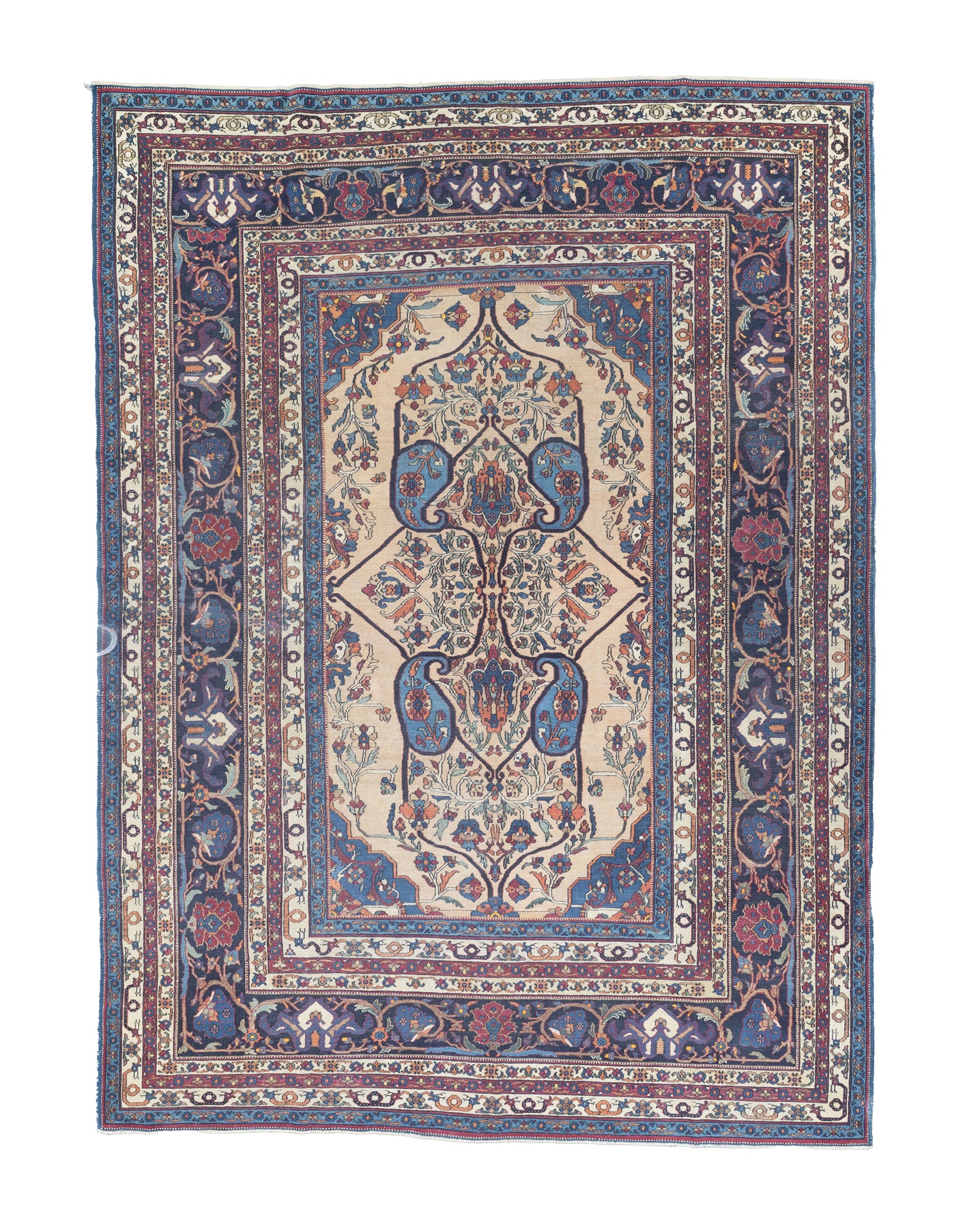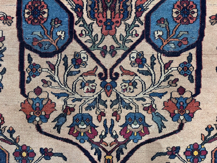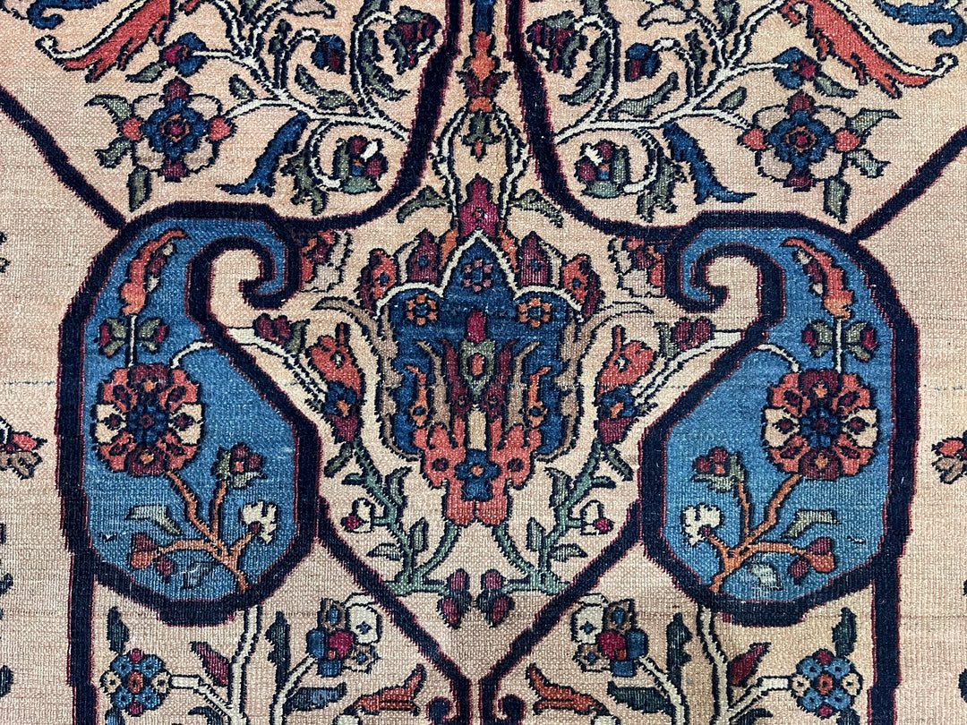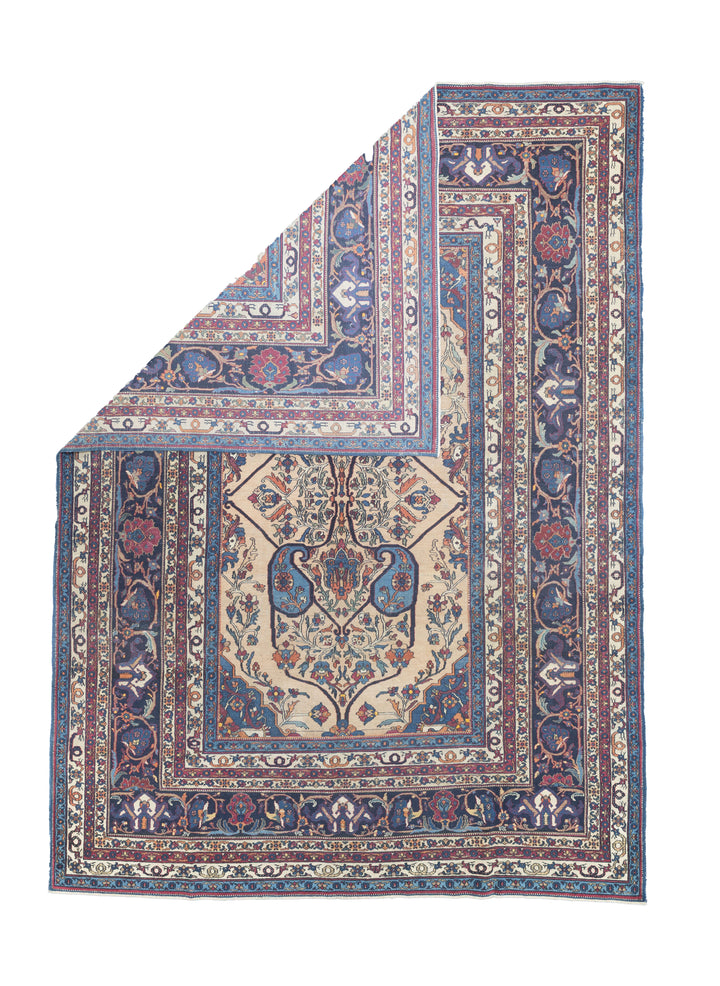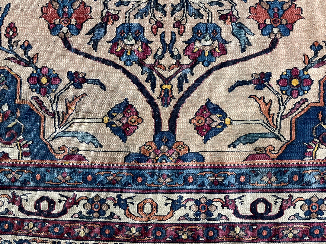 The urban rugs made in the enormous NE Persian province (see also Meshed), with repeating patterns, long carpet formats (kellegis), soft wool, jufti knots (knots on four warps) and cochineal as a red source. Few early scatters and no room sizes. Basically 18th –early 20th centuries. Medium weaves. Medium to expensive. See also Herati.