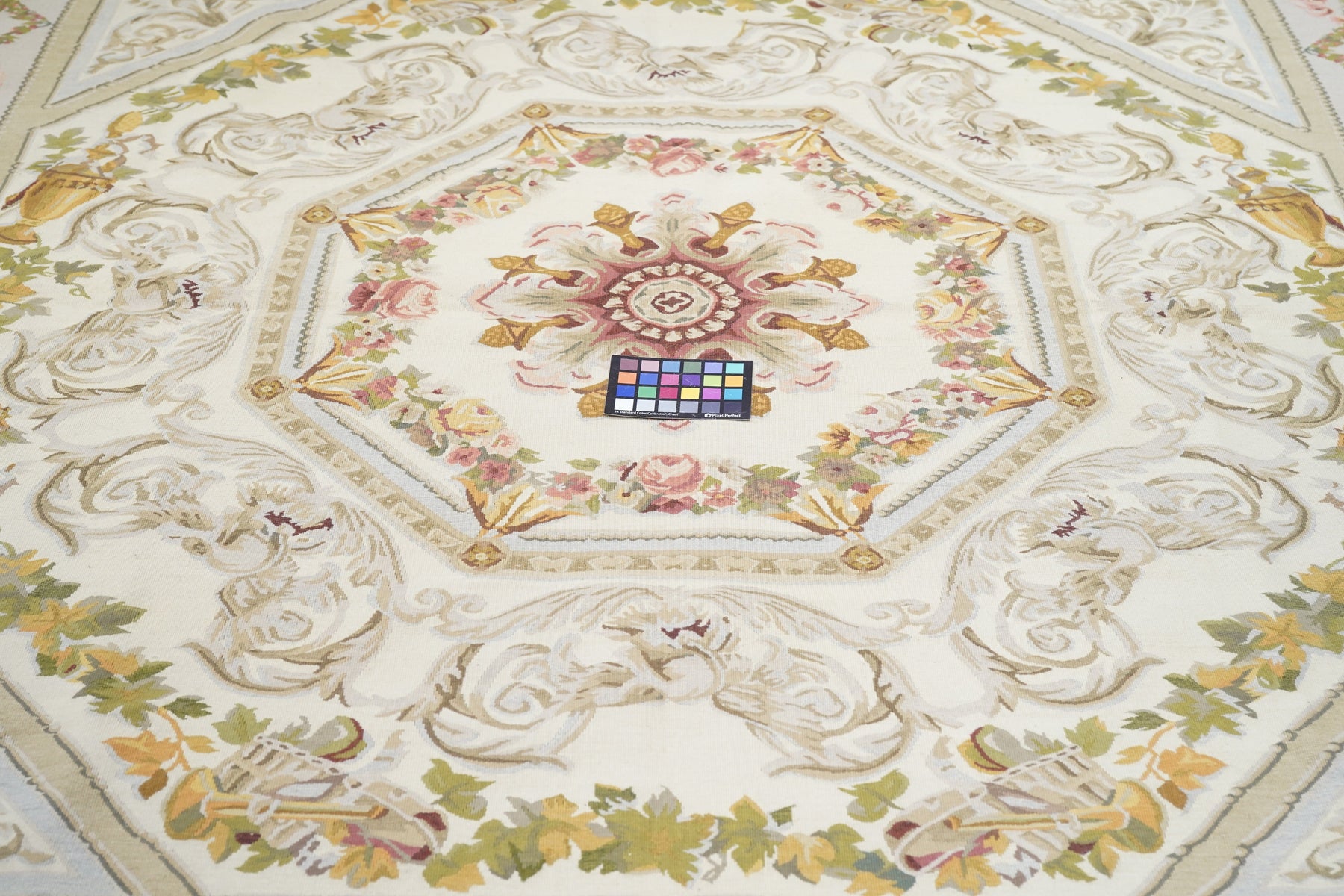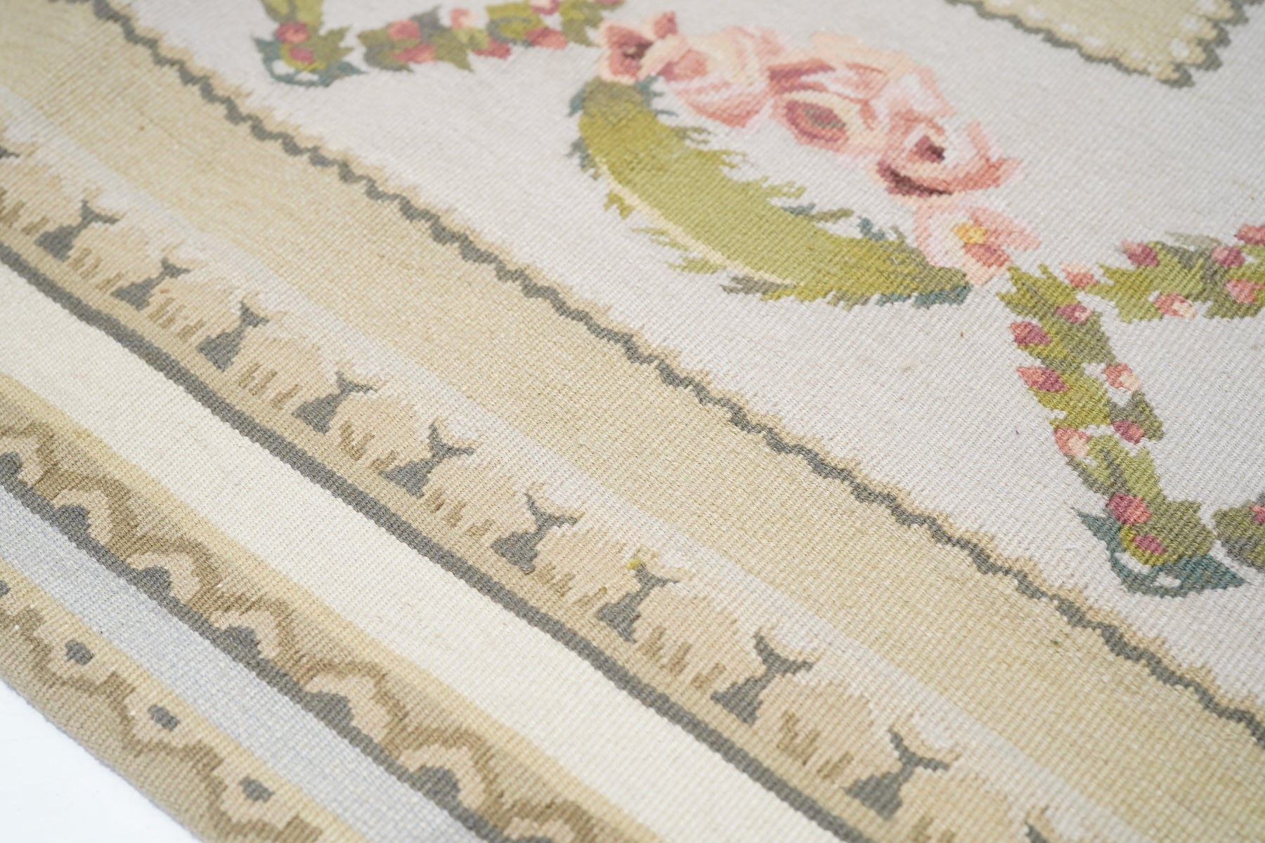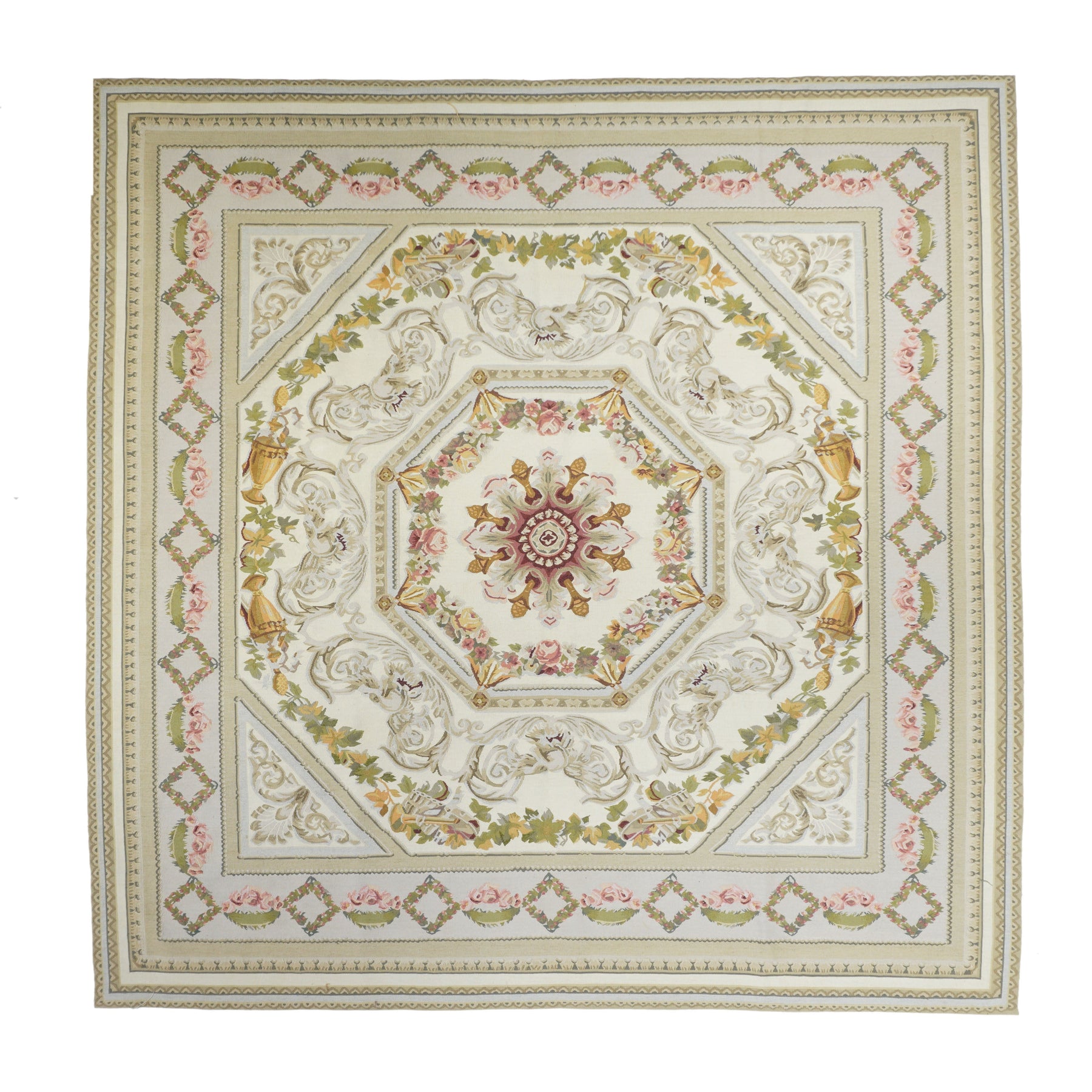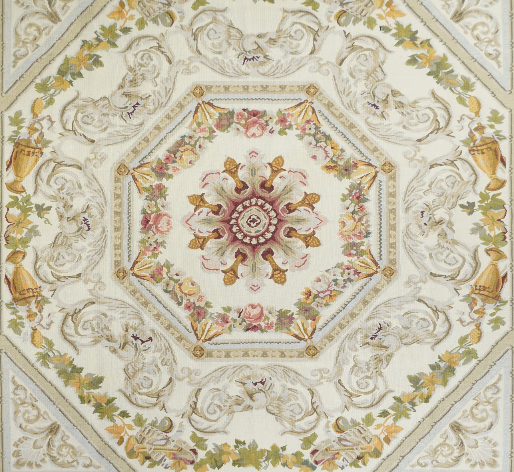 Refers generally to recent carpets in tapestry technique and inspired by French Aubusson designs of the 18th and later centuries. Geometric or semi-floral. Scatters to room sizes. Recent pieces are usually Indian. Wool pattern wefts. Inexpensive to moderate