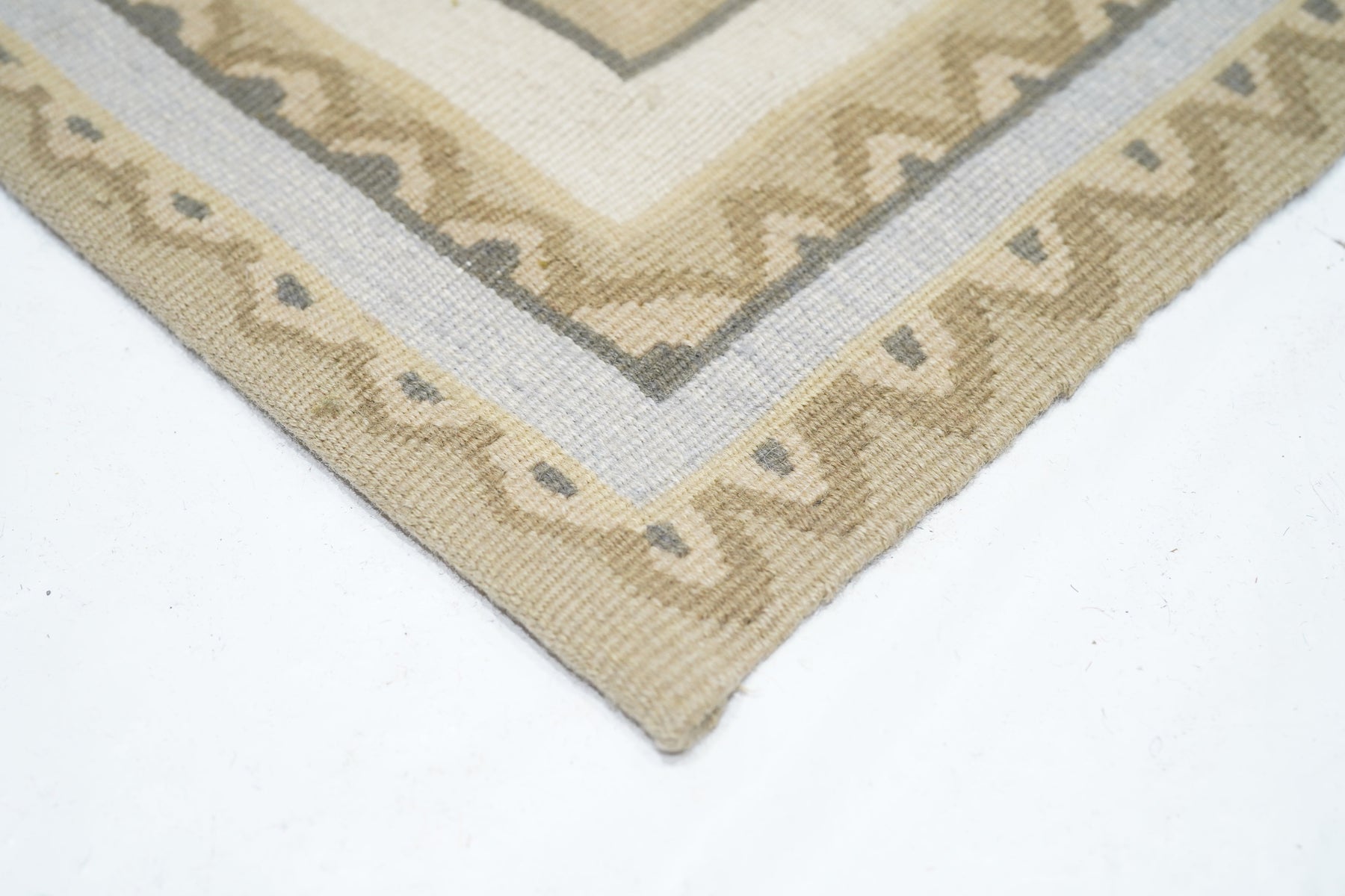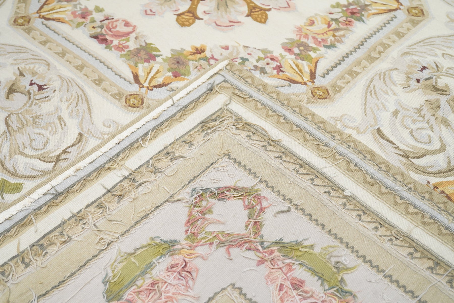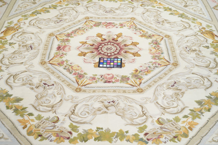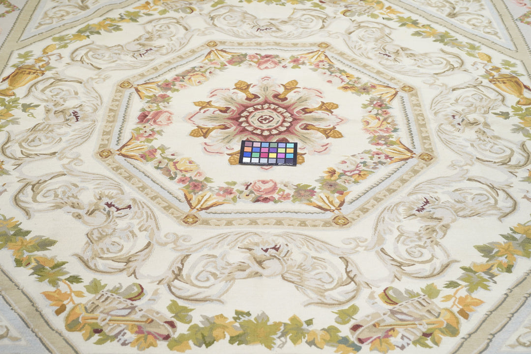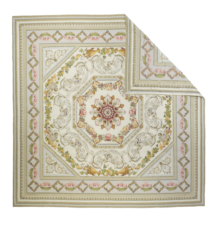 Refers generally to recent carpets in tapestry technique and inspired by French Aubusson designs of the 18th and later centuries. Geometric or semi-floral. Scatters to room sizes. Recent pieces are usually Indian. Wool pattern wefts. Inexpensive to moderate