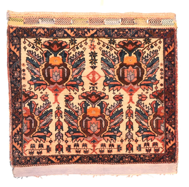 One of a pair of saddlebag (khurdgin) pile face panels, this SE Persian tribal artifact shows two rows of a giant petal palmette pattern on an old ivory ground, with accents in red, teal, rose, green, goldenrod and medium blue, with chains of small stars or flowers in between and simple carnations or hyacinth sprays at one end. Navy reversing fan palmette border and intact weft-patterned closure tabs. Good condition, moderate weave. Bold drawing in a small format.