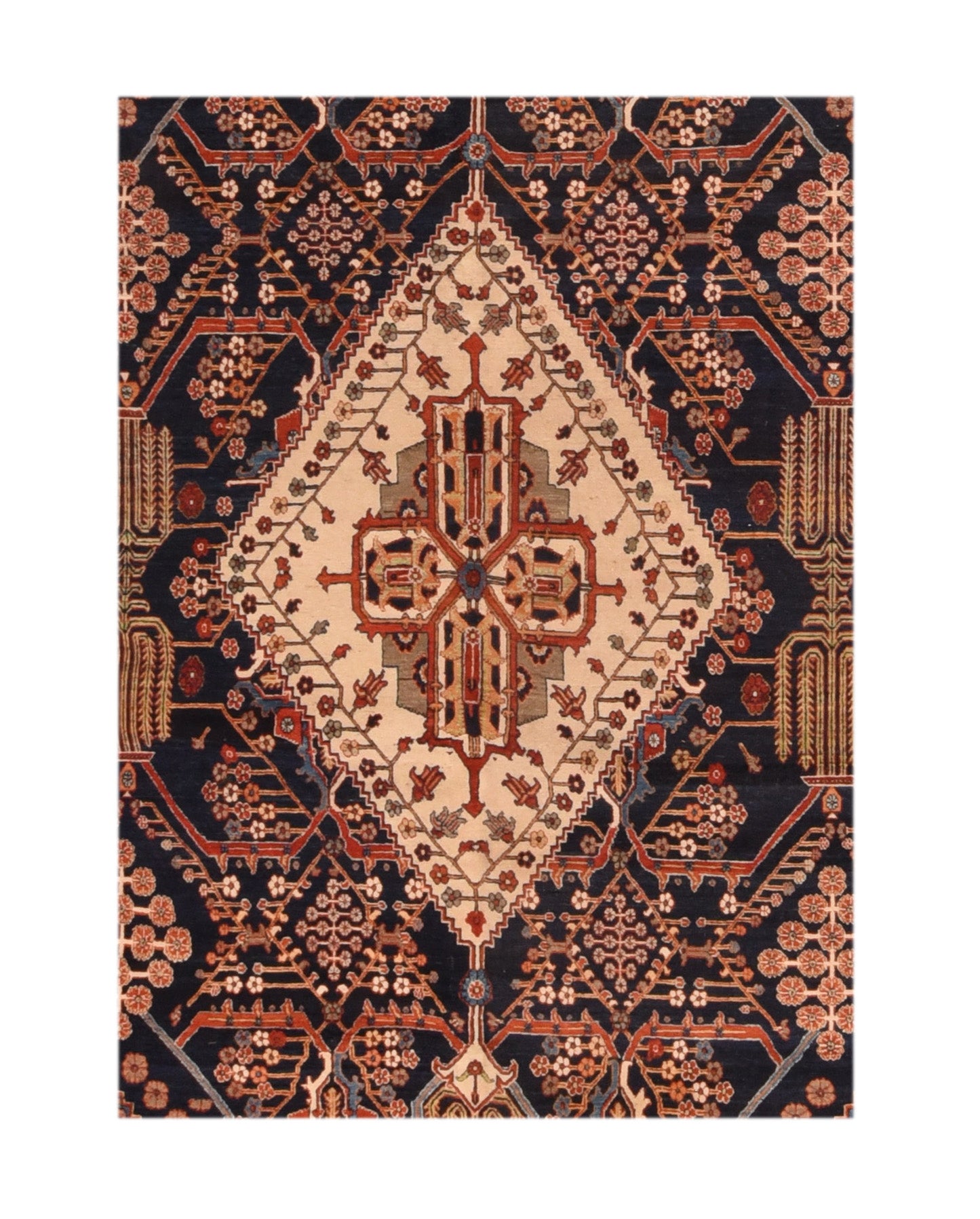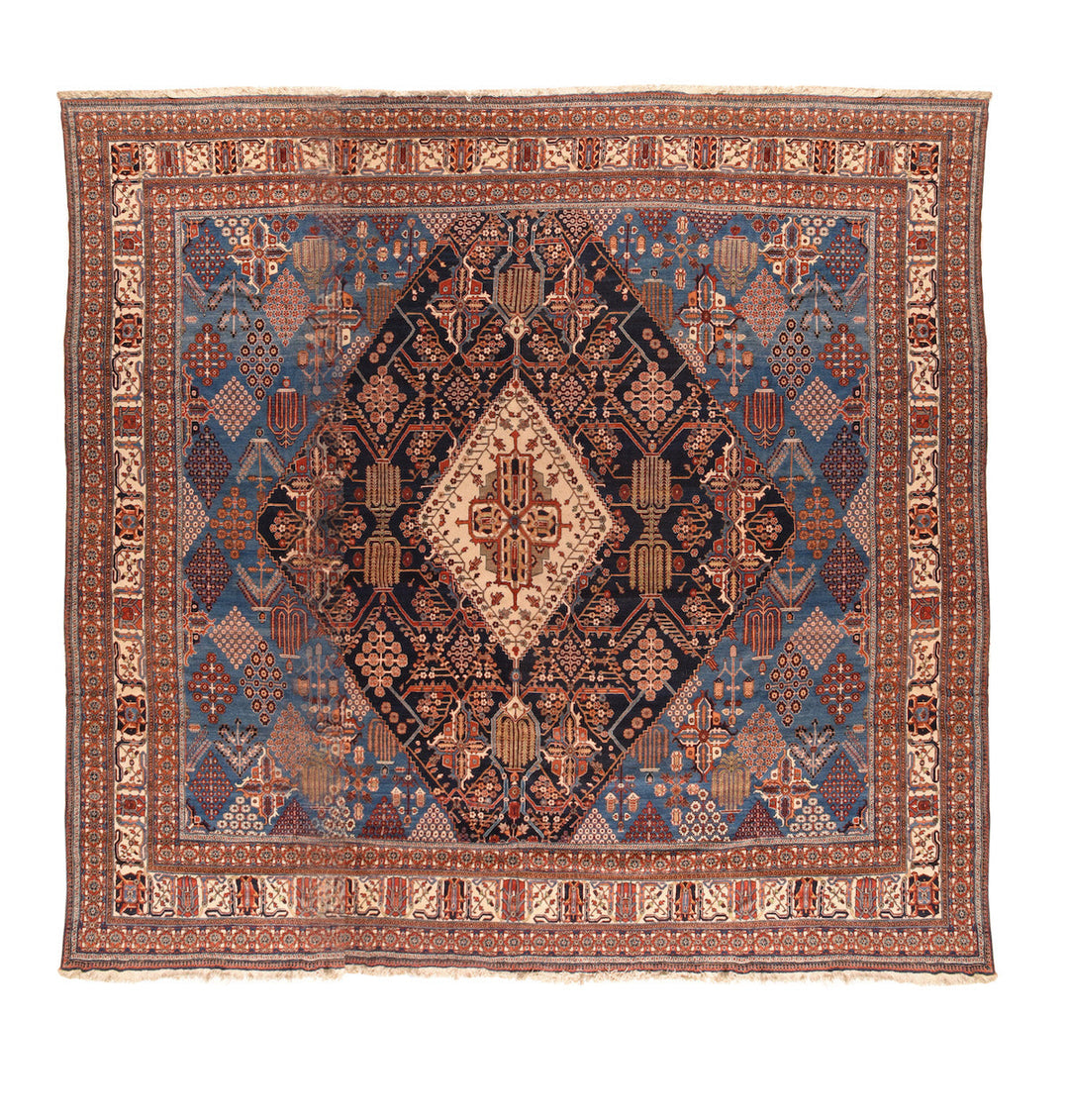 In the uniquely characteristic Joshagan style, but in a rare format, with a cerulean field supporting a navy sub-field, both with uniformly lozengoidal weeping willows, floret arrays and cruciform motives. Central ivory medallion with internal floret fringe. Cream main border with square palmettes and right-angle bent leaves. Medium urban Central Persian weaver. Good condition.