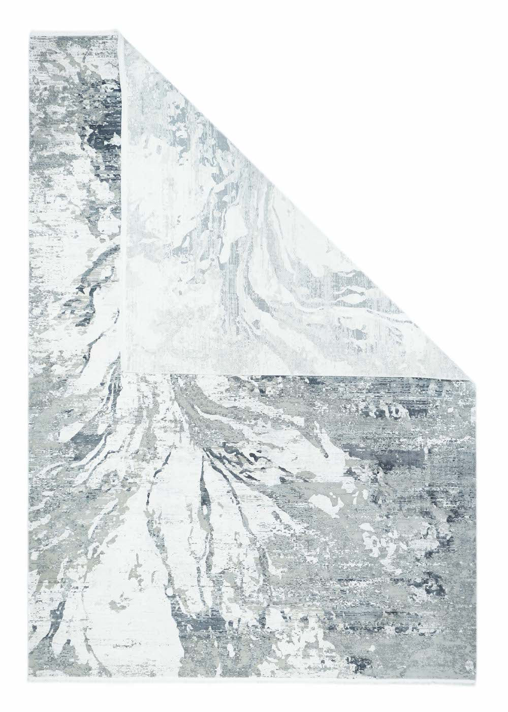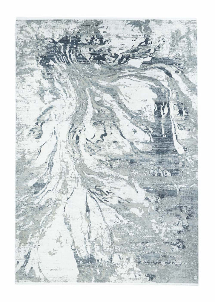 The browns, grey and creams all flow in a viscous manner across this small Contempo carpet. From top left outward, or toward a lower area ("drain"). Or it is multiple splashes on a manipulated surface. Works well with Contempo furniture and airy spaces. Wool and silk pile, on cotton, moderate weave. As new condition. From India, new condition.