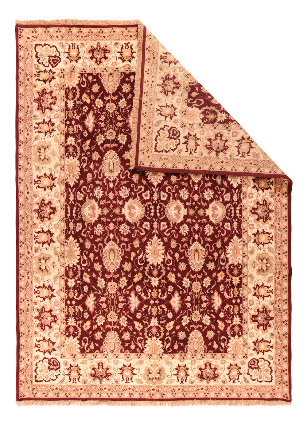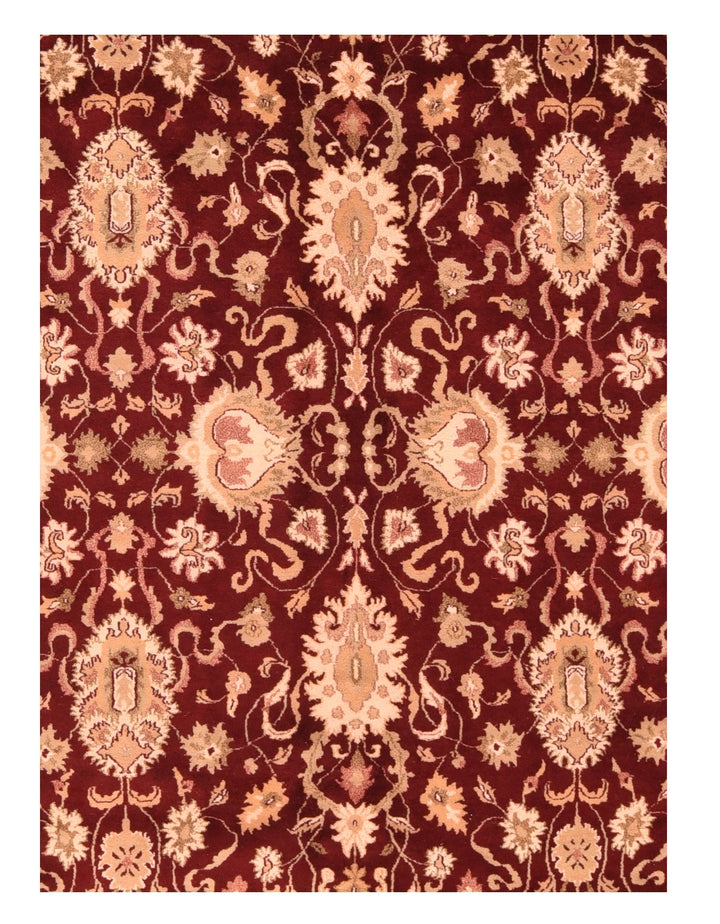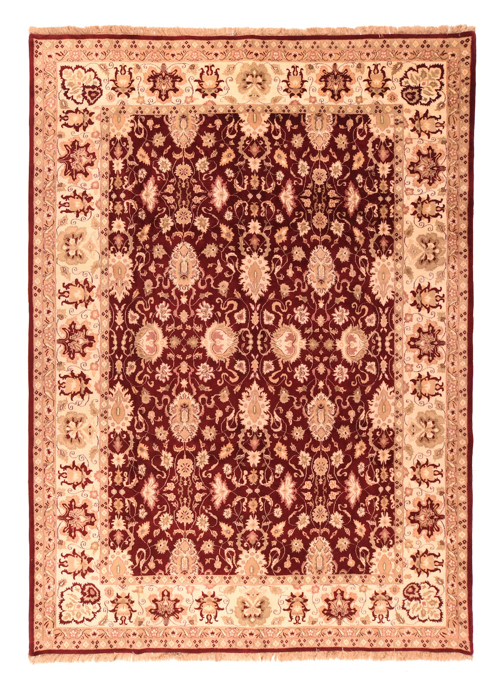 The rich chocolate field presents three horizontal rows of lazy and upright torn palmettes across the center with single rows of fractional palmettes at the ends, with serpentine cloud bands along with slender vinery and ragged lotus leaves. Cream border with chocolate accented lobed and petal palmettes. Medium-fine urban weave. Cotton foundation.