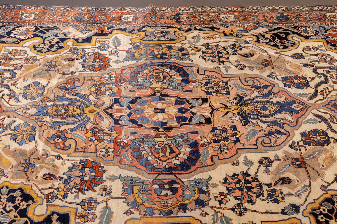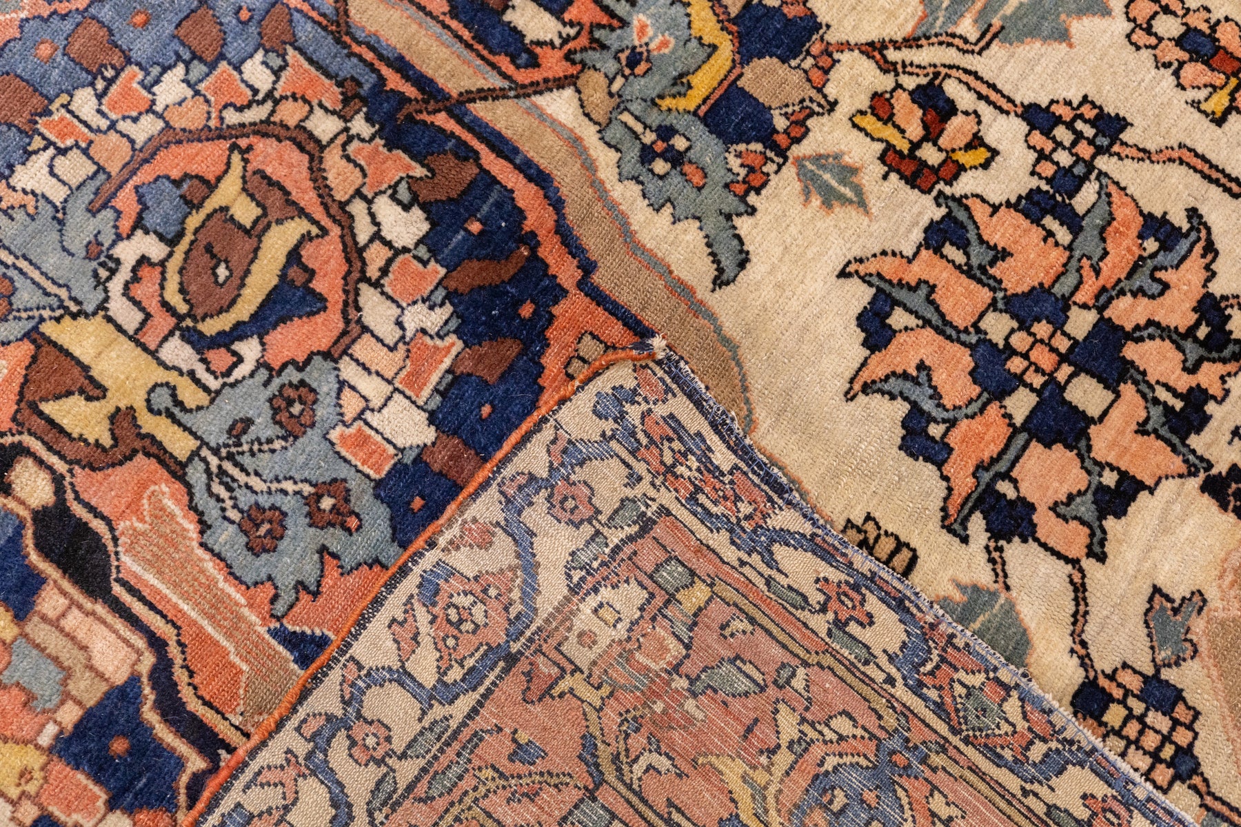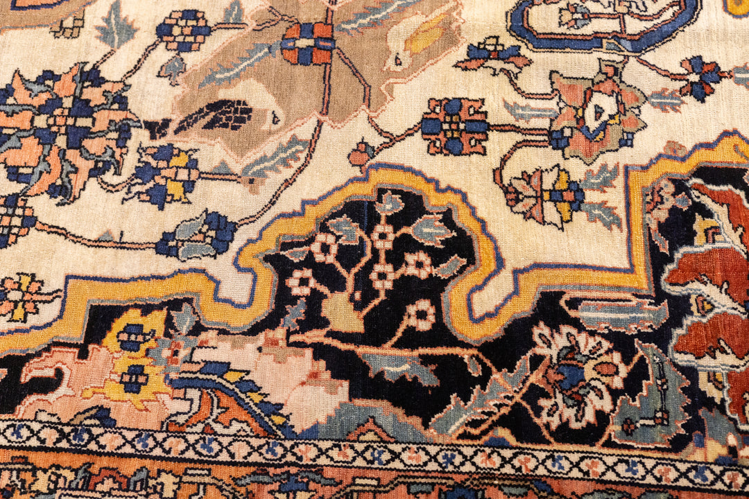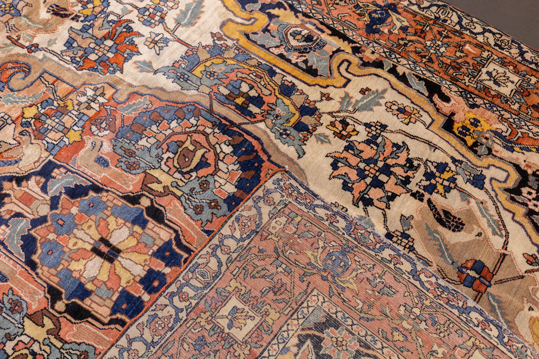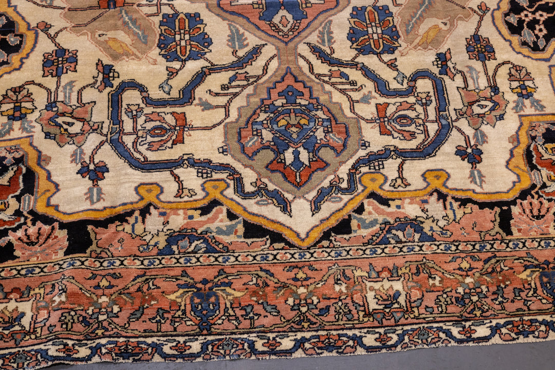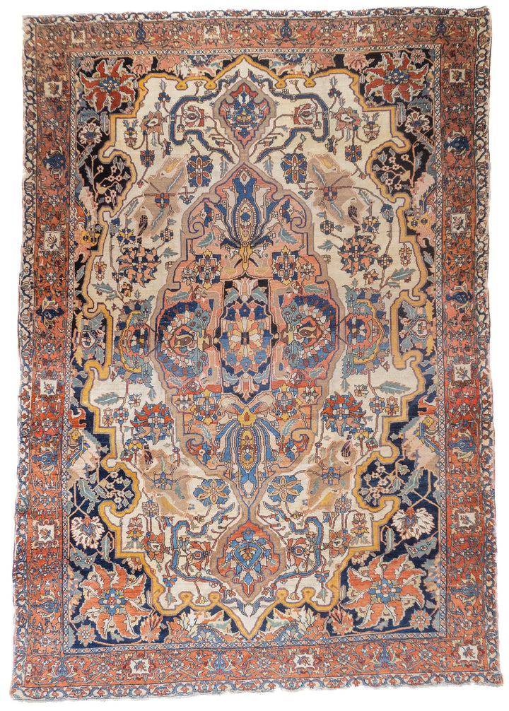 The scatter and room size pieces made in the Arak/Sultanabad area, between 1880 and 1910, with firm and leathery well-woven textures, and strong in red, navy and ecru tones, usually in medallion formats. A transition group between the earlier 19th century Farahans and the post-WWI Sarouks. Drawing is between curvilinear and angular.