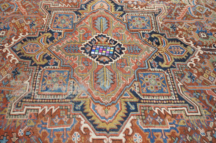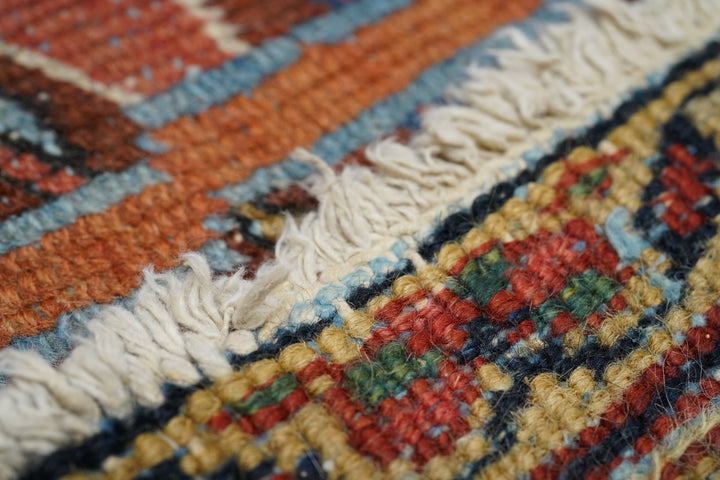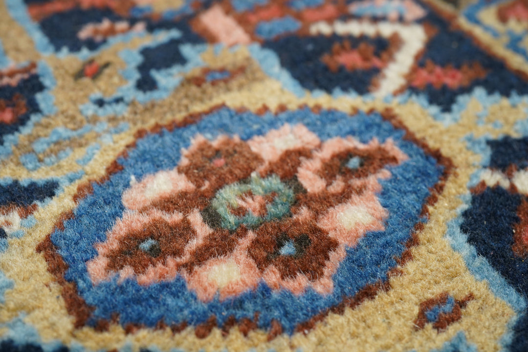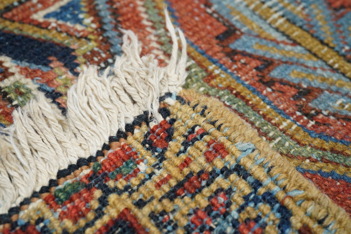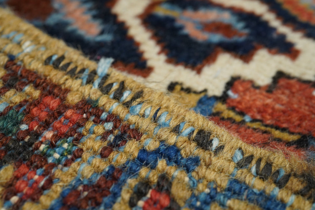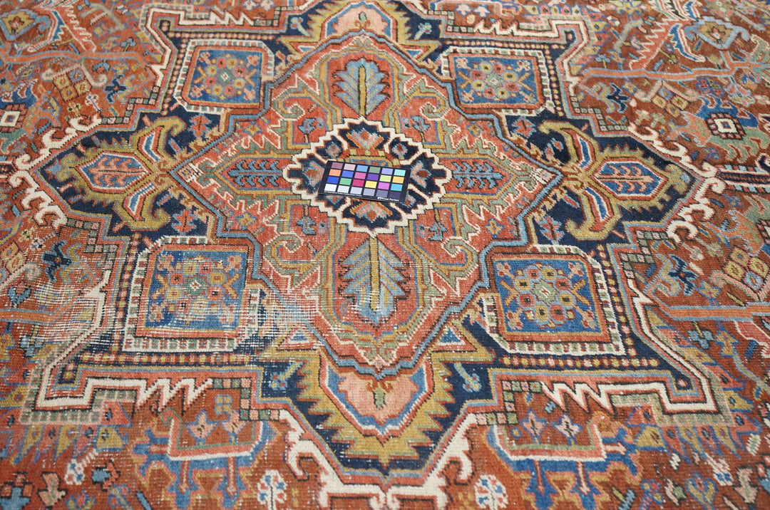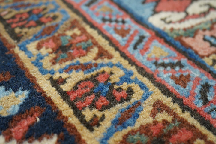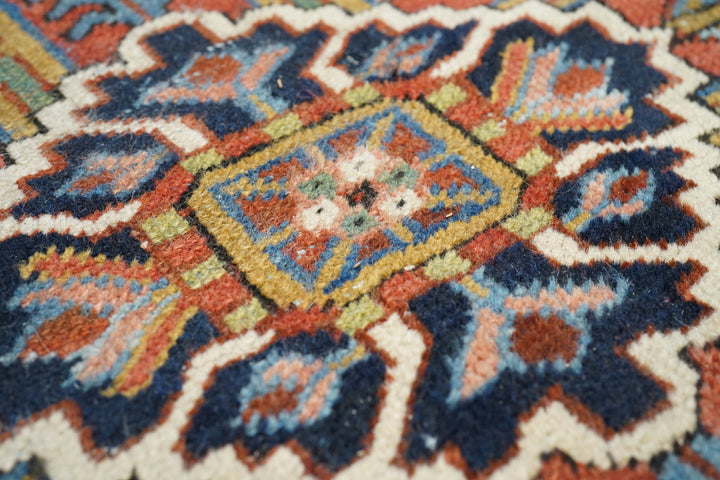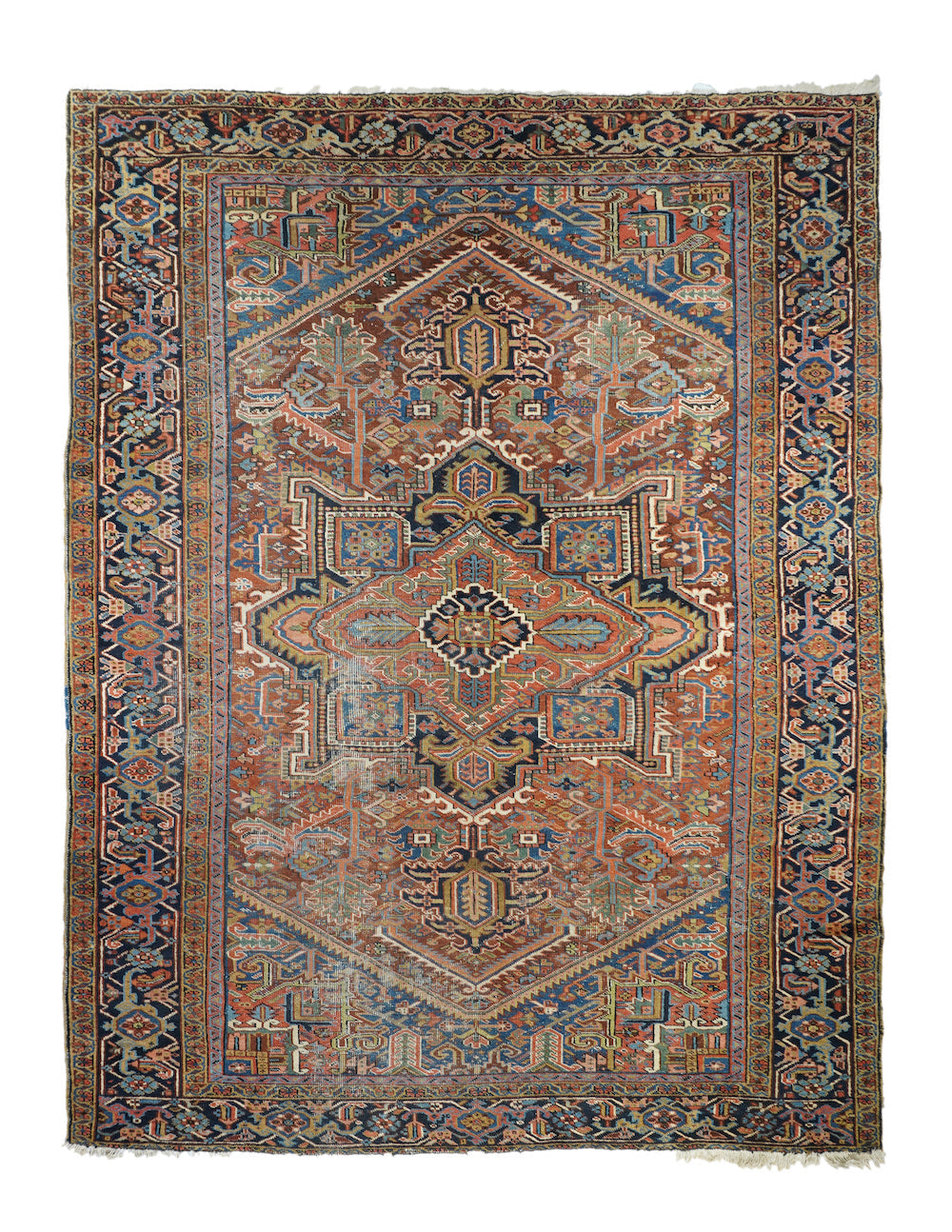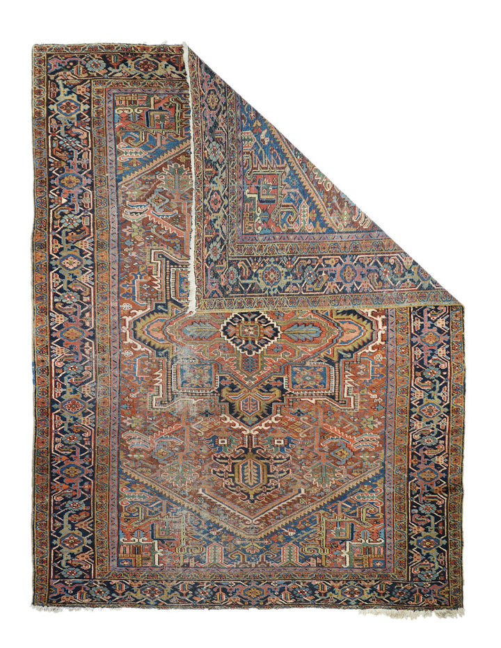 Moderately woven on cotton, this interwar NW Persian village carpet features a red field well-filled with a navy octogramme medallion, ragged palmette pendants, and various semi-geometric devices. Saw teeth and micro-stepping are very much in evidence as outlines. Navy strip-style border with reversing turtles. One end visibly reduced. Otherwise good condition.