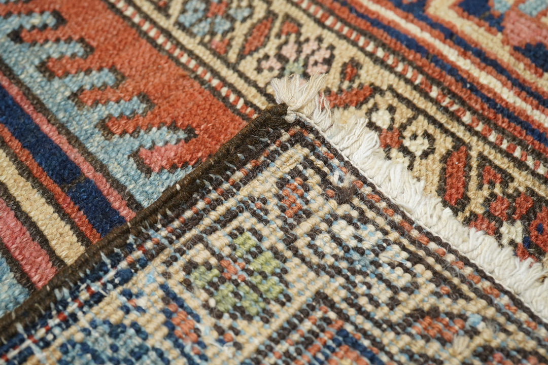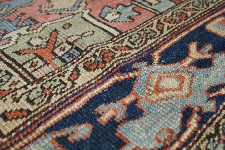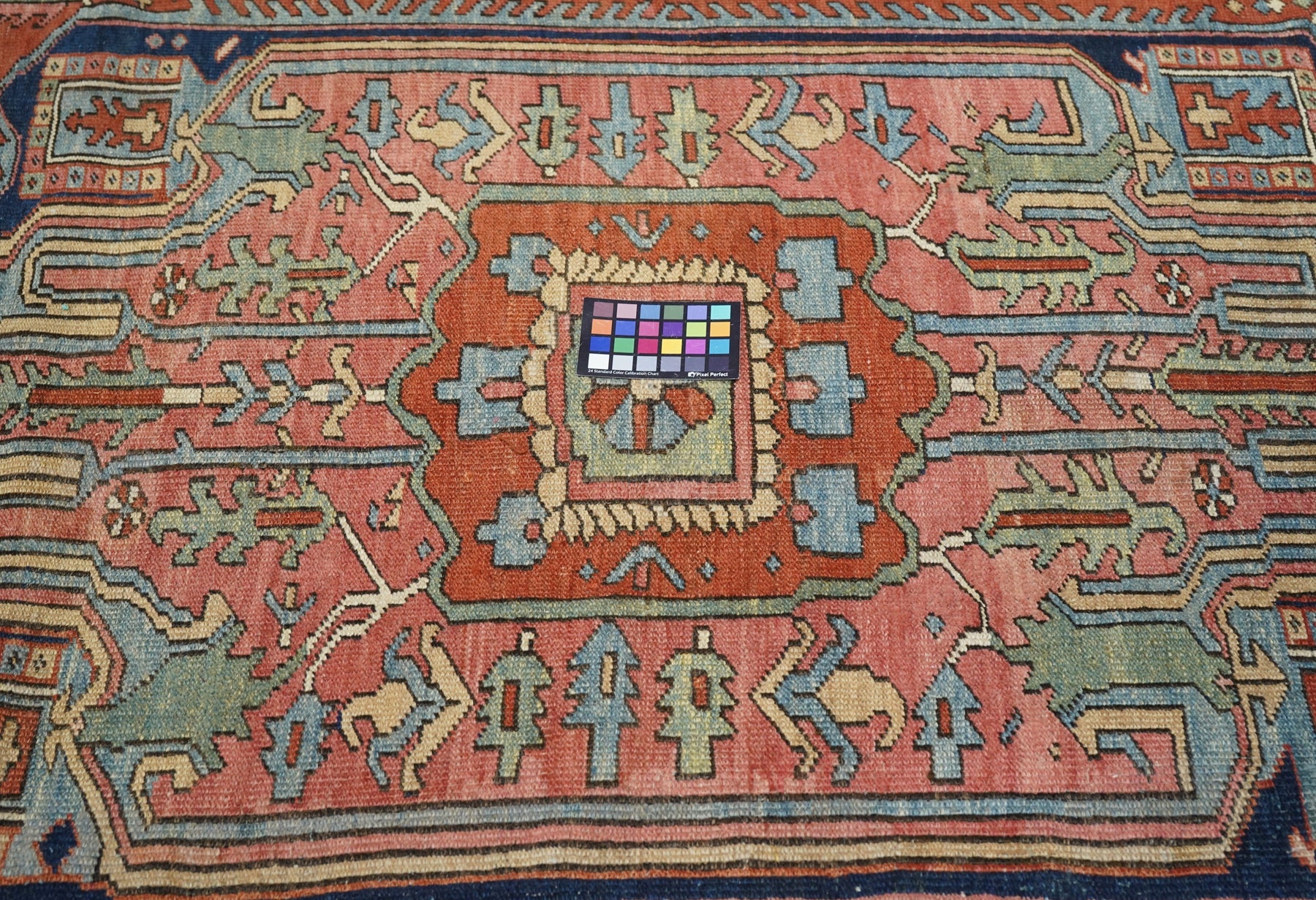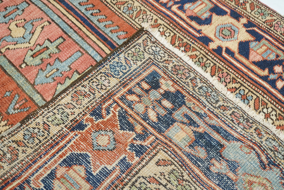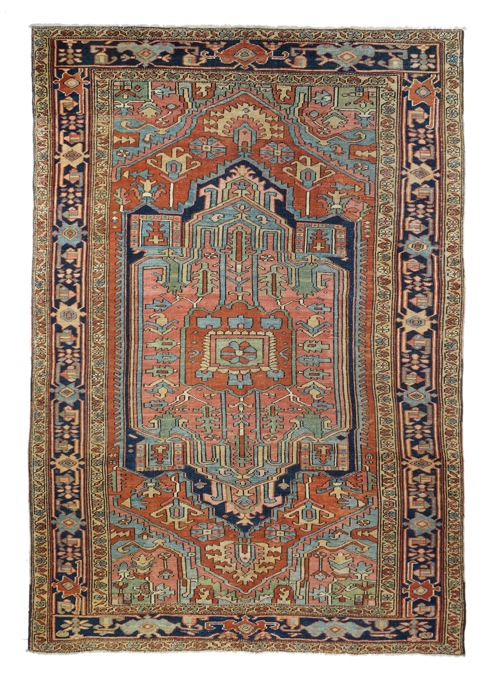 This coarse/moderate Persian-format carpet shows a warm madder rust/red field overlaid by a navy and abrashed rose cartouche medallion with a central red panel. Stylized flowers in various sizes. Pink and light blue corners. Navy strip style main border with small turtloid motives joining stiff vinery and arrays of loose petals. Hairline reduction at one end. Soft straw yellow. Good condition.
