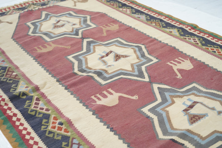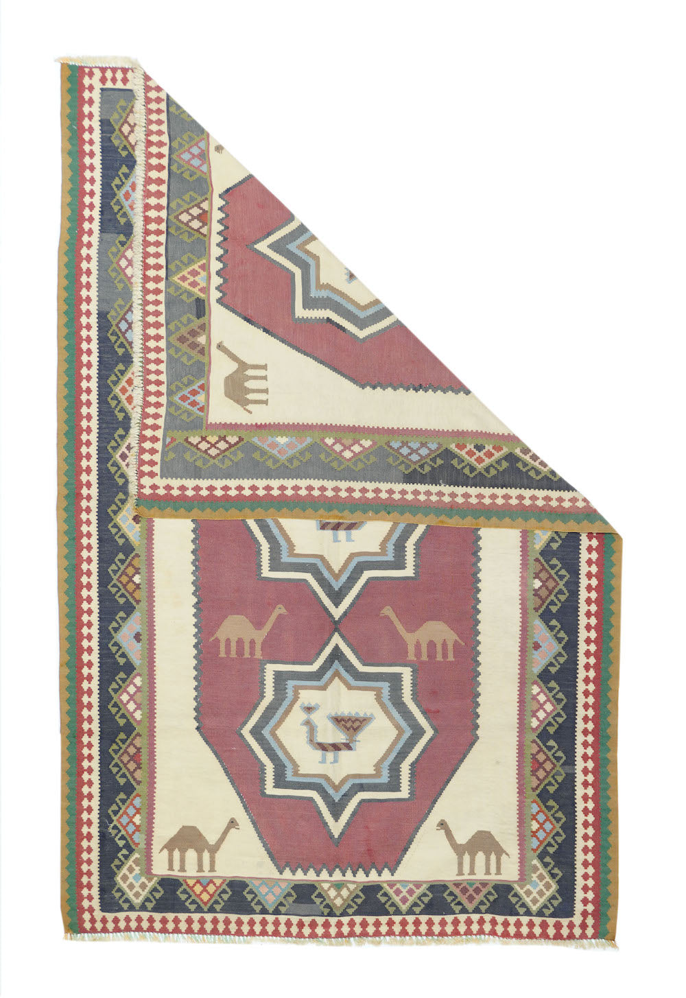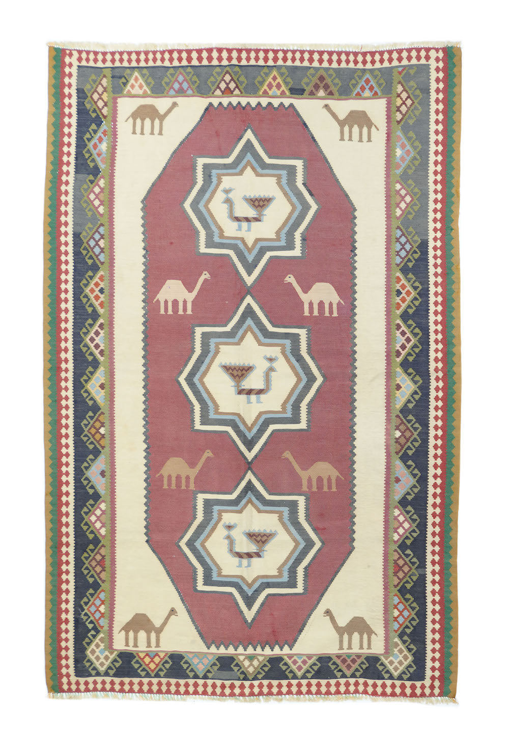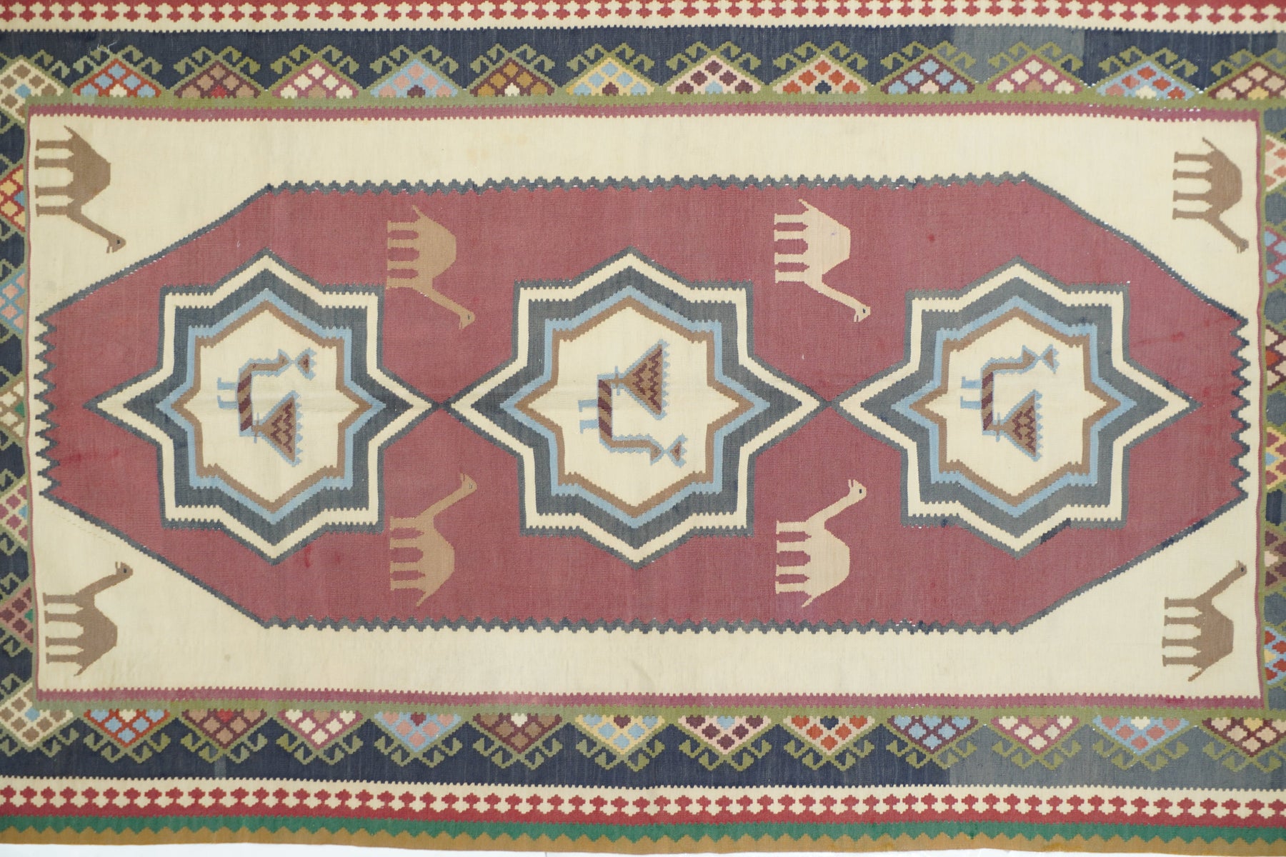 This vintage southwest Persian kilim shows a cream field with four corner dromedaries, enclosing as tall red octagonal sub-field in which are three nested octogrammes with revering peacocks. More dinosaur-like dromedaries in the red central panel. Dark blue main border with a hooked triangle reciprocal pattern. Notable end reduction. Vintage. Good condition.