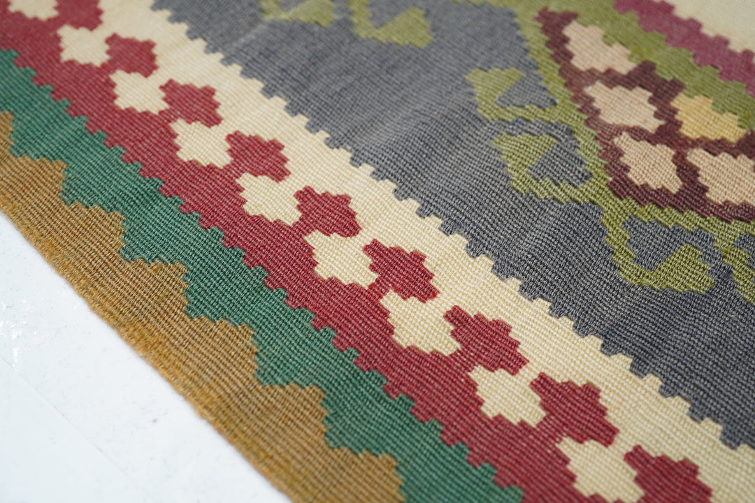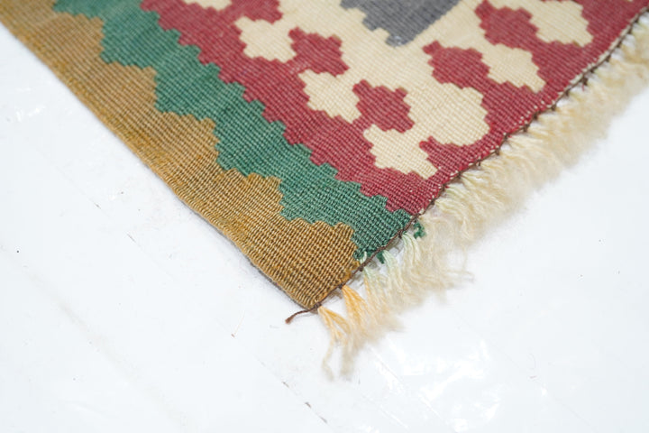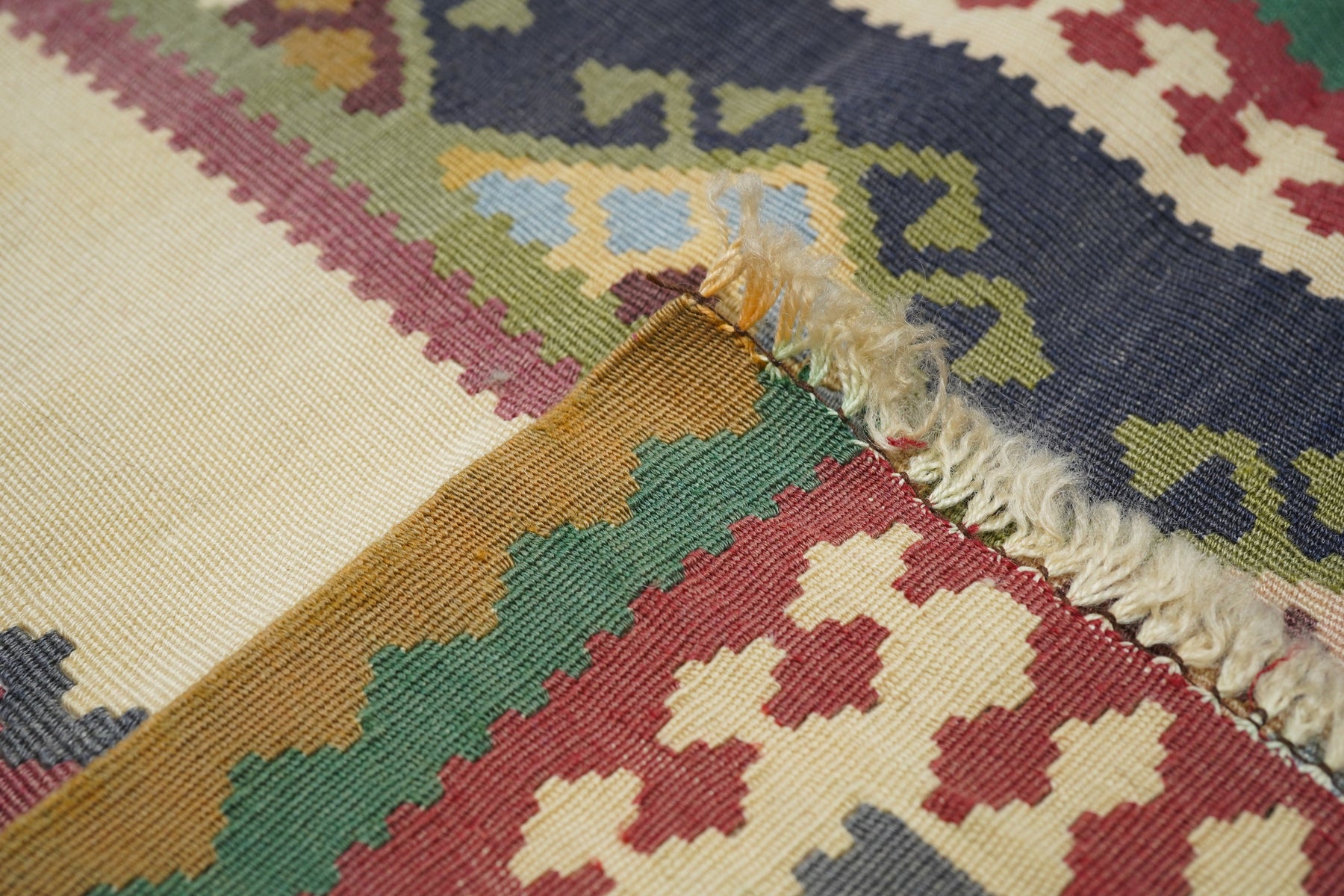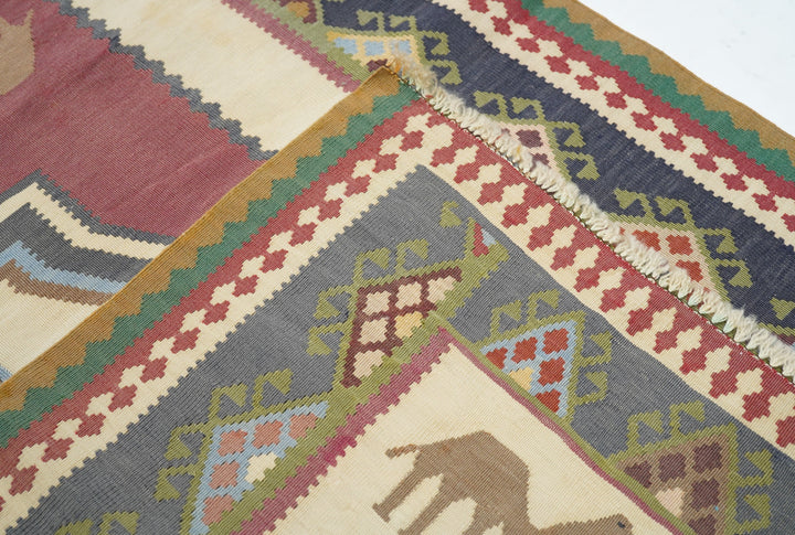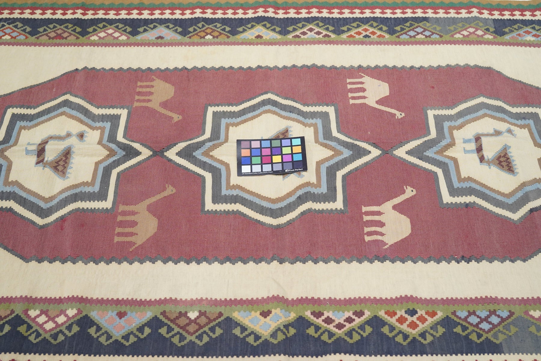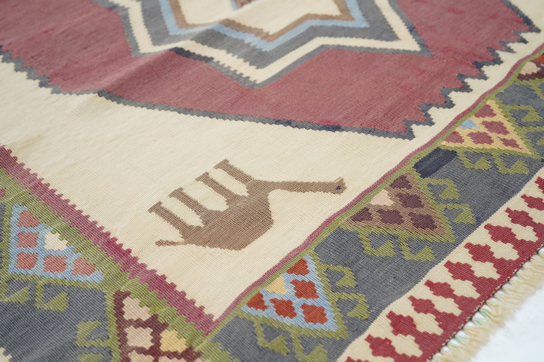 This vintage southwest Persian kilim shows a cream field with four corner dromedaries, enclosing as tall red octagonal sub-field in which are three nested octogrammes with revering peacocks. More dinosaur-like dromedaries in the red central panel. Dark blue main border with a hooked triangle reciprocal pattern. Notable end reduction. Vintage. Good condition.