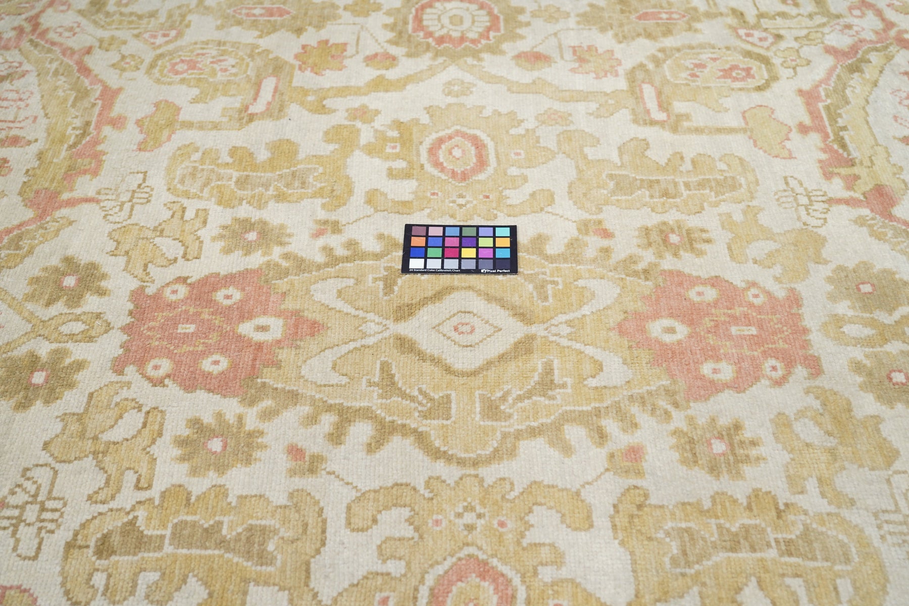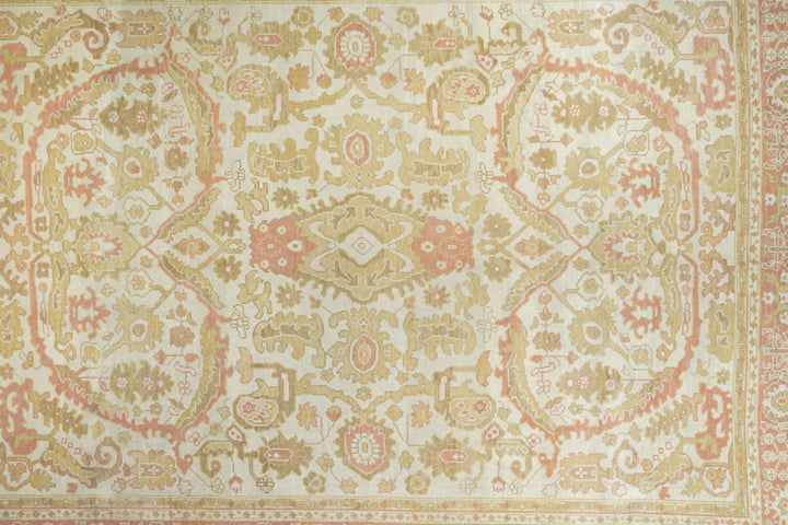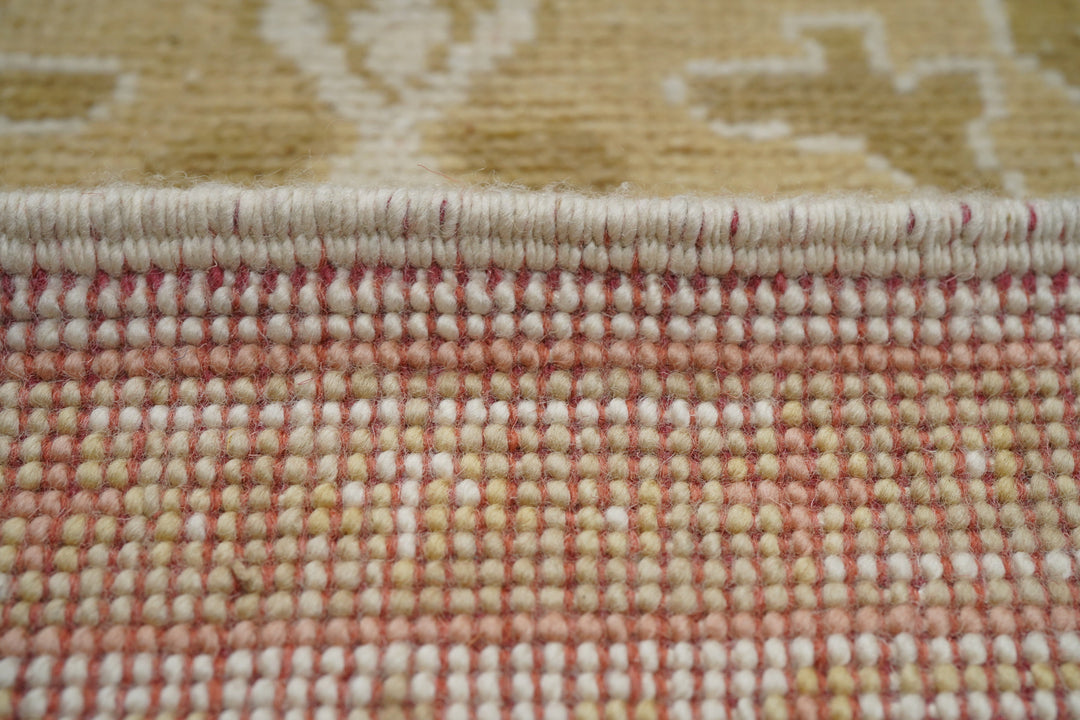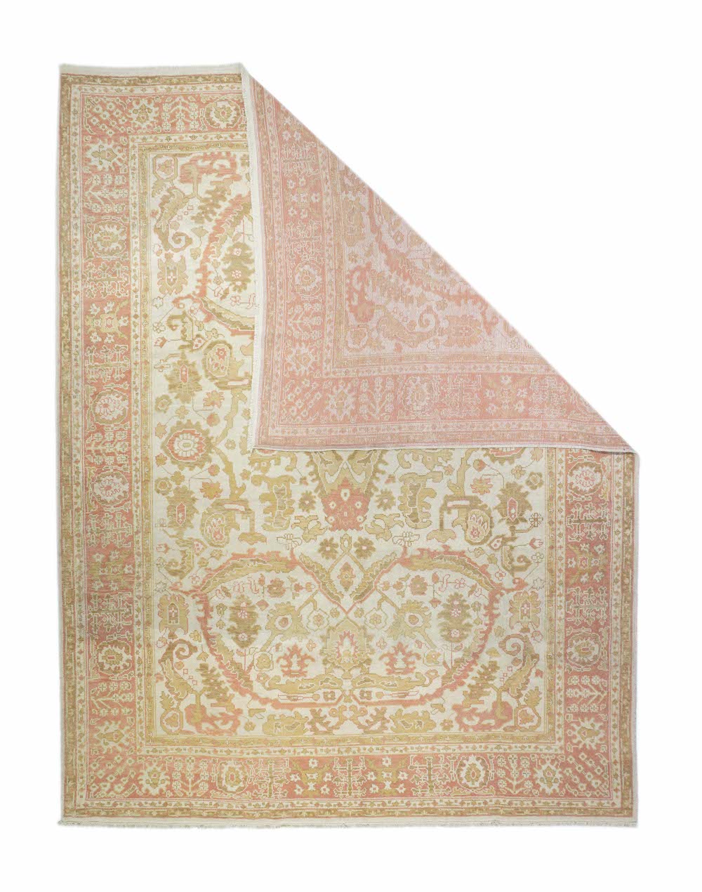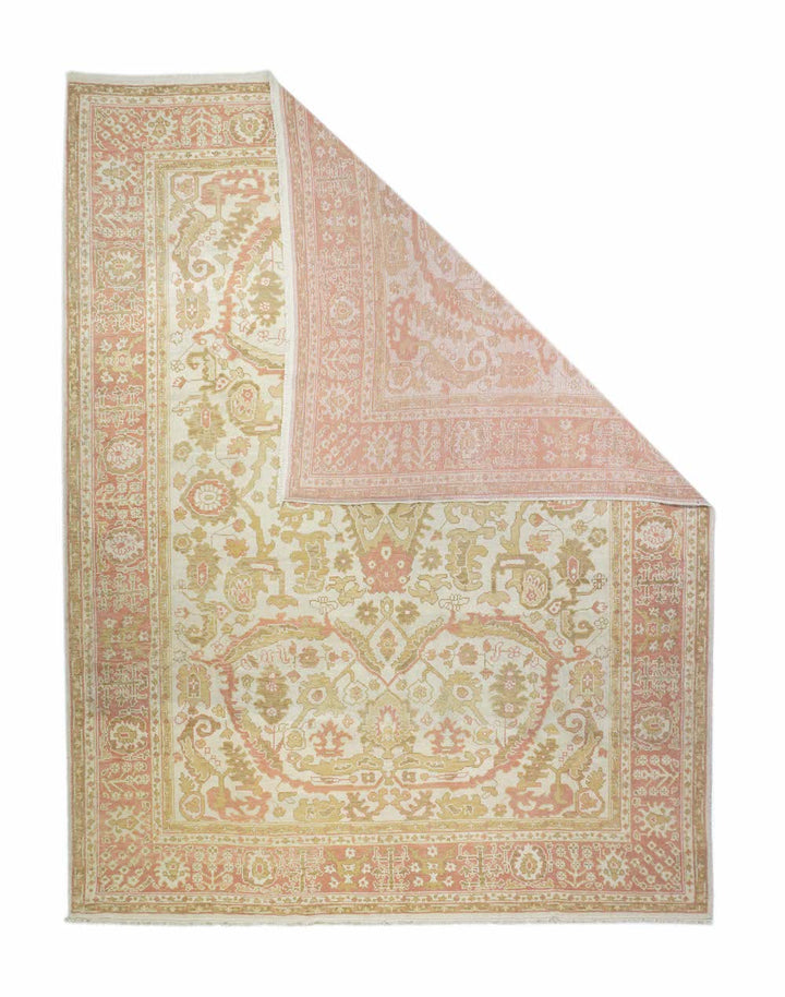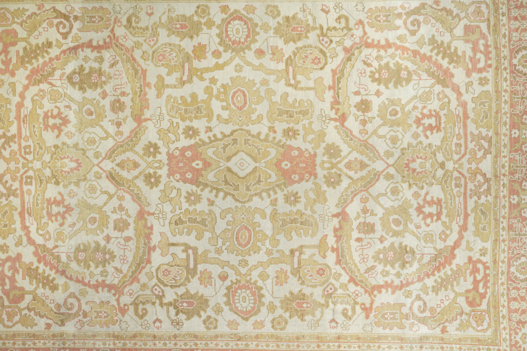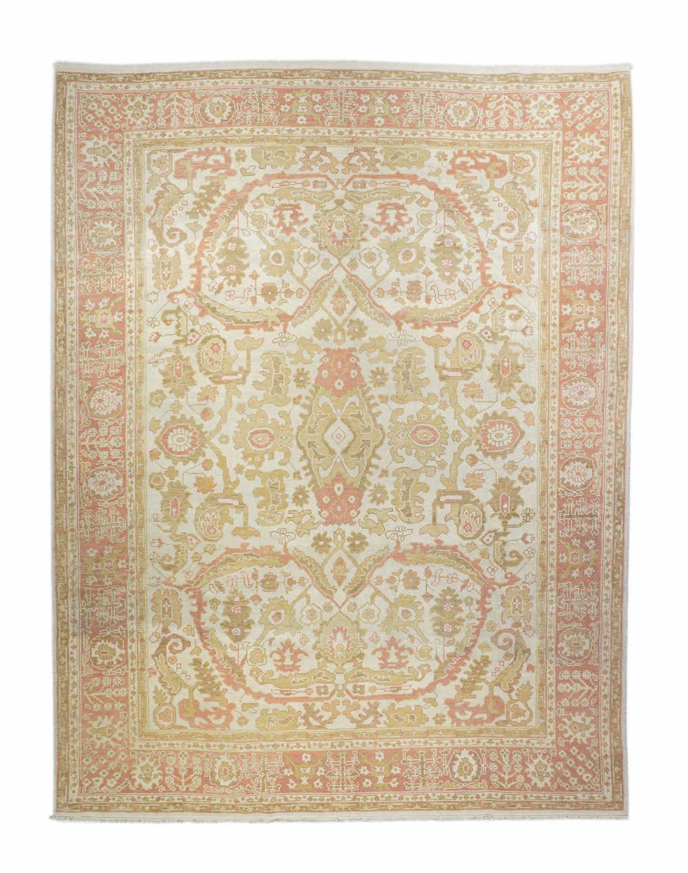 This coarsely woven modern west Anatolian room size shows a dominating Pair of open, ragged leaf-defined truncated cardi form arabesques, each with a focal palmette, and both set around a central tall, ragged hexagonal cartouche. A variety of palmettes, leafy arabesques and small floral devices fill in on the warm ecru field. Abrashed coral border with rough palmettes and upright multi bloom flowers. As new condition.