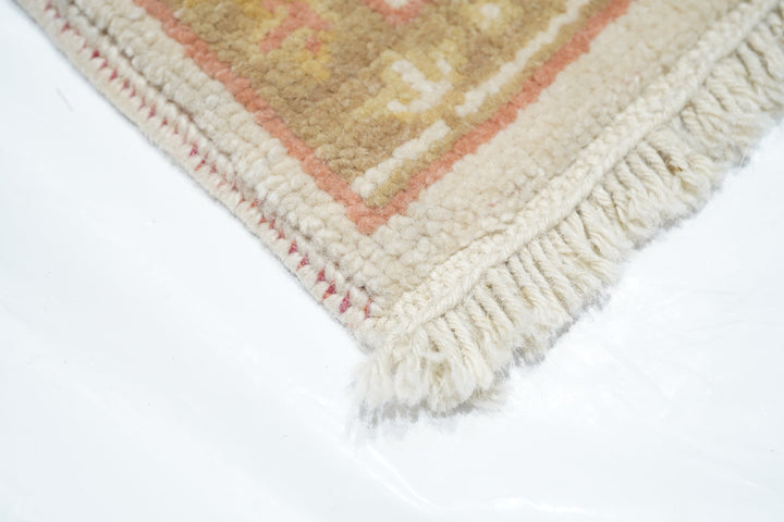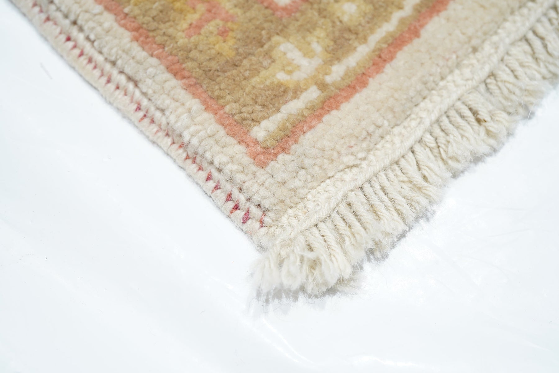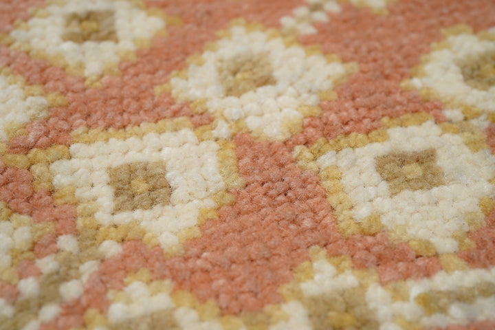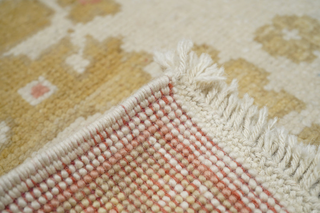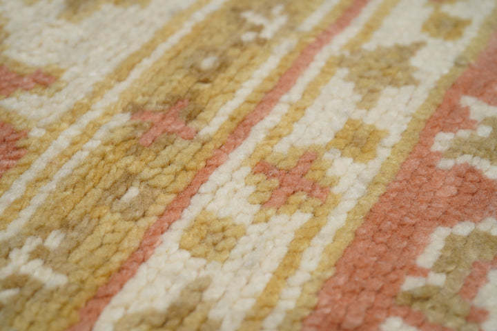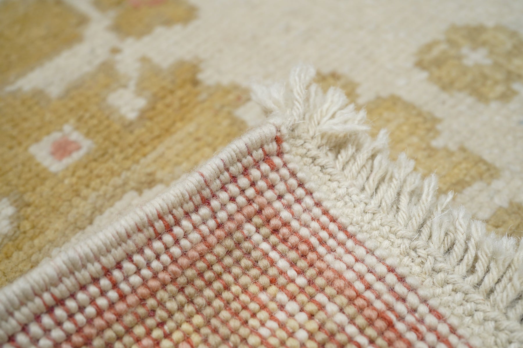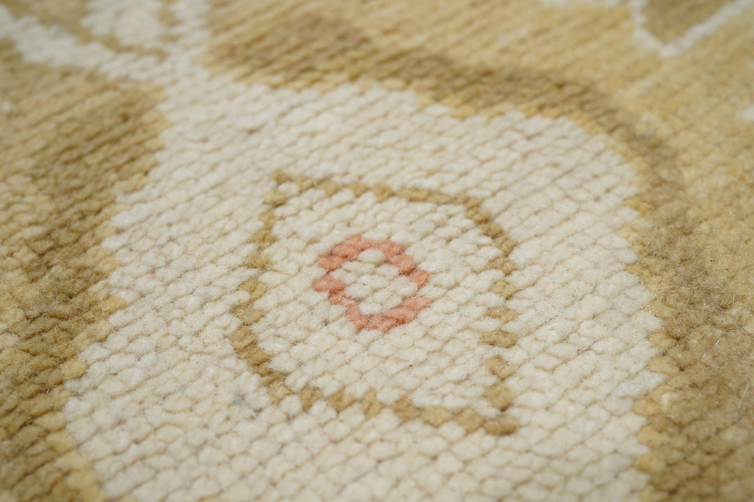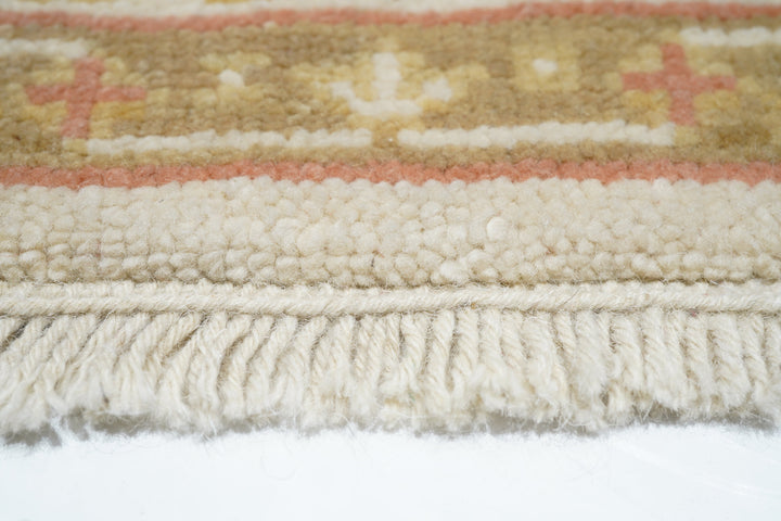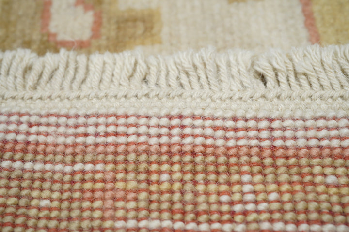 This coarsely woven modern west Anatolian room size shows a dominating Pair of open, ragged leaf-defined truncated cardi form arabesques, each with a focal palmette, and both set around a central tall, ragged hexagonal cartouche. A variety of palmettes, leafy arabesques and small floral devices fill in on the warm ecru field. Abrashed coral border with rough palmettes and upright multi bloom flowers. As new condition.
