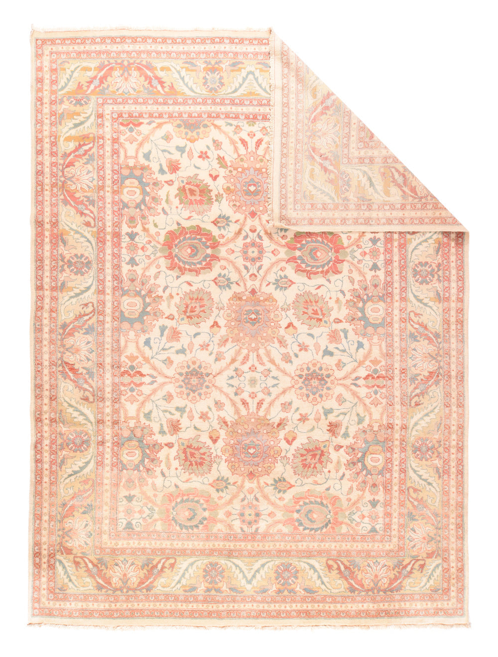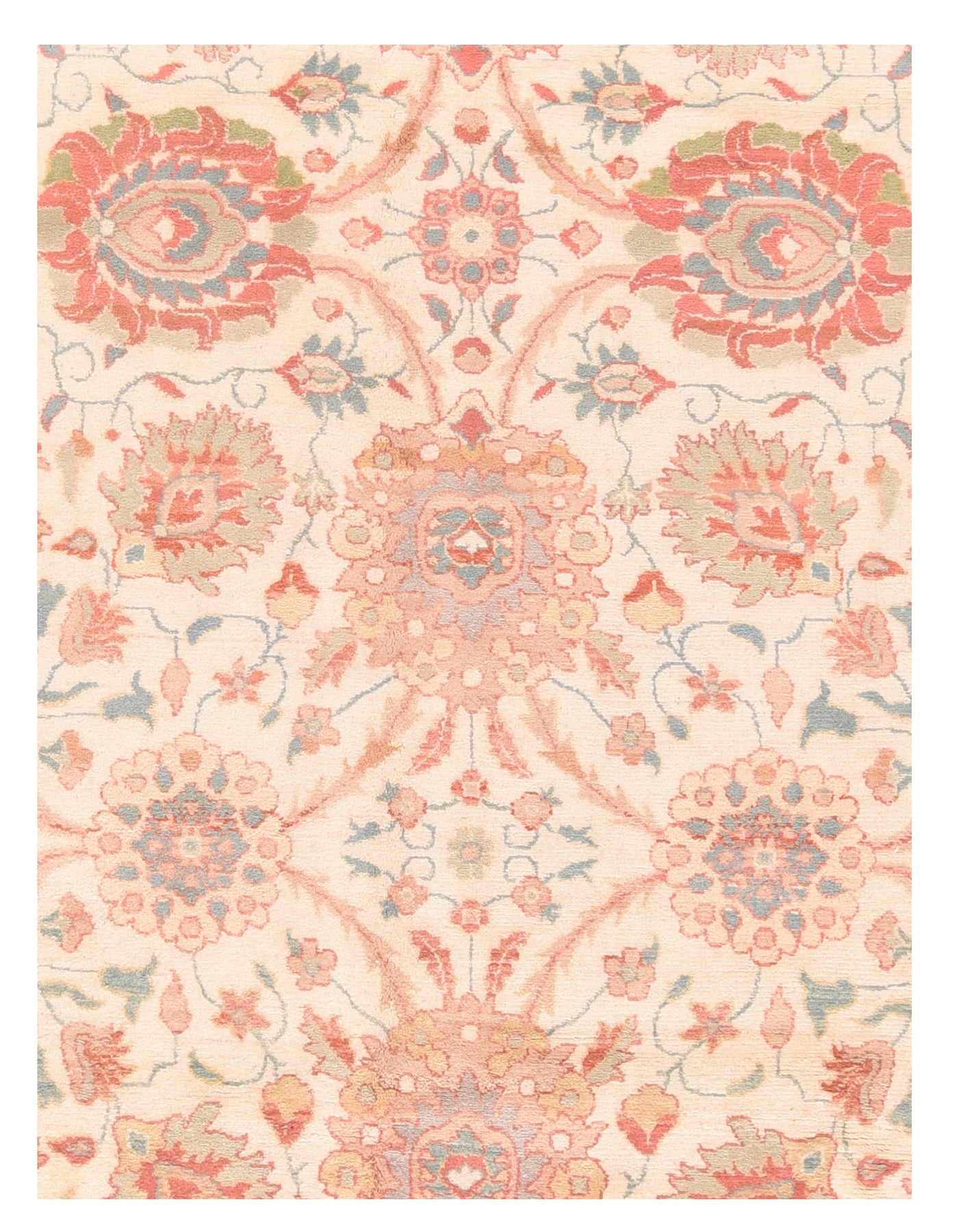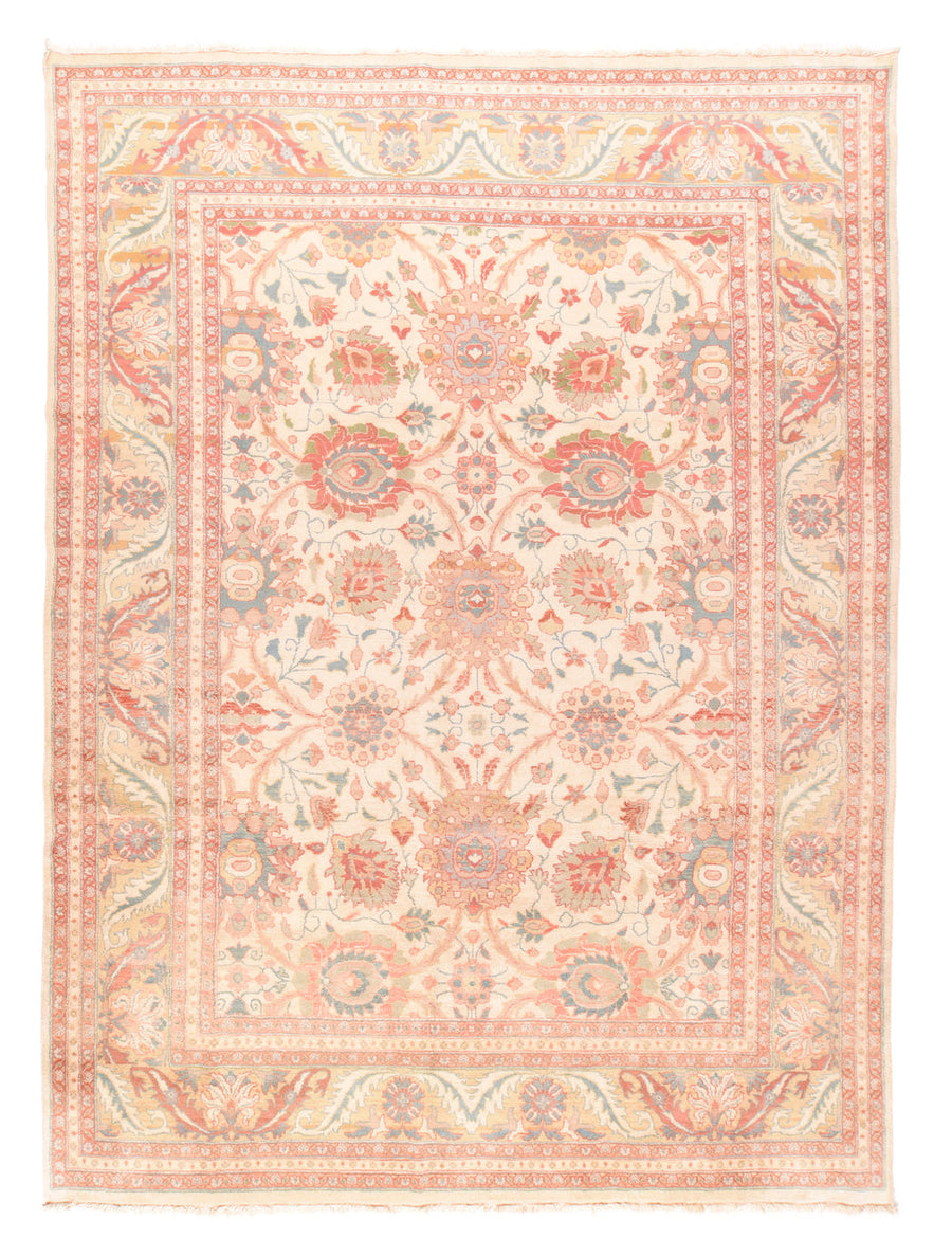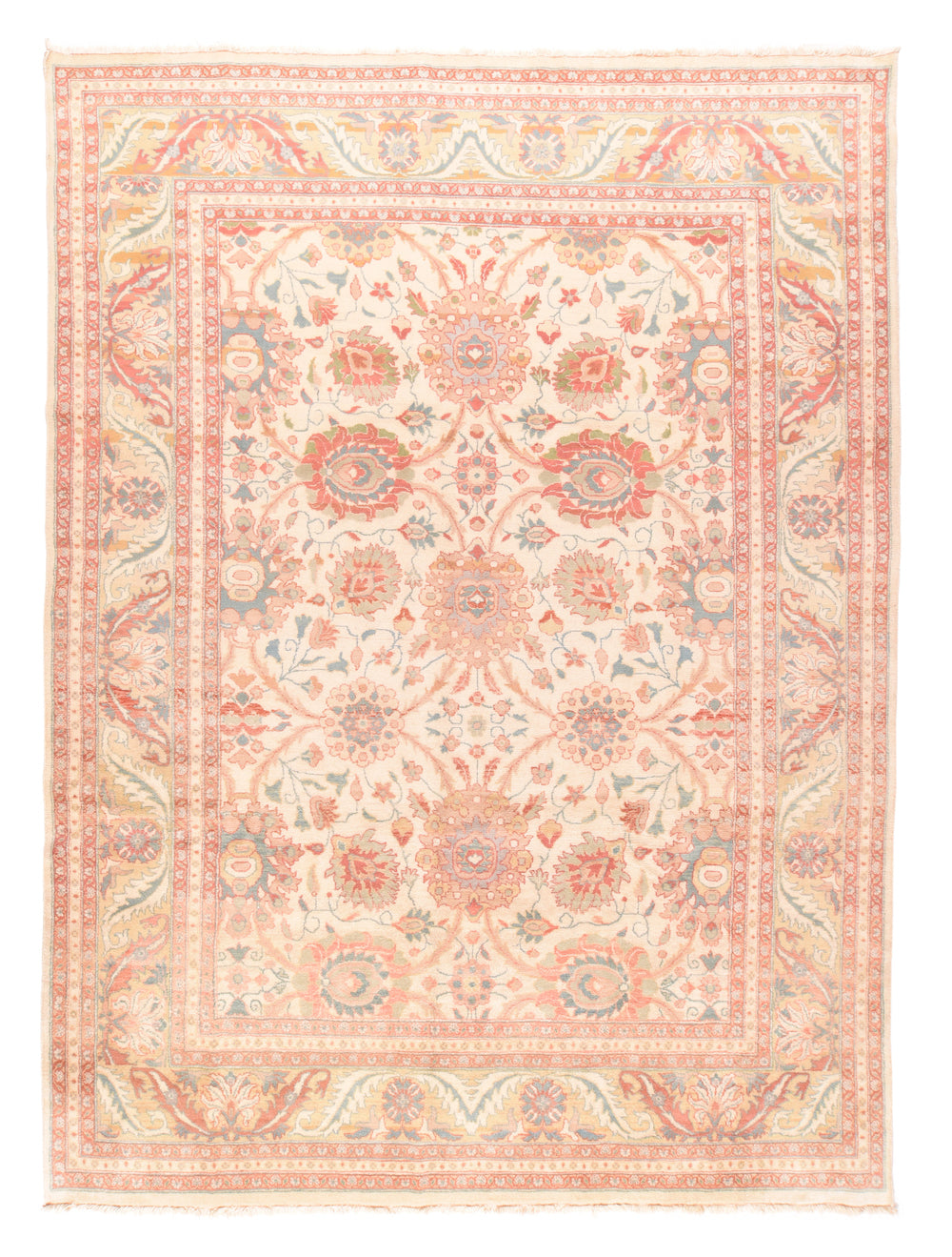 In the Sultanabad style with large, bold lazy and upright palmettes, and with a nearly pastel palette of cream, rust, teal, light green, light blue and straw; all connected by lightly convex barbed leaves. Straw border with barbed and end-curled acanthus leaves tilted around rosettes and palmettes. Medium-fine weave, cotton foundation. New condition.