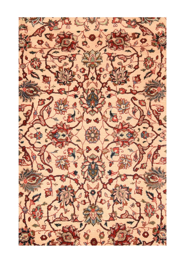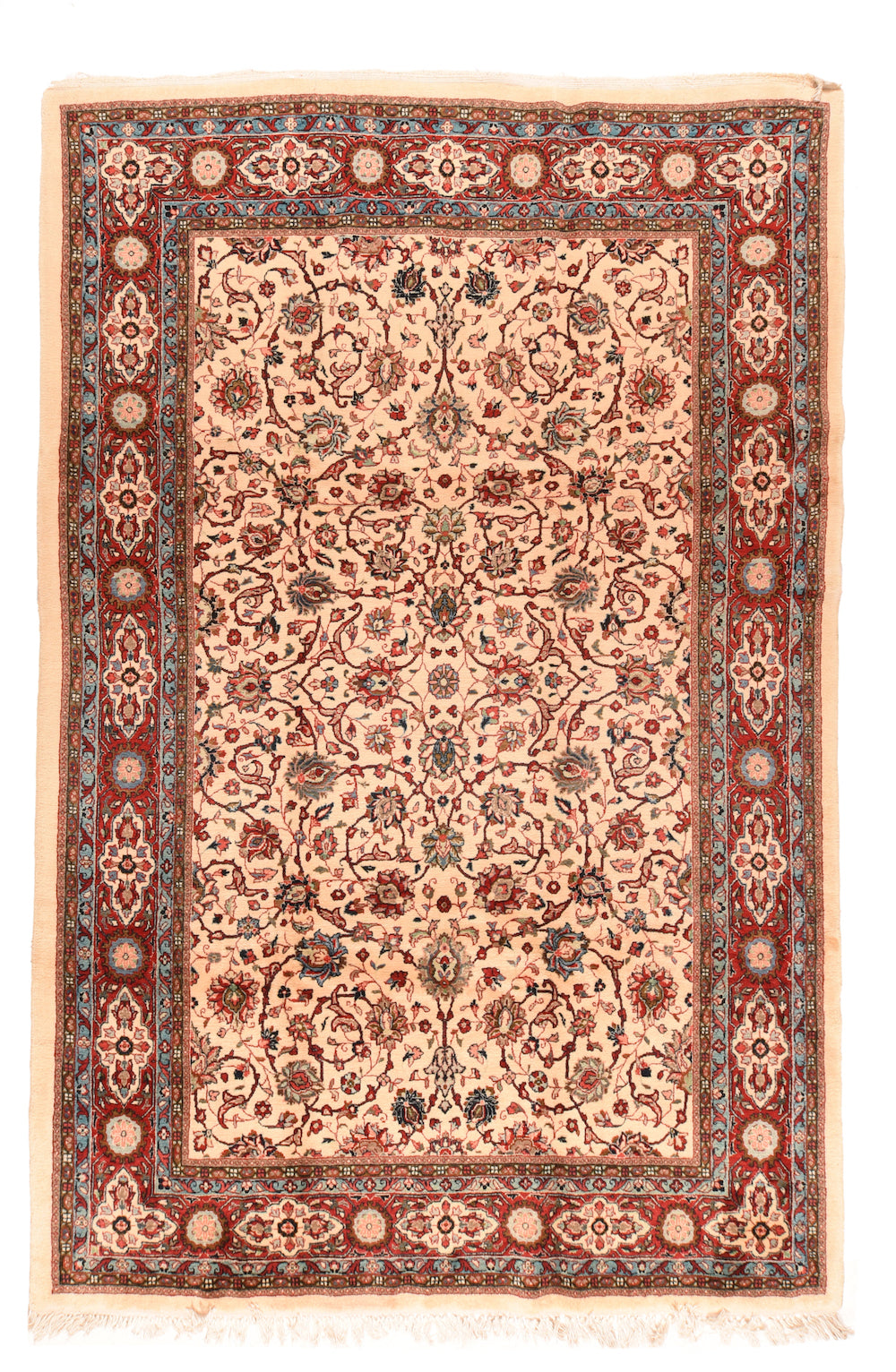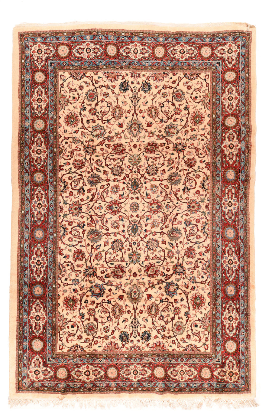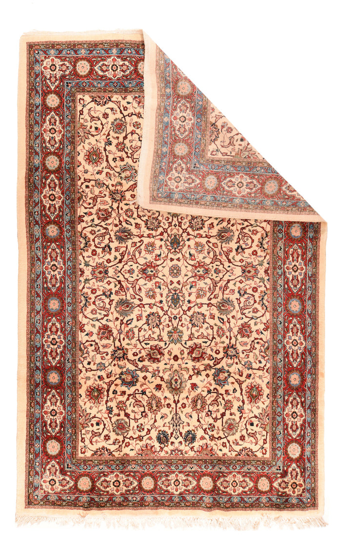 The spiral arabesques (slime) are organized in two levels by the central palmette column with a rosette focal point. Forked leaves, rosettes and more palmettes anchor and develop from the springy tendrils. A third vinery levels s more discreet and has its own decorative vocabulary. Cream ground. Red border with ecru cartouches and cogwheel rosettes. Fine weave, cotton foundation, velvety pile. Good condition.