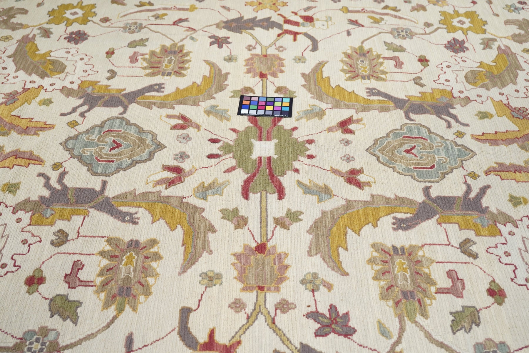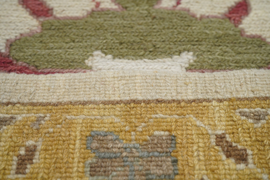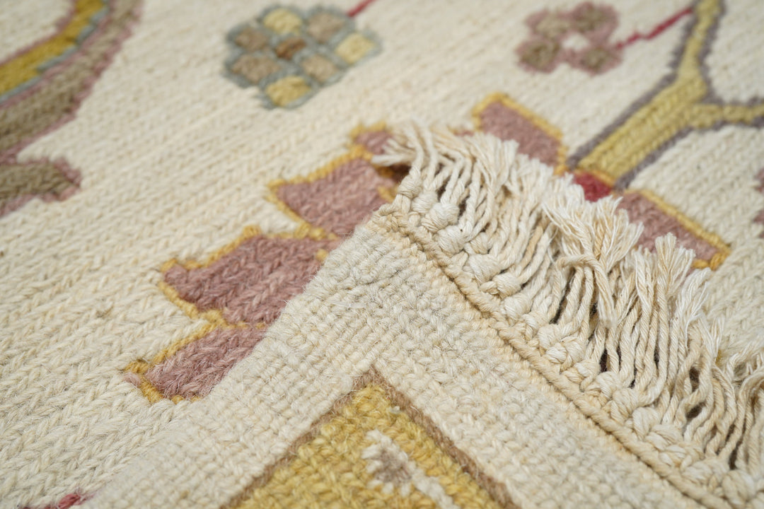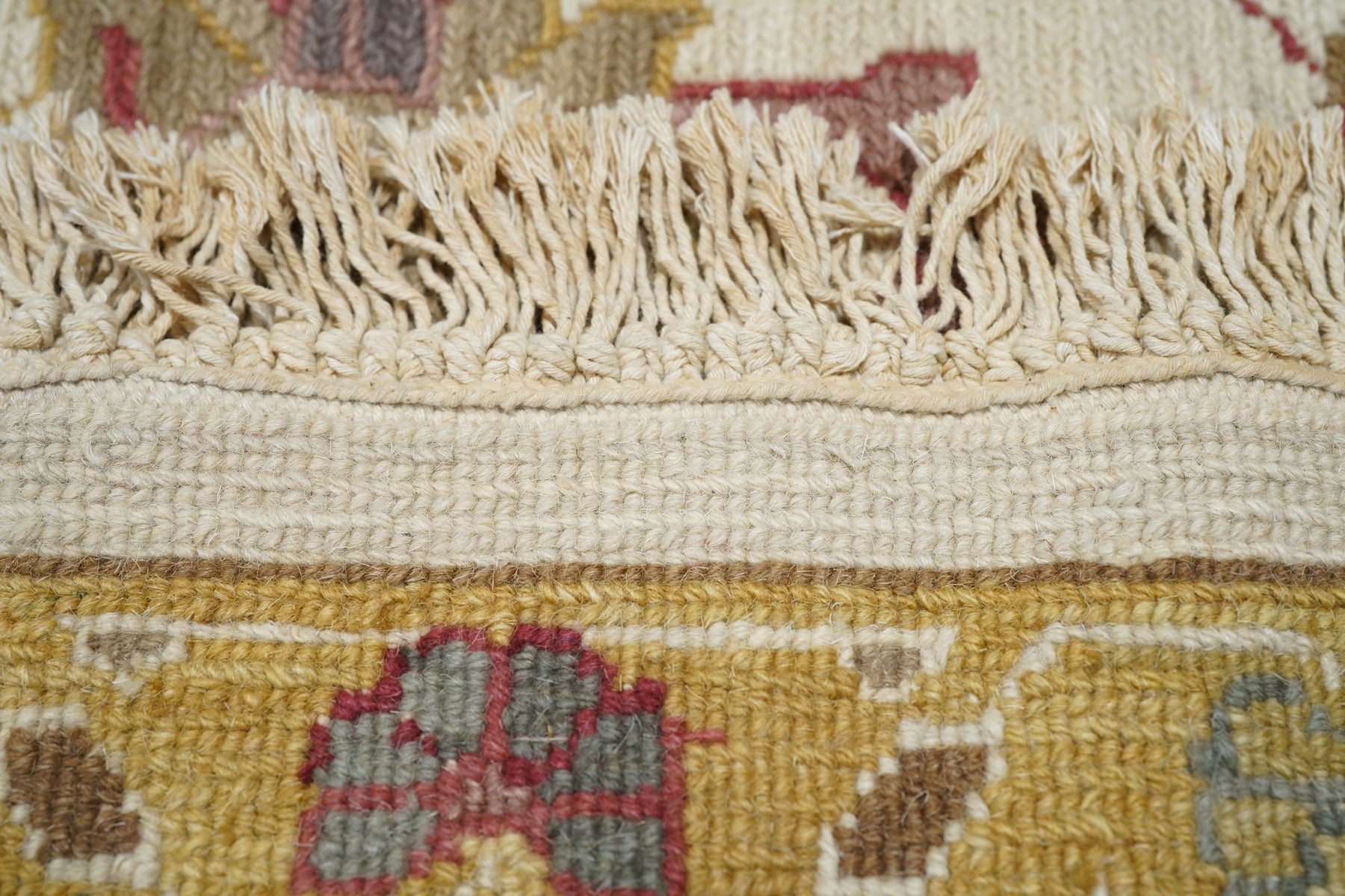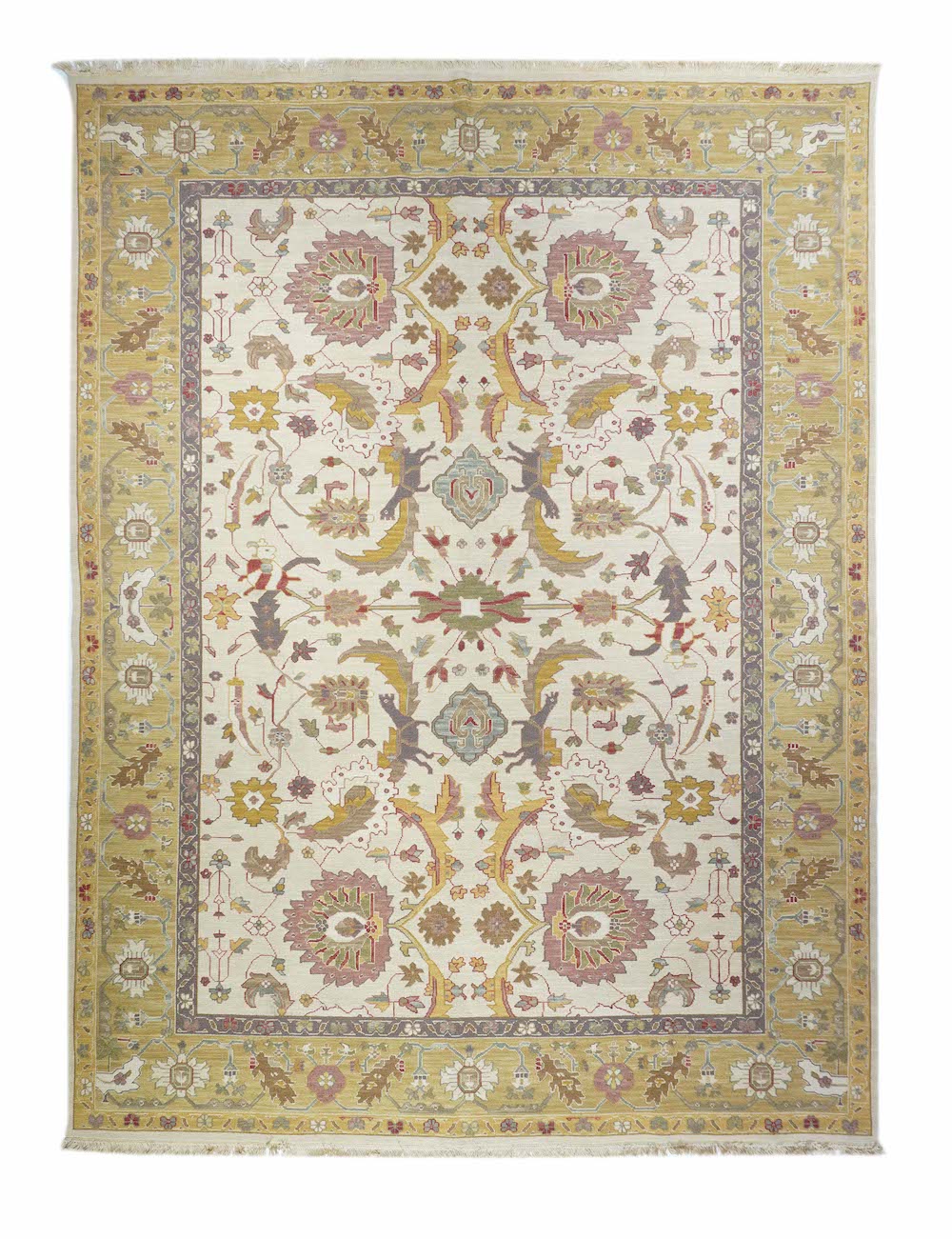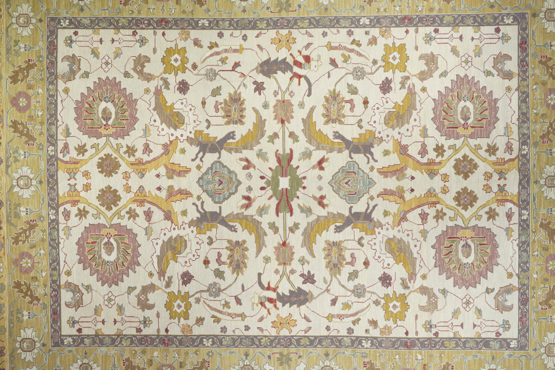 In the style of late 19th century Oushaks, with four central barbed sickle leaves, and four large jagged palmettes at the field ends. An Ottoman touch are the leaves piercing the petal collars. And four small animals have been added to amuse the beholder. Salmon abrashed border with ragged oak leaves and symmetrized petal palmettes. Recent. New condition.