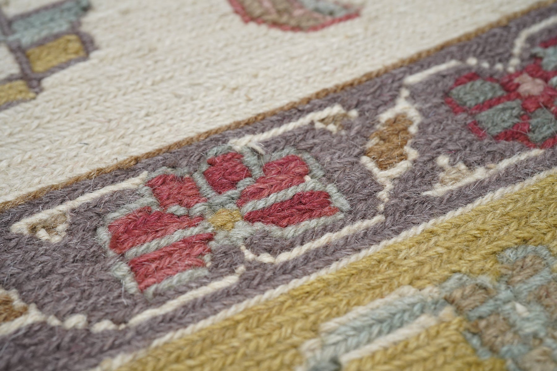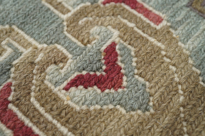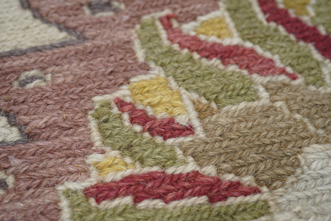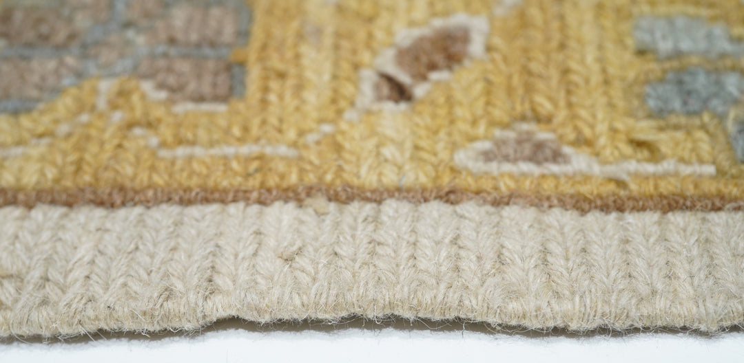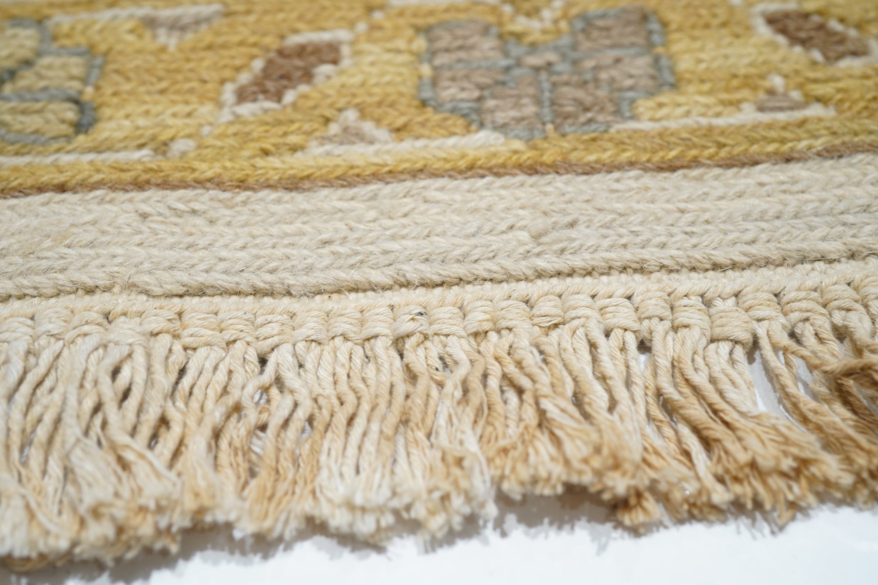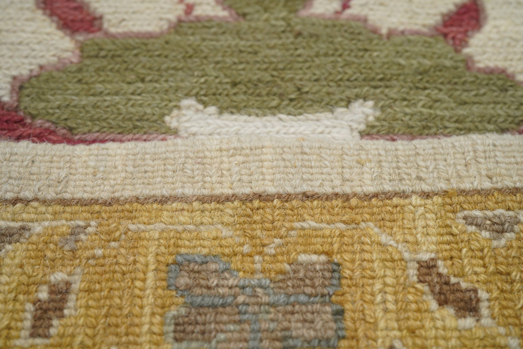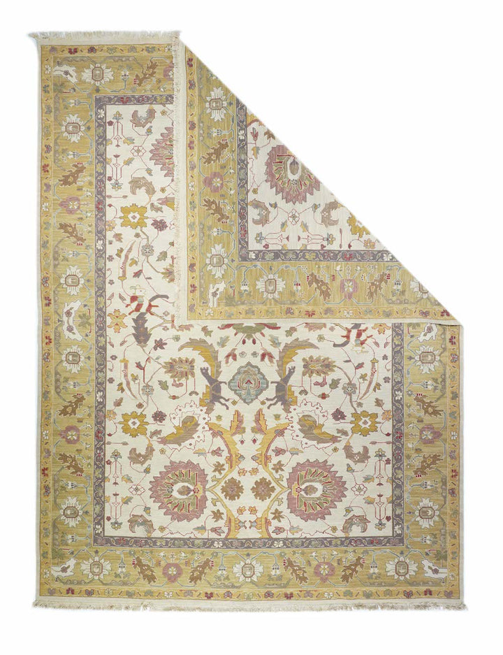 In the style of late 19th century Oushaks, with four central barbed sickle leaves, and four large jagged palmettes at the field ends. An Ottoman touch are the leaves piercing the petal collars. And four small animals have been added to amuse the beholder. Salmon abrashed border with ragged oak leaves and symmetrized petal palmettes. Recent. New condition.