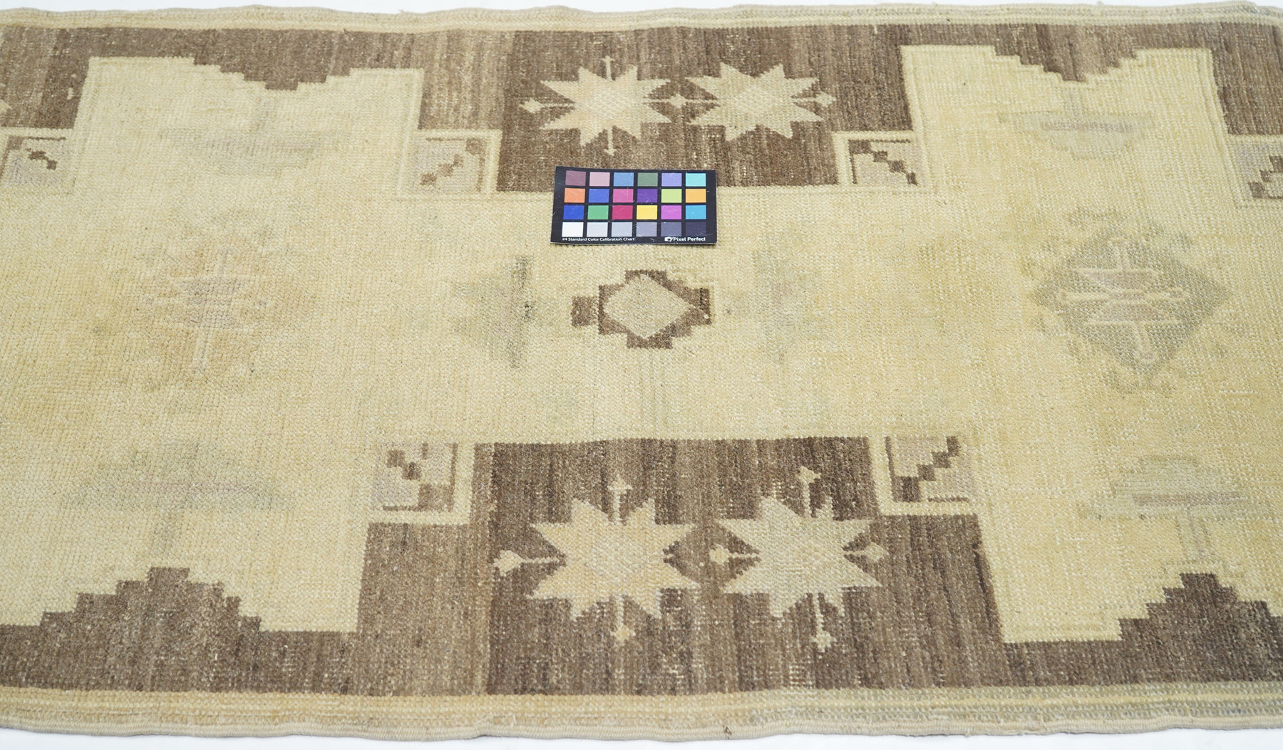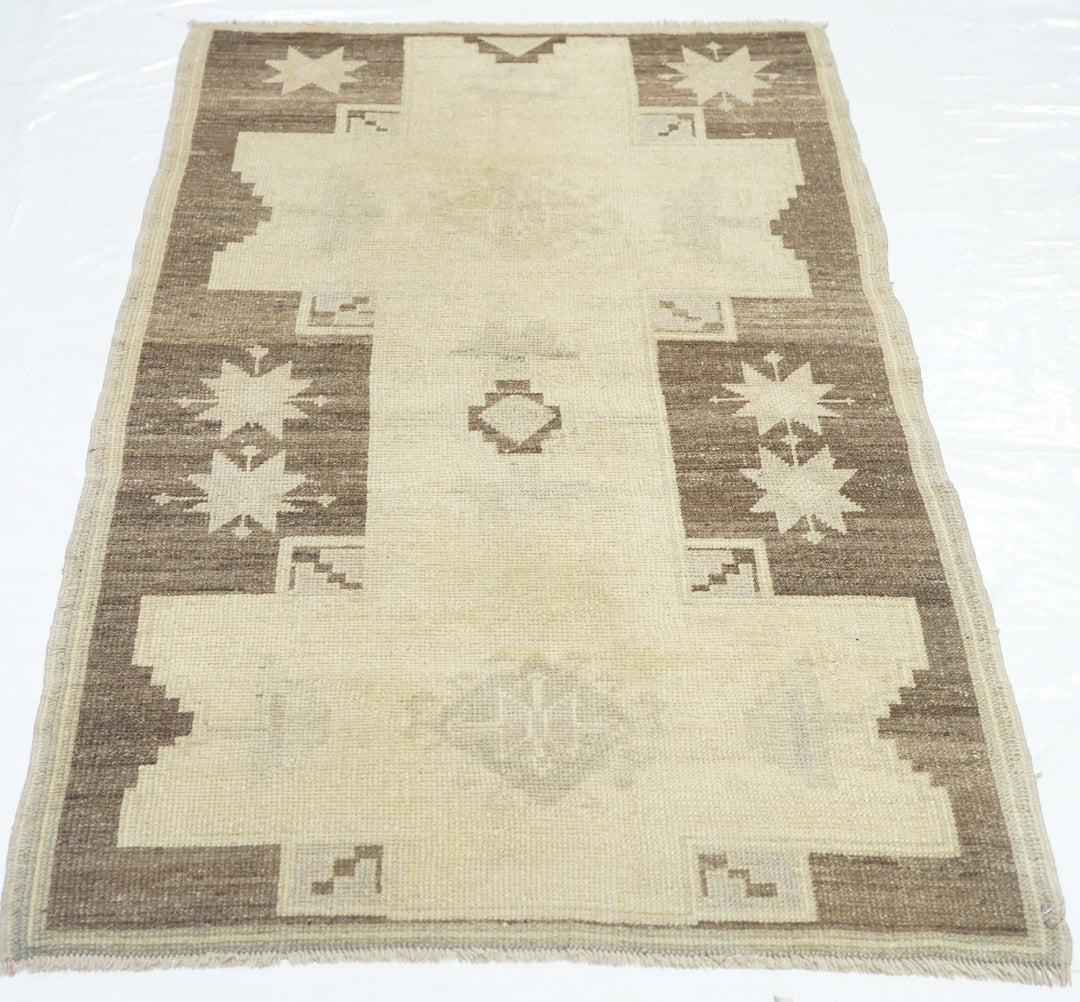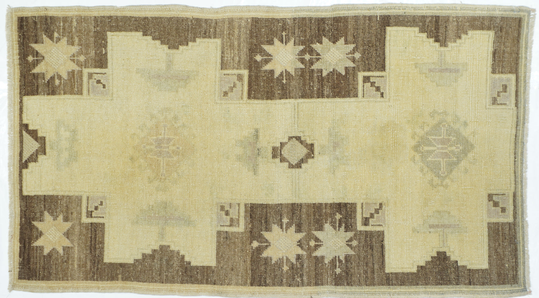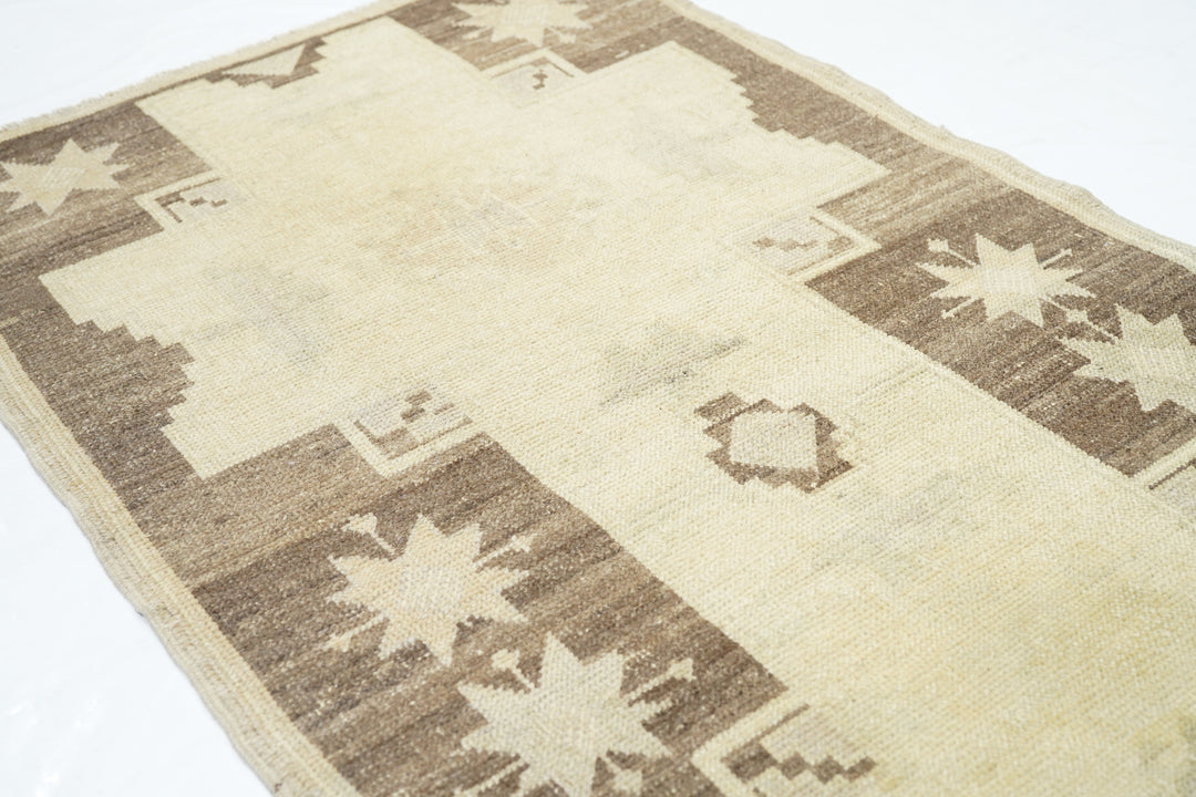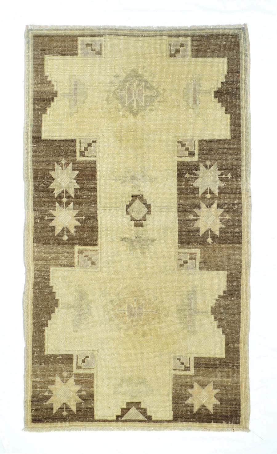 Two giant, conjoint, eight point “Lesghi stars” nearly overpower the notably abrashed field with similar, smaller secondary stars. Shadow details in straw, light brown, powder blue and pale green. Narrow border with narrower stripes. Medium rustic weave on wool foundation. Allover, even wear.
