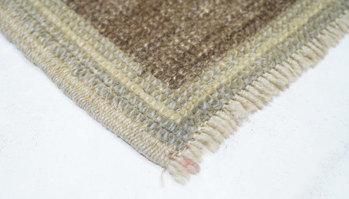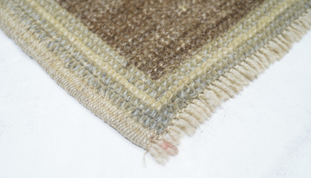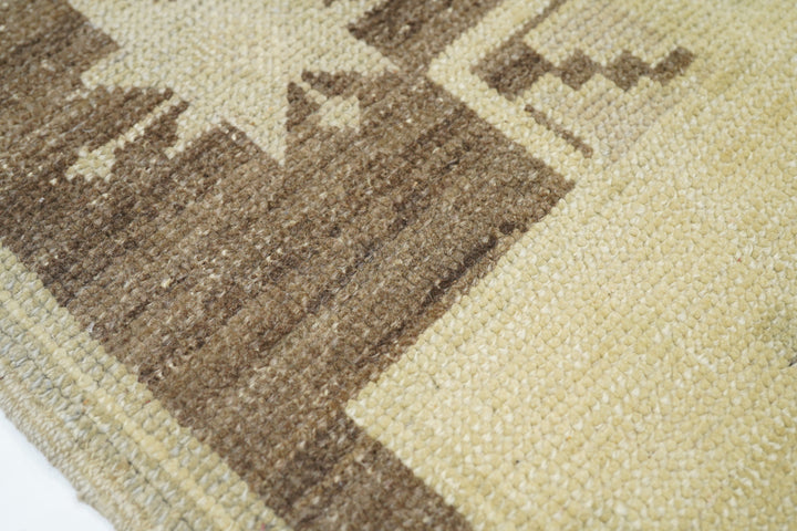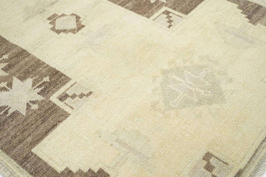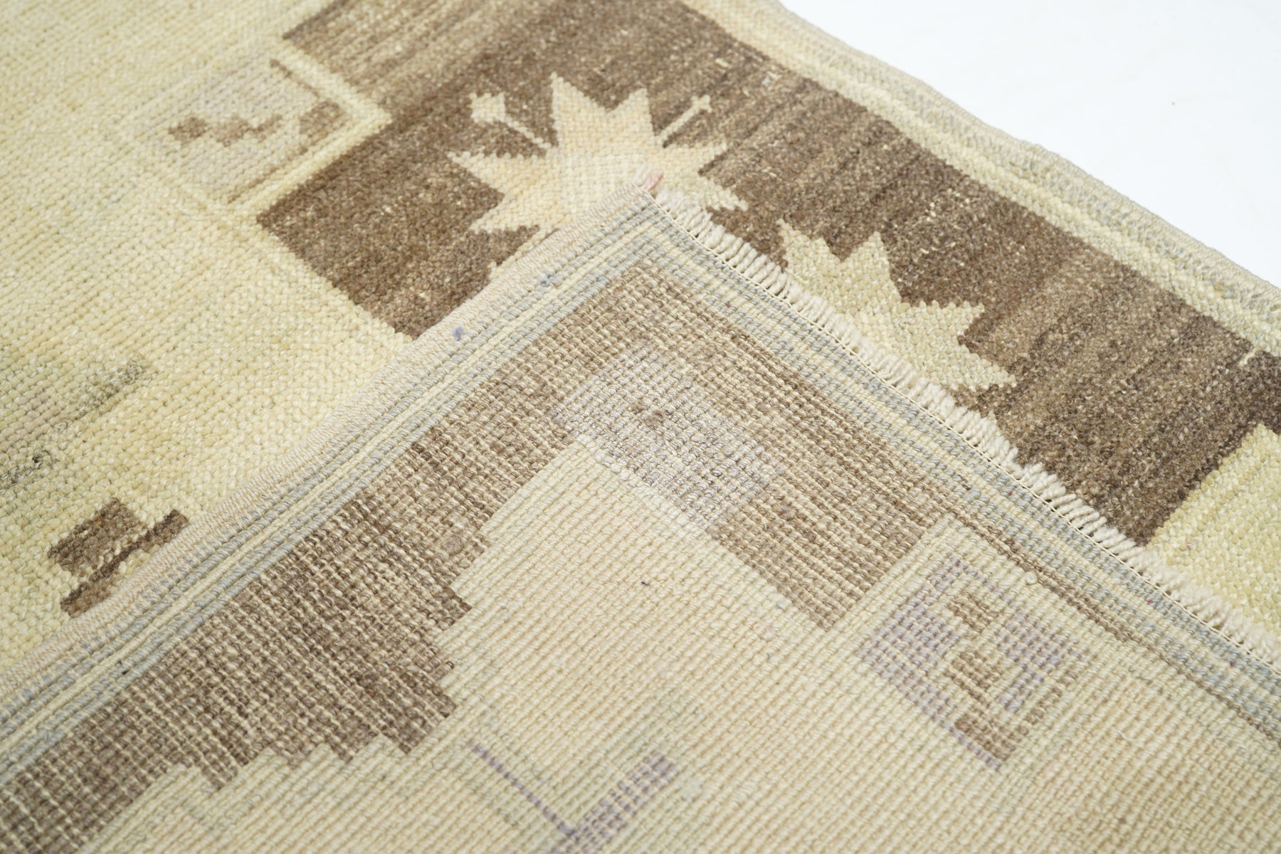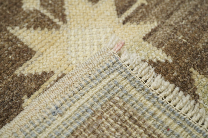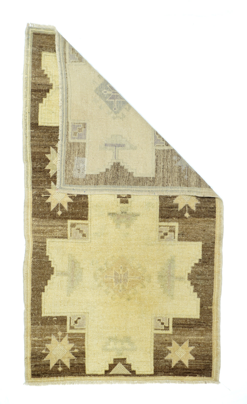 Two giant, conjoint, eight point “Lesghi stars” nearly overpower the notably abrashed field with similar, smaller secondary stars. Shadow details in straw, light brown, powder blue and pale green. Narrow border with narrower stripes. Medium rustic weave on wool foundation. Allover, even wear.