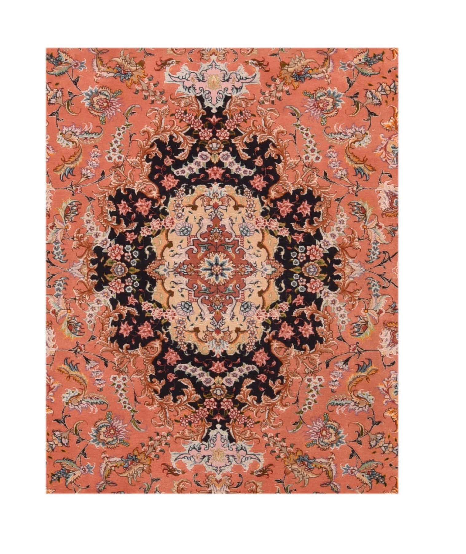 The salmon sub-field is defined by swags creating a broadly scalloped pattern, with a near black medallion with doubled pendants and a cream sub-medallion. Floret sprays in the cream field and sub-field. Near black border with palmettes and barbed, sickle leaves. Short, firm wool pile with silk details, on a silk warp in a very fine urban weave. As new condition.