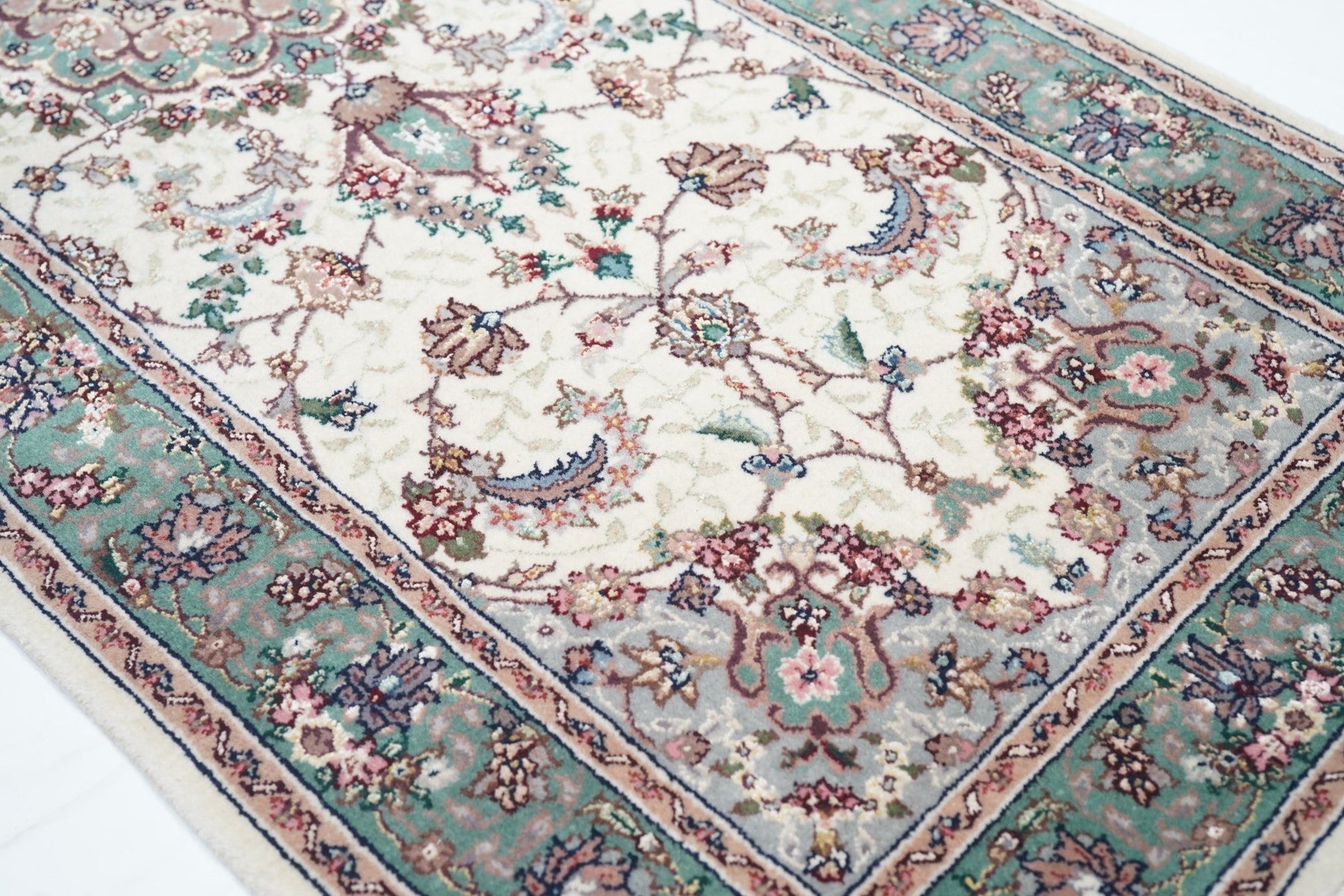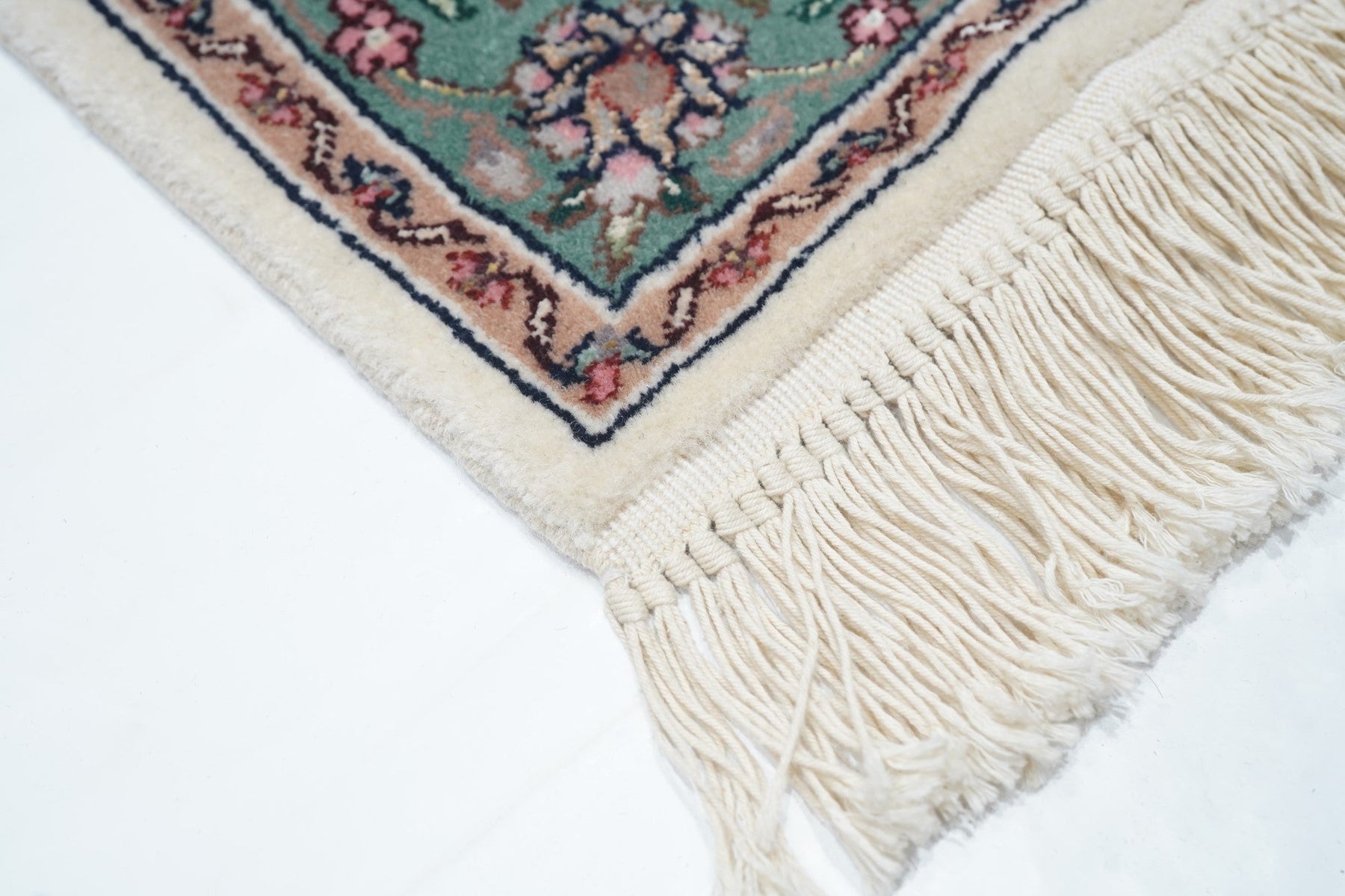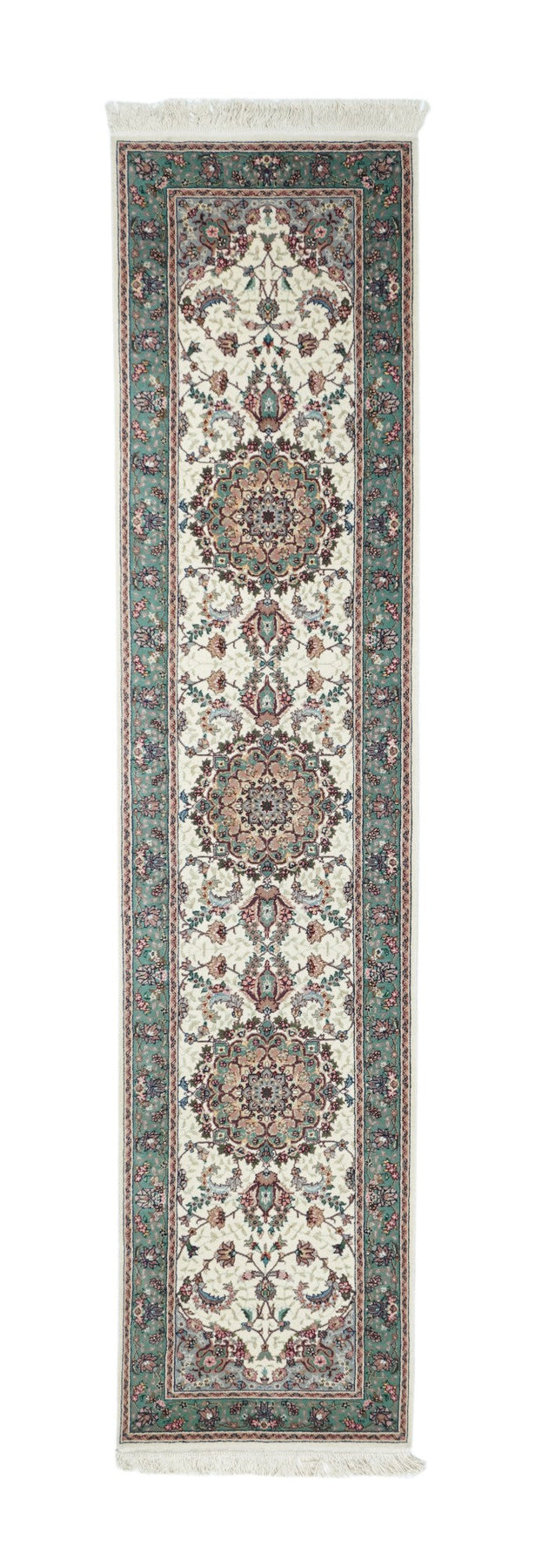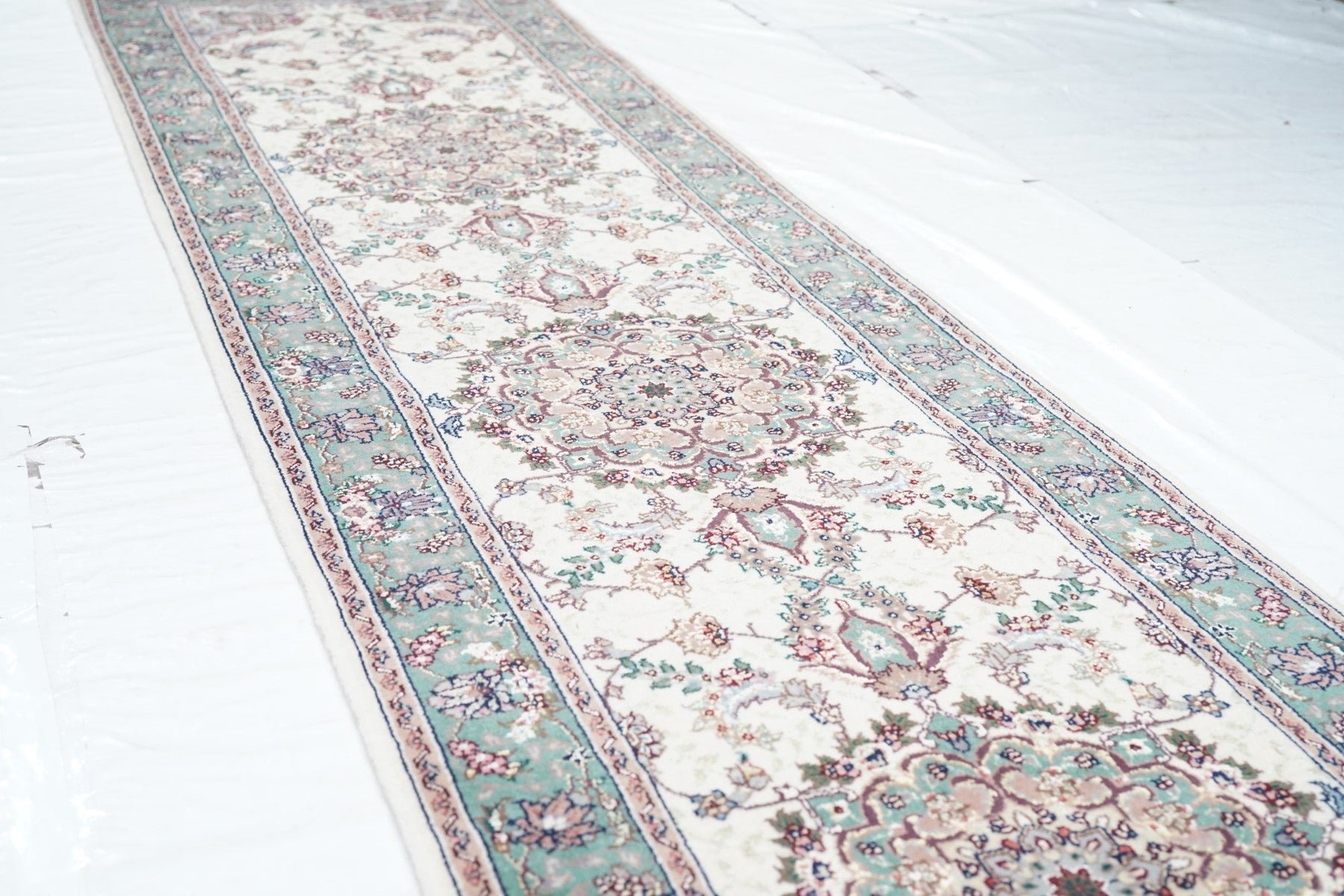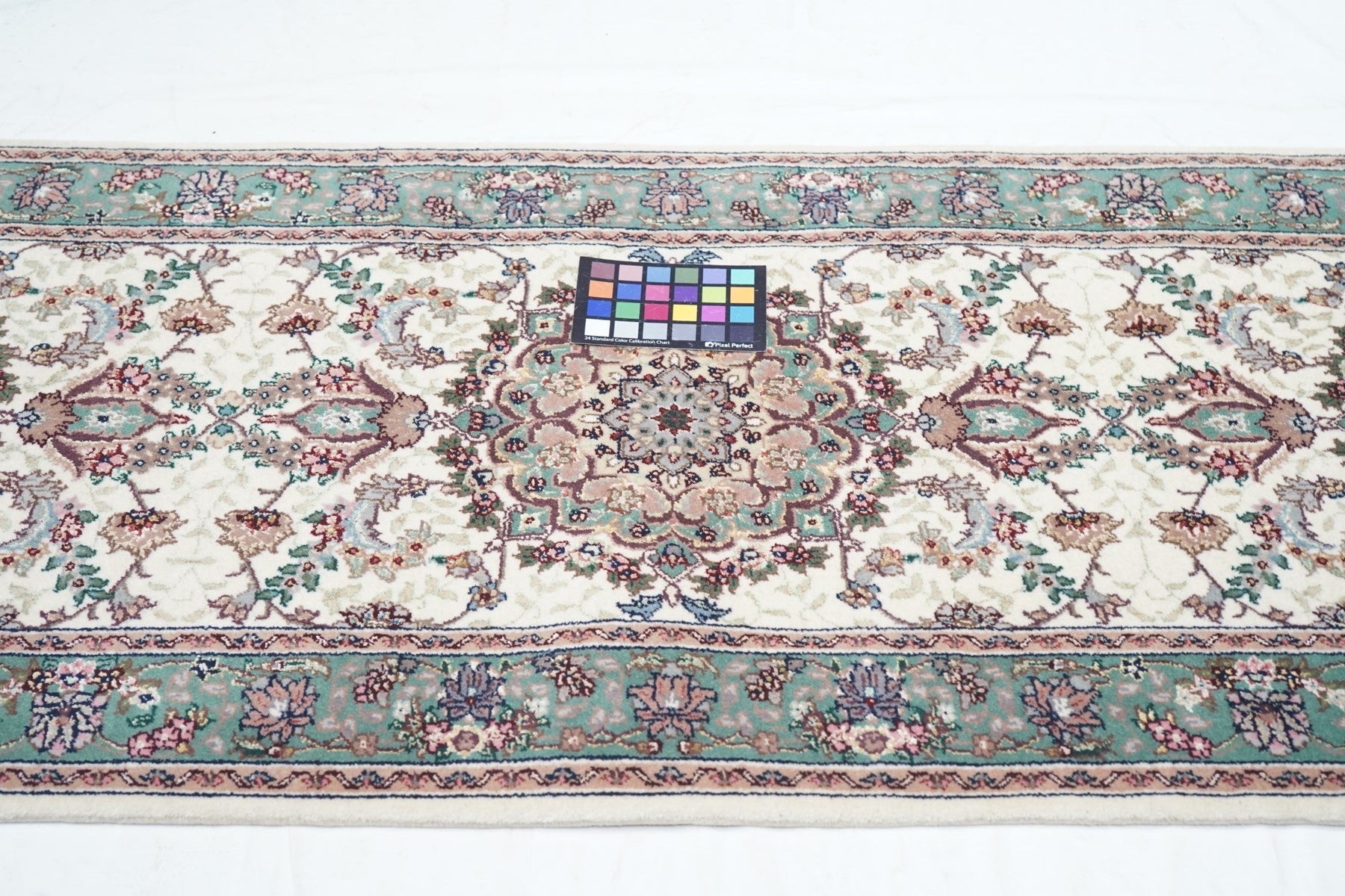 This well-woven kenare (runner) shows a creamy ivory field enhanced by three pendanted roundels, each with eight small projecting palmettes, against a ground of complex leaves and racemes, palmettes and as two level curving vinery. The lower level is a shadow. Border of complex reversing petal palmettes. Green, red, near black, teal green and off white accent tones.