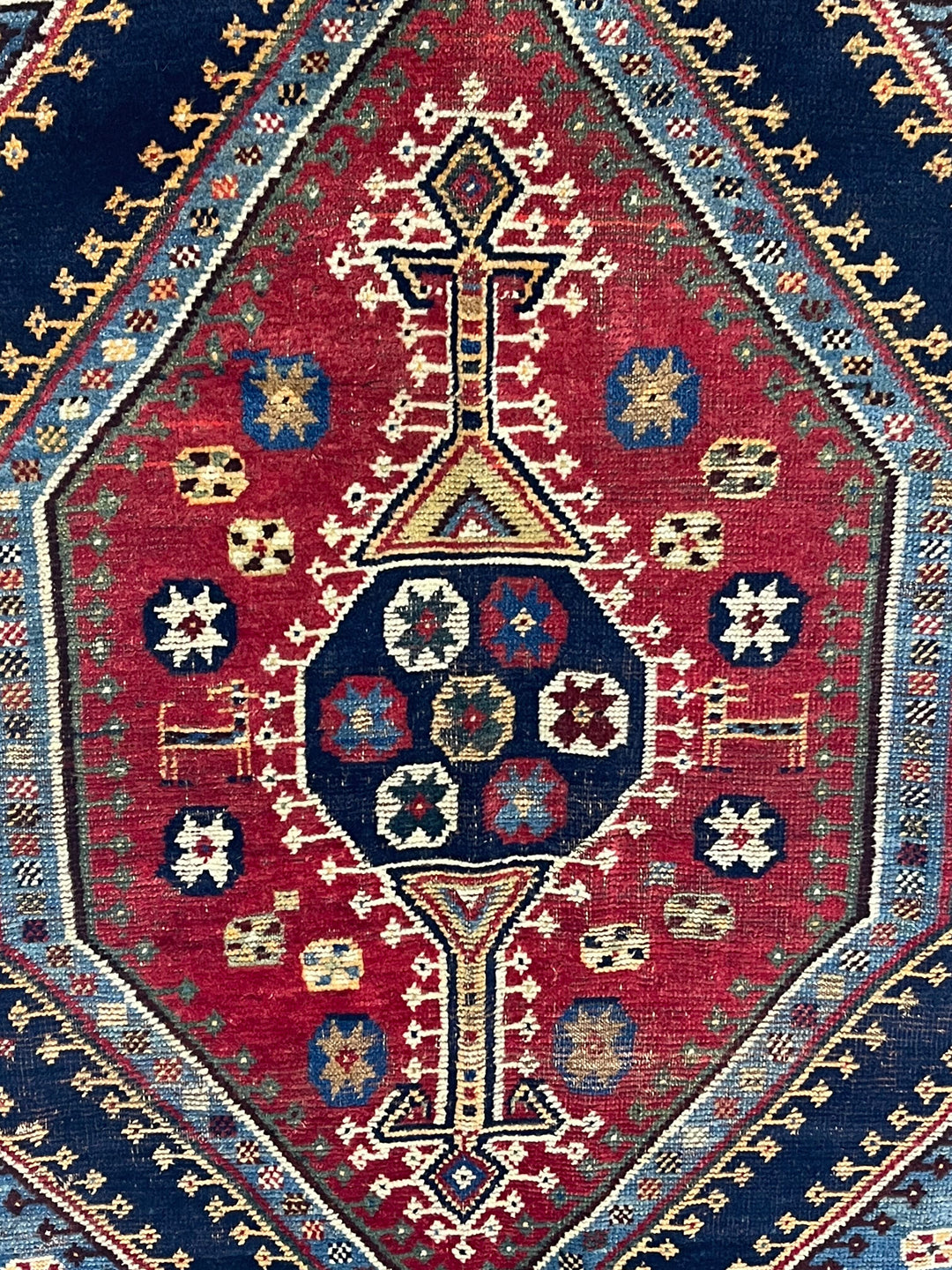 Wool pile rugs, usually scatter formats, woven by the Qashghai tribes of SW Persia (Fars Province), in moderate weave, uncluttered geometries and unshaded colors. From about 1900 onwards. Now copied by other weavers while retaining informal tribal character.