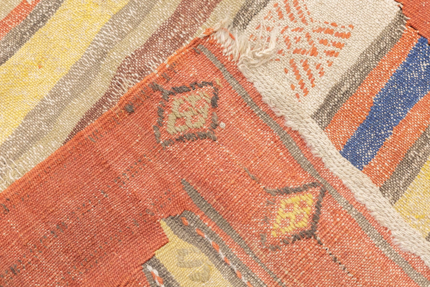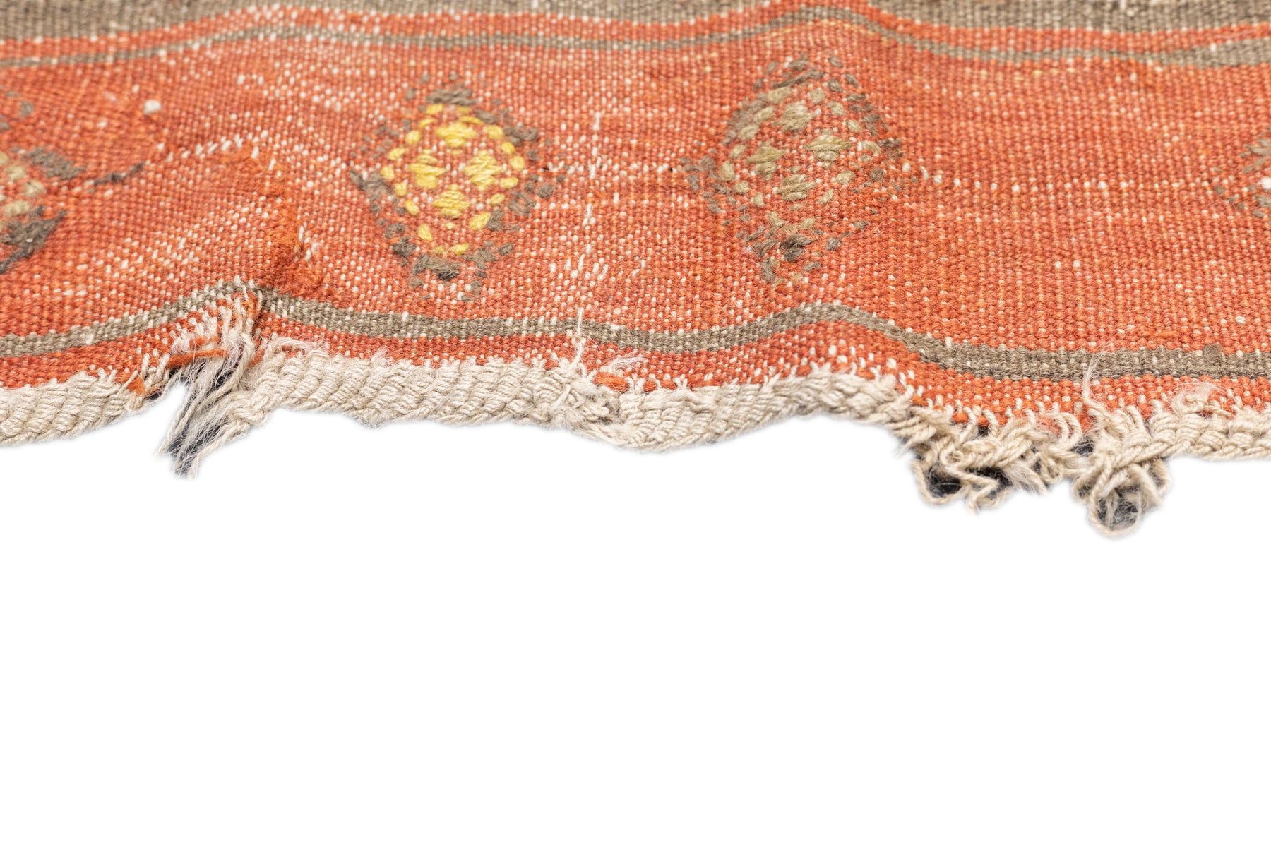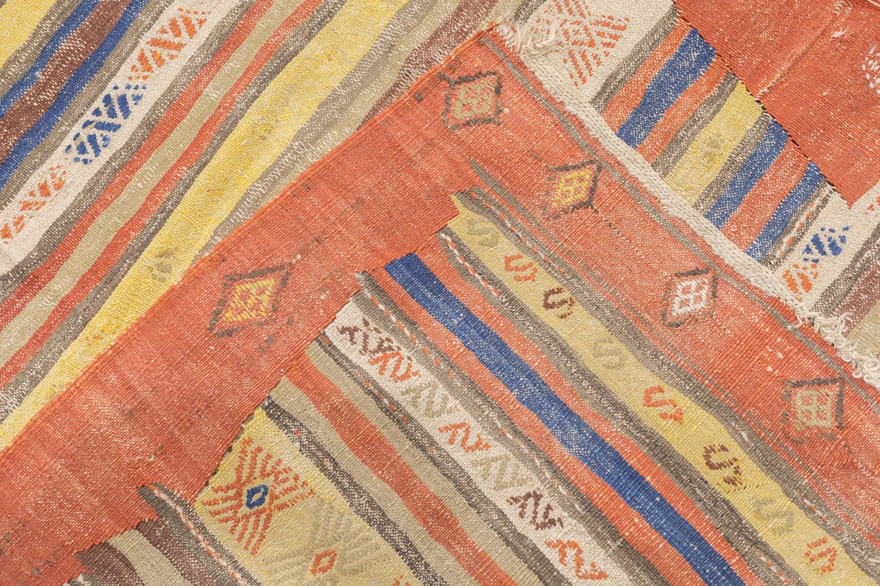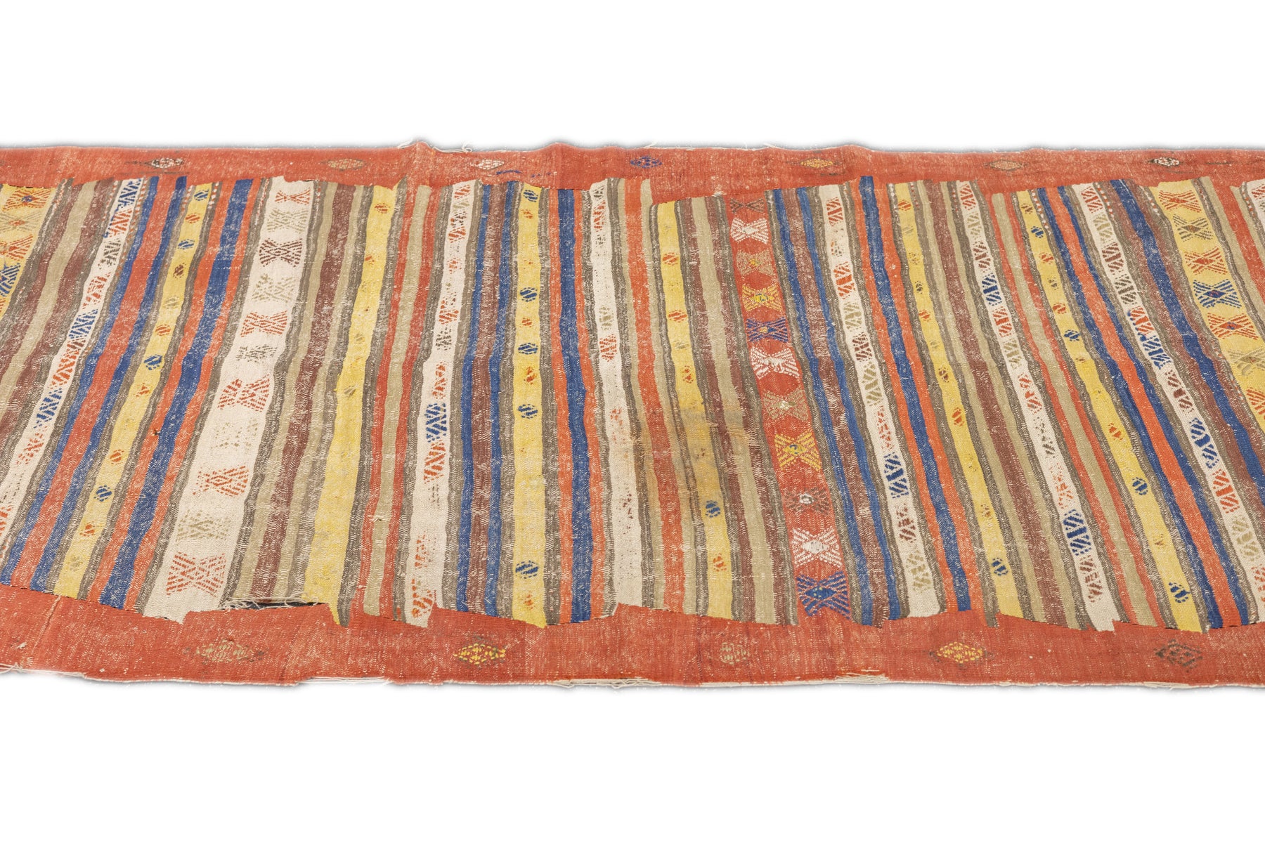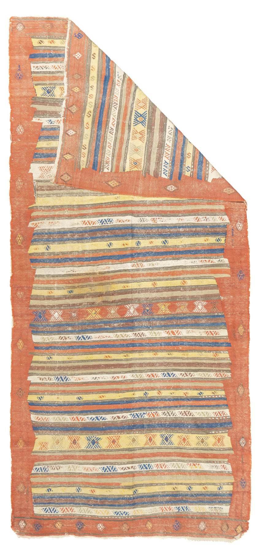 A technique rather than a type of rug. Technique is: slit tapestry, warp shared wefting, single or double weft interlocking. Also refers to plain-weave bands at end finishes. Kilims are light weight, generally made by villagers and nomads originally for household use. Senna kilims are extremely fine and are more like wall tapestries than floor rugs. Dhurries are Indian all-cotton kilims.