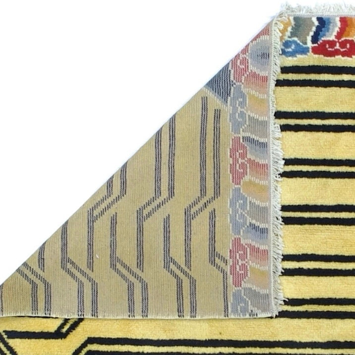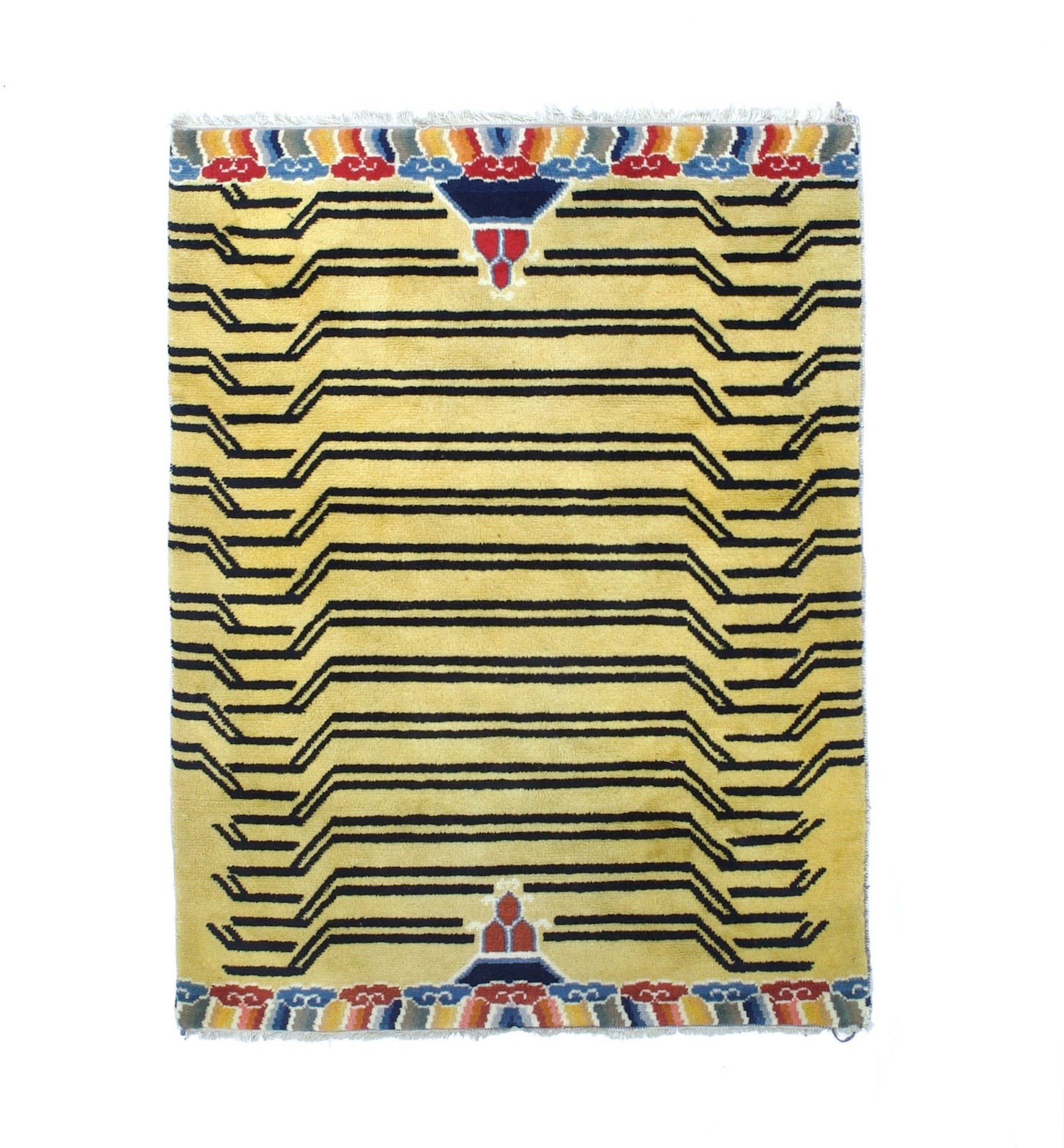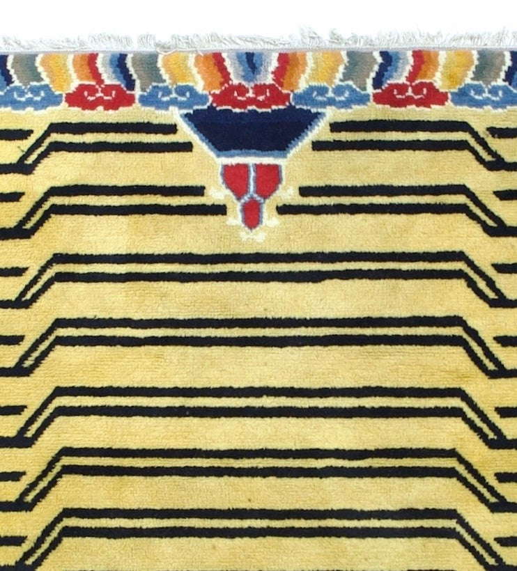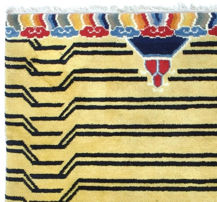 The generally small rugs of the plateau region, with dragon, tantric and allover patterns. Bright colors. Older are all wool, later with cotton wefts. A few large carpets. Shaggy runners and seating rugs.Large, often monochrome, carpets are now woven in Nepal by Tibetan refugees. Coarse to moderate weaves. Moderate to medium prices.