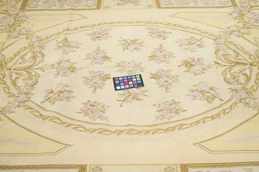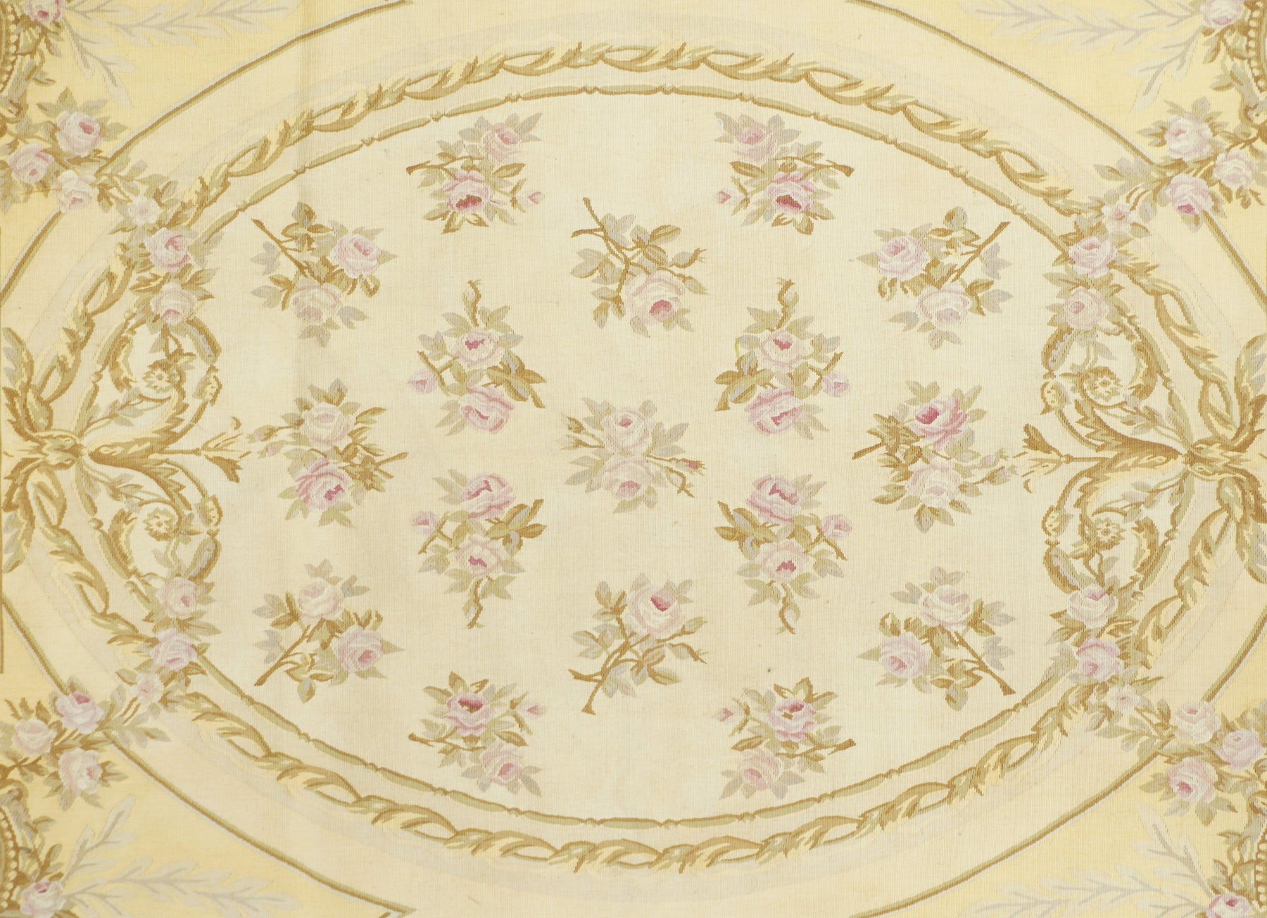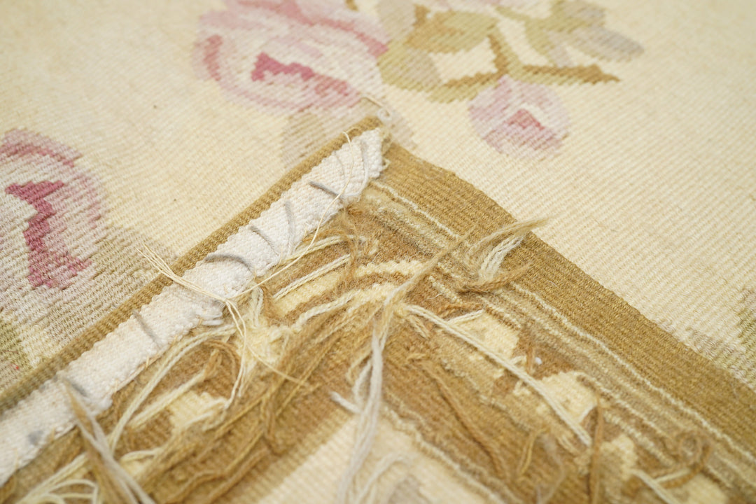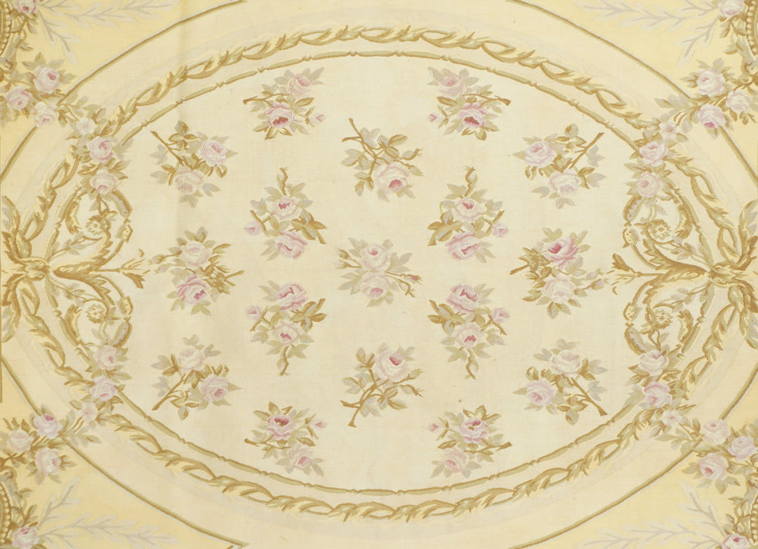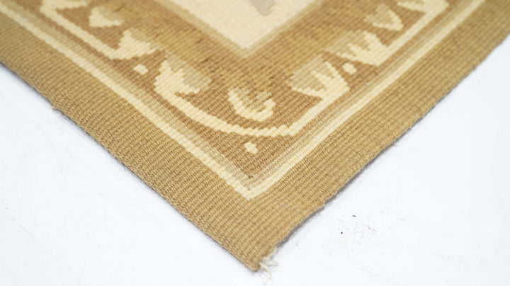 Refers generally to recent carpets in tapestry technique and inspired by French Aubusson designs of the 18th and later centuries.  Geometric or semi-floral. Scatters to room sizes. Recent pieces are usually Indian. Wool pattern wefts. Inexpensive to moderate