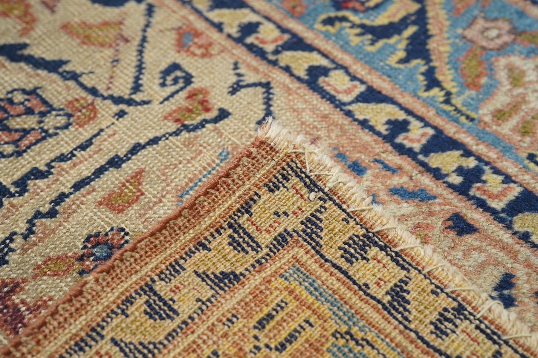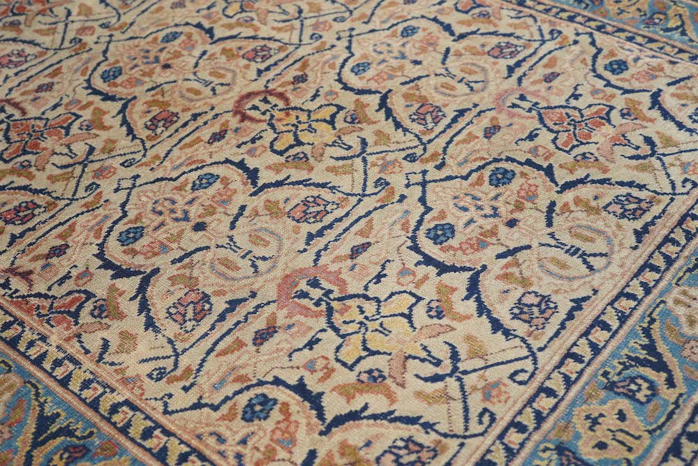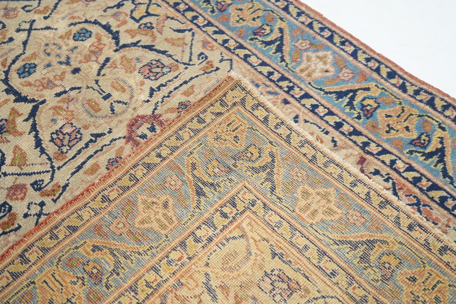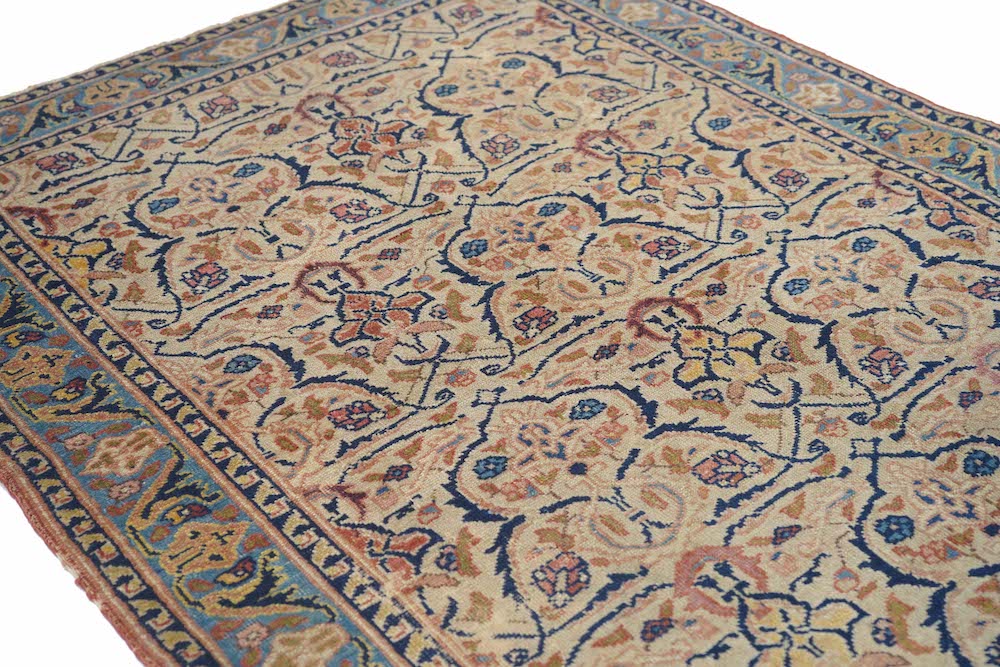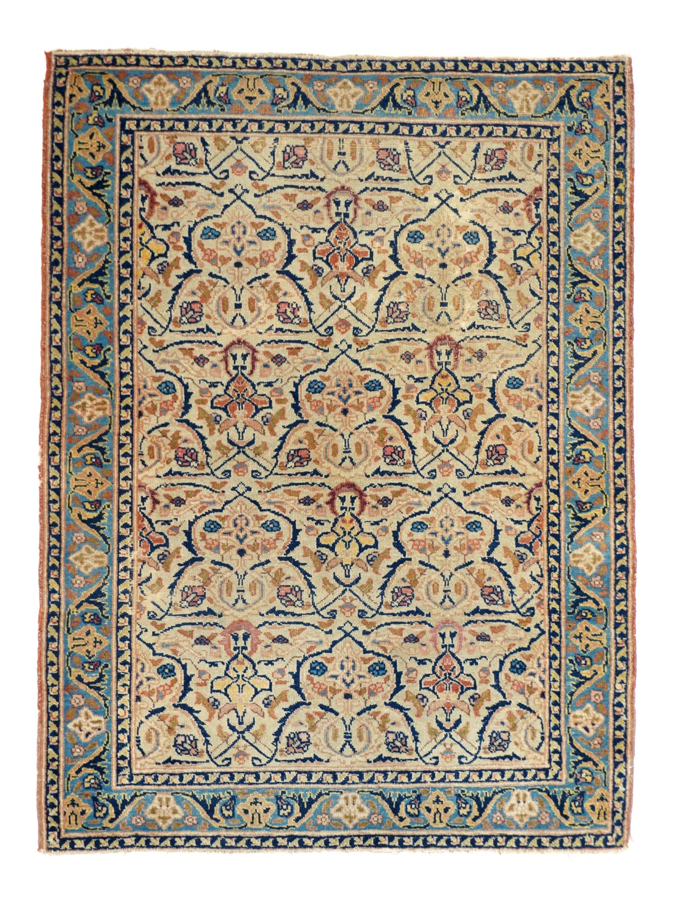 The Afshar tribes probably have the largest collective design repertoire of any nomadic or village group. In this attractive example, the pattern is reminiscent of Mahal carpets, with an ecru field supporting a large textile repeat of acanthus edged polylobate open elements. Small escutcheon palmettes hold the pattern together. Slate and rust details. Light blue border with forked acanthus arabesques and escutcheon palmettes. Medium weave. Good condition.