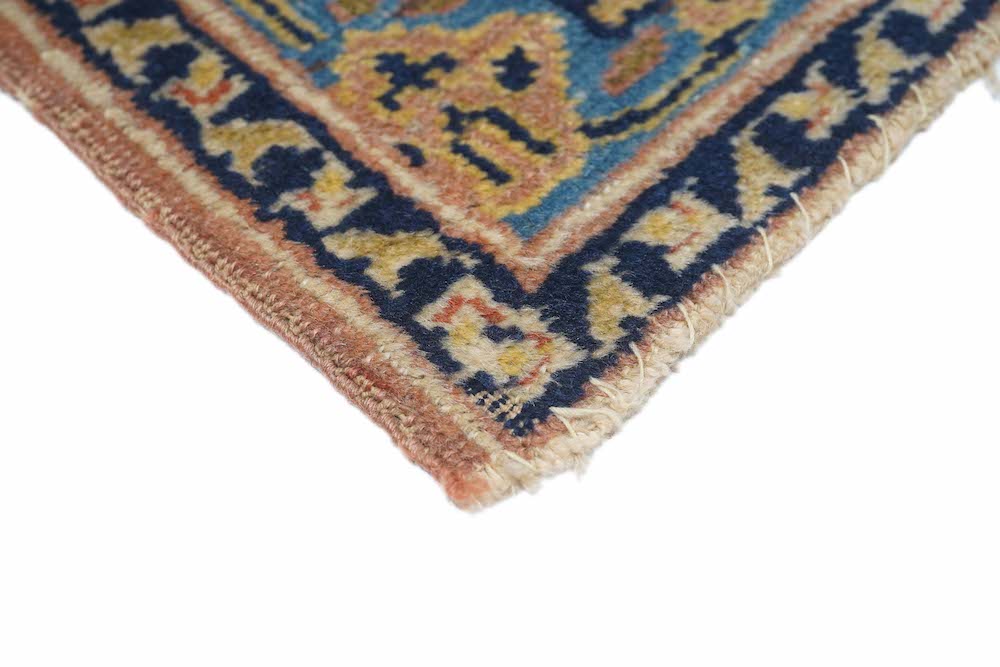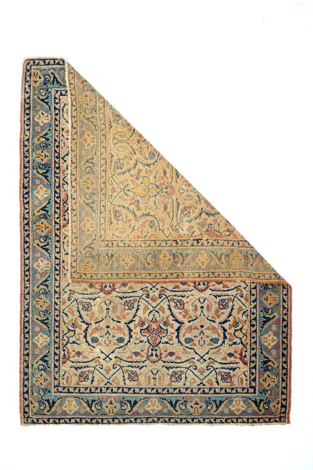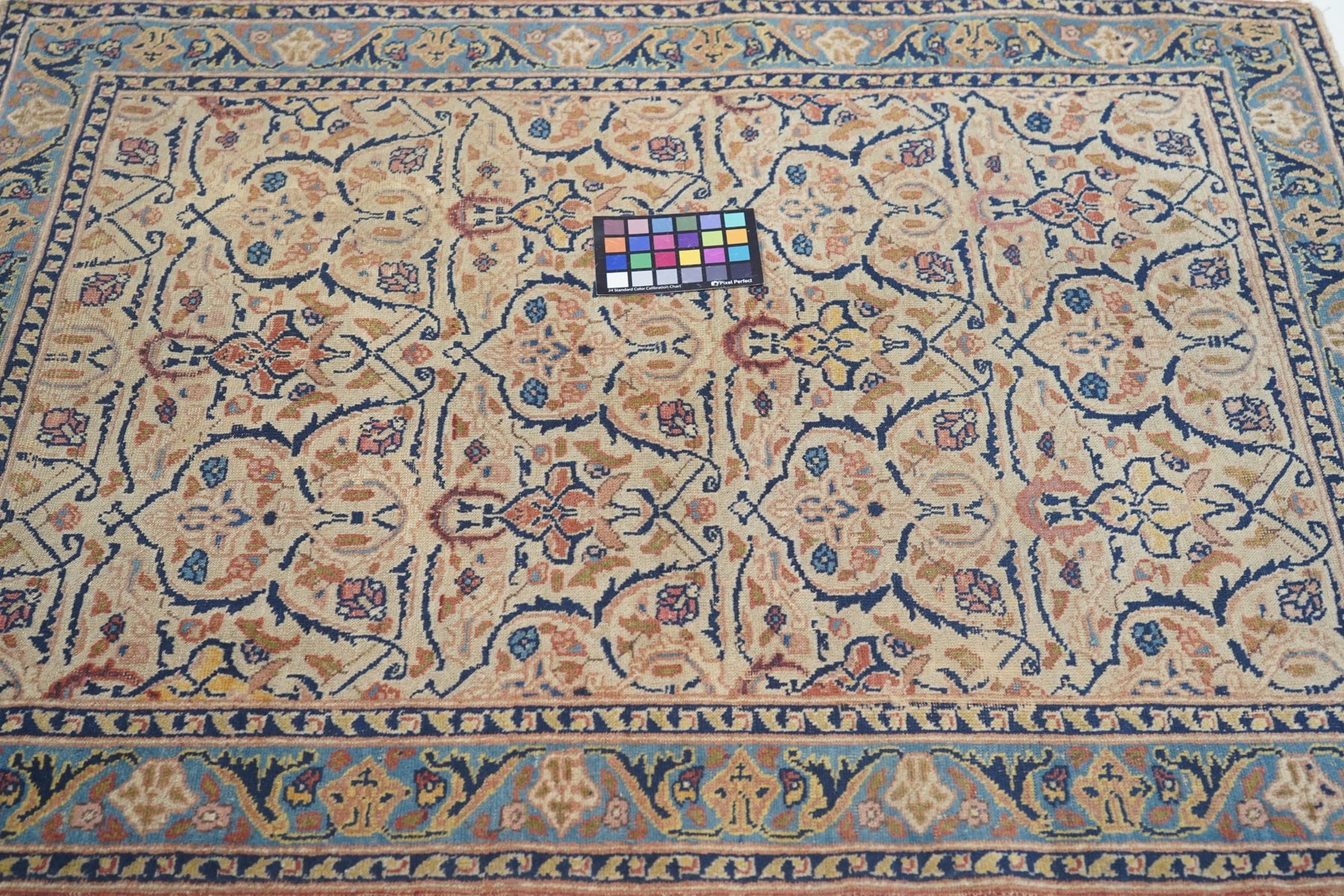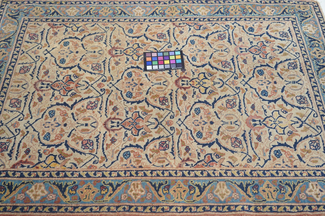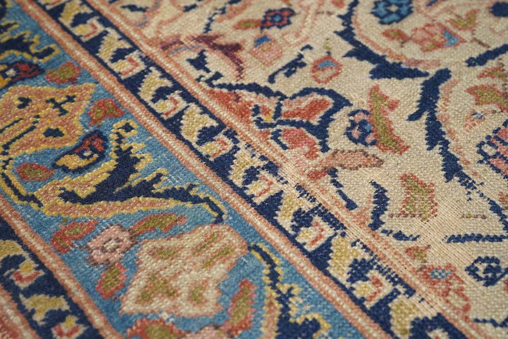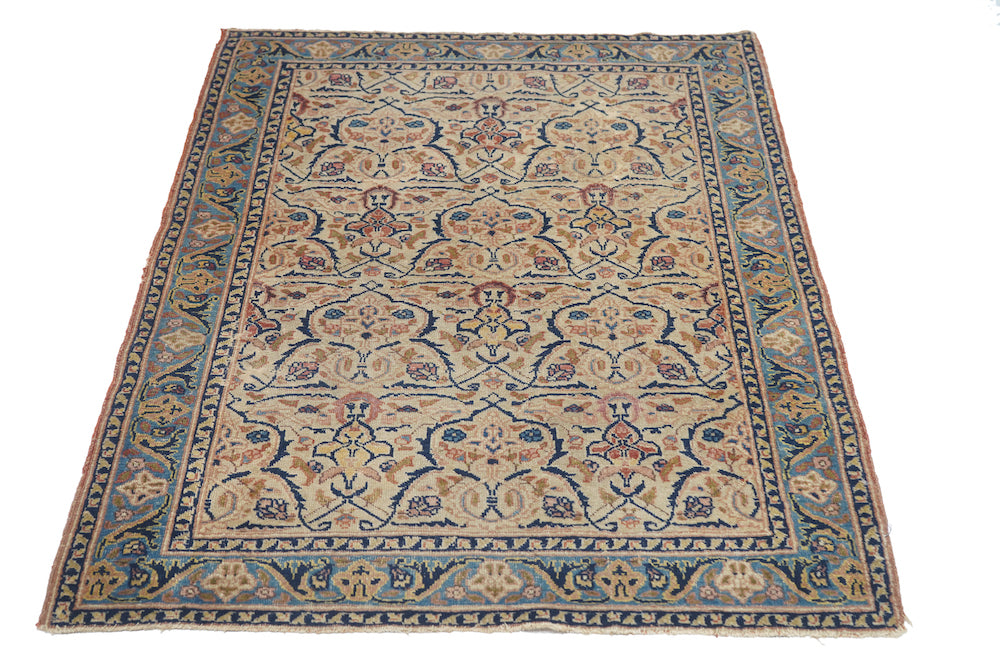 The Afshar tribes probably have the largest collective design repertoire of any nomadic or village group. In this attractive example, the pattern is reminiscent of Mahal carpets, with an ecru field supporting a large textile repeat of acanthus edged polylobate open elements. Small escutcheon palmettes hold the pattern together. Slate and rust details. Light blue border with forked acanthus arabesques and escutcheon palmettes. Medium weave. Good condition.