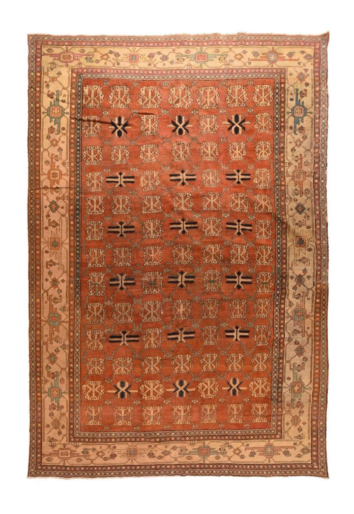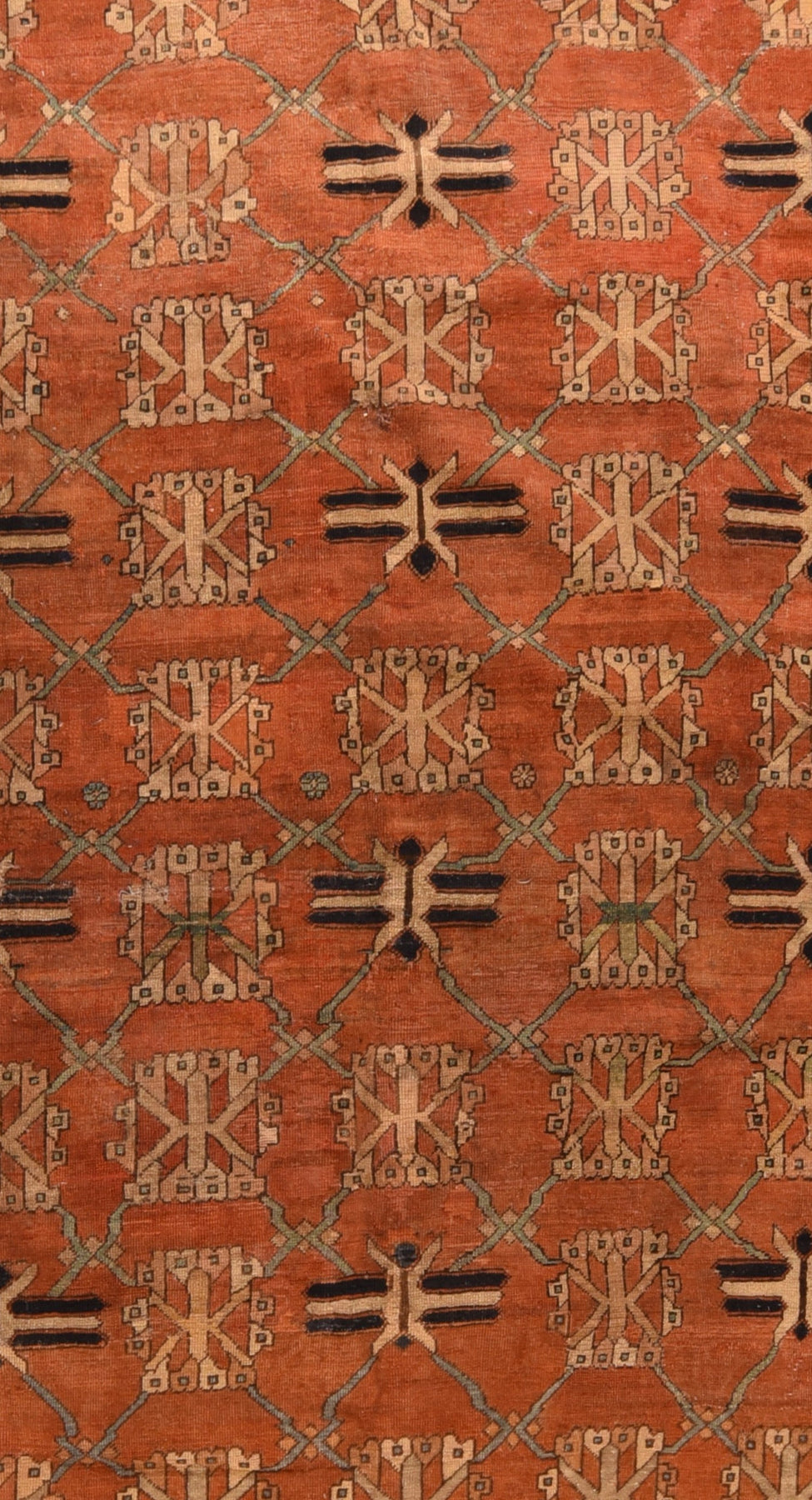 The rust field of this rustic Central Asian piece shows a seven by thirteen arrangement of repeating stylized flowers and guls accented in straw and black. The darker detailed guls are in every second row. As new condition.