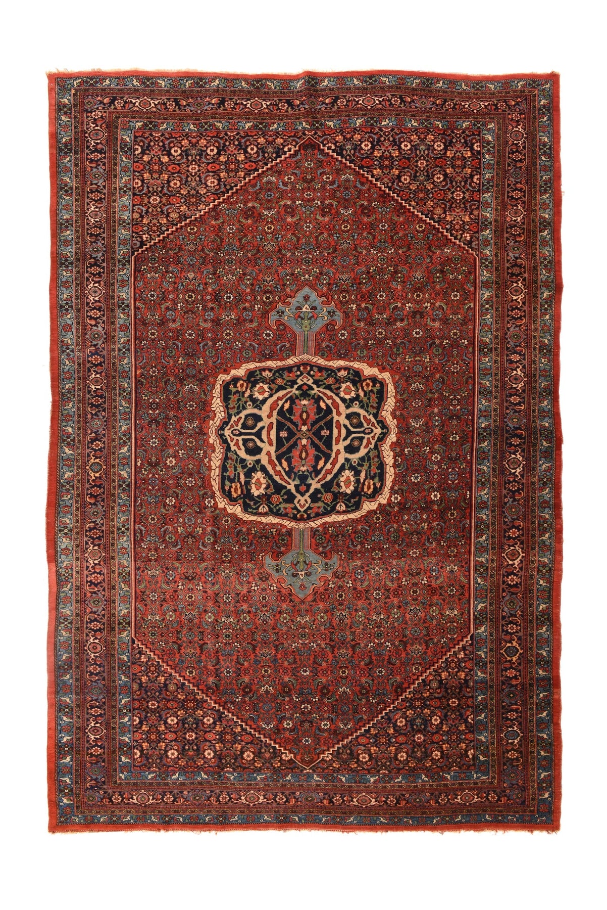 The light wine red field shows a small allover Herati design, centrally covered by a rounded navy and straw-sand medallion with light blue anchor pendants. Navy Herati same-scale conjoint, stepped corners. Narrow strip style navy turtle border and light blue linked rosette minors. Robust and heavy medium urban weave. Good condition.