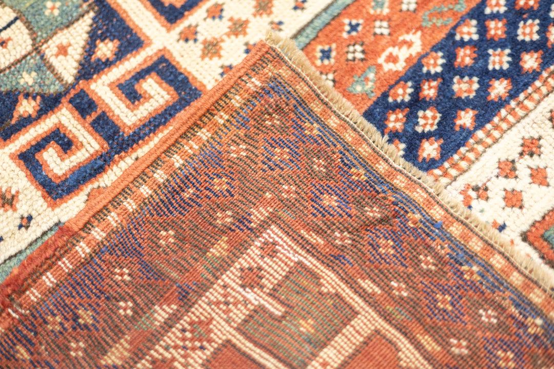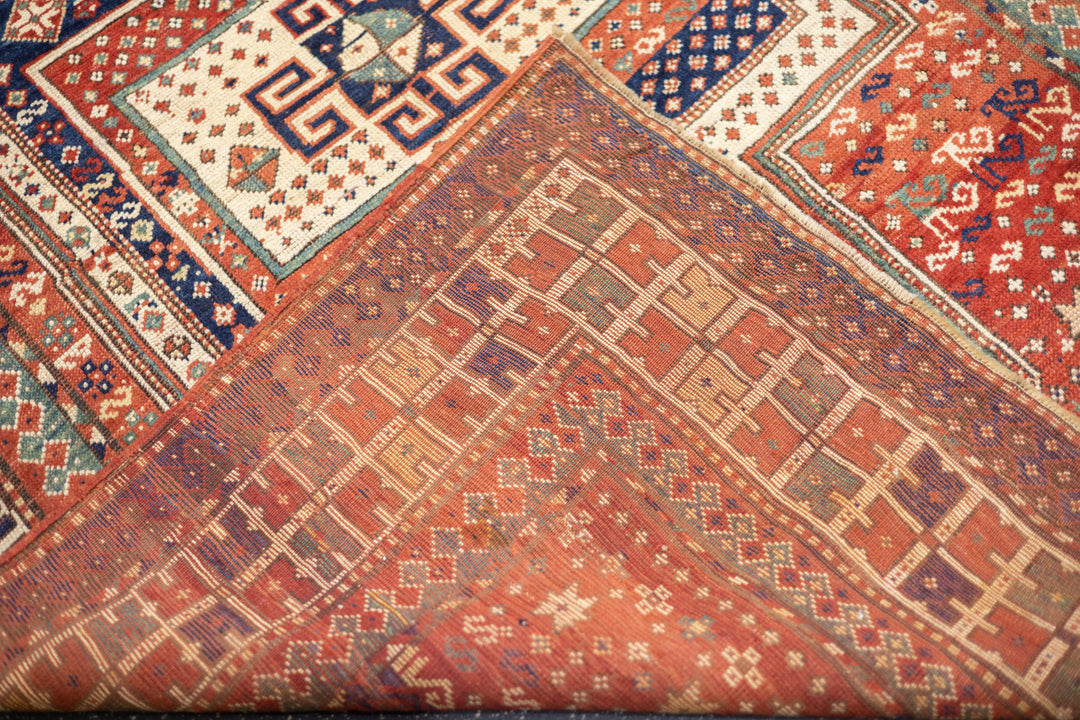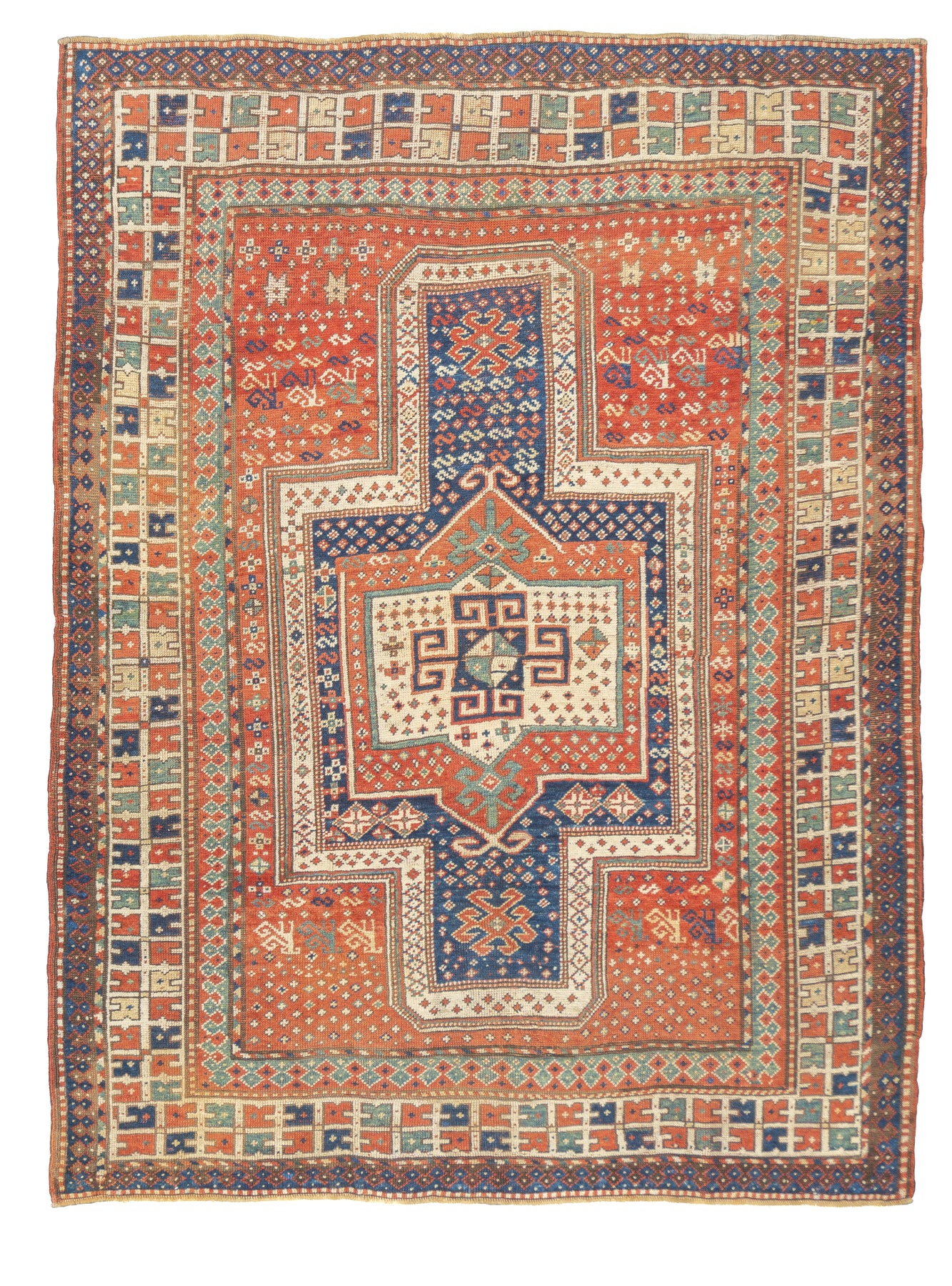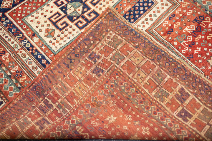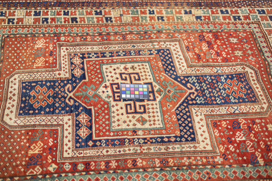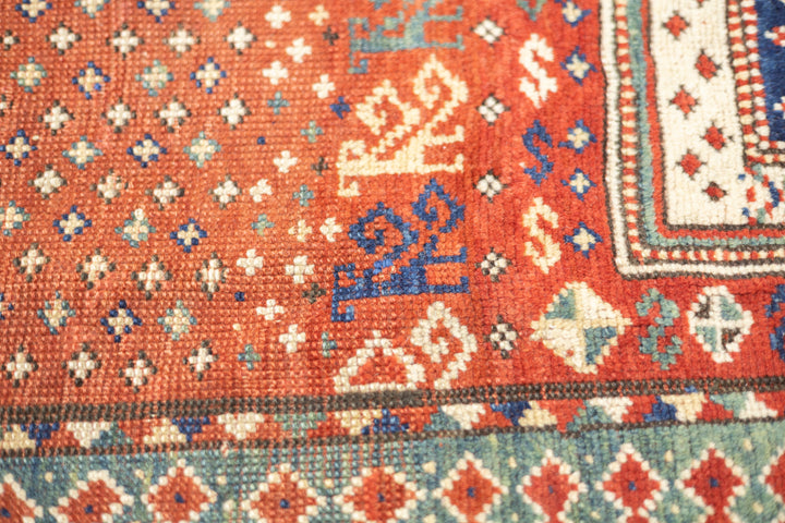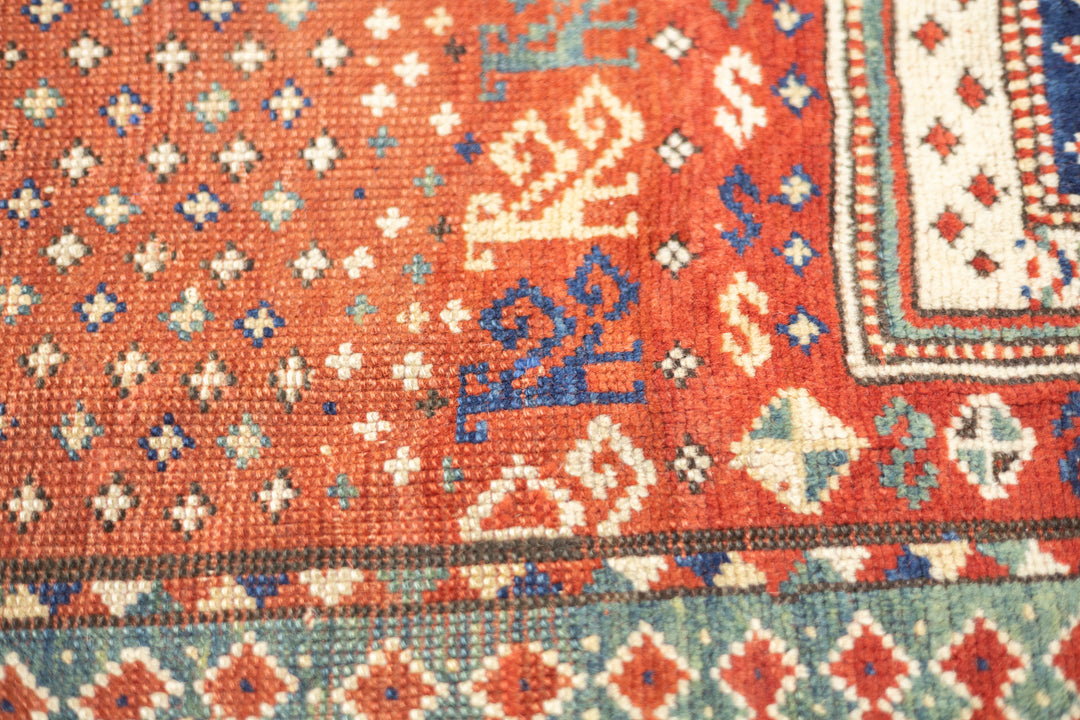 This sub-type of Kazak rug is related to the larger Sewan group, but here it shows a red and ecru central medallion, on a dark blue panel with end extensions, all speckled. The red field shows dots, stars and simple birds. The ivory border has a modular design with squares of four radiating buds. The weave is moderate and the dyes are all natural and the materials are handspun. An unusual and desirable antique Kazak rug. Good condition for the age and use.