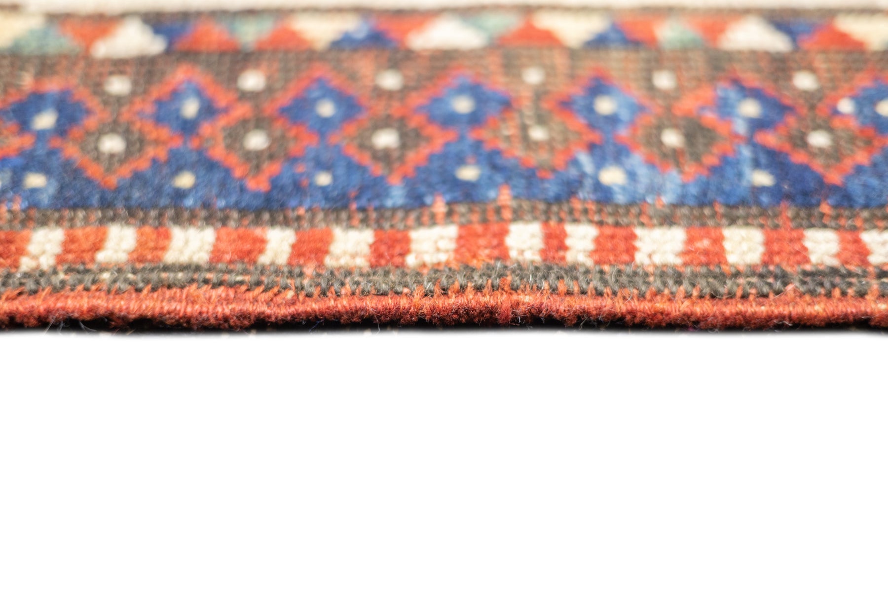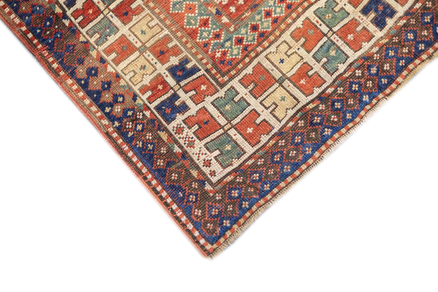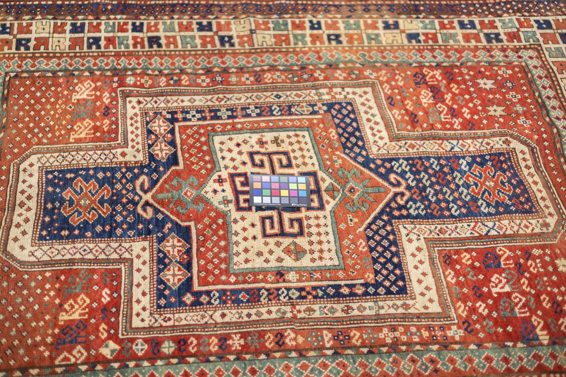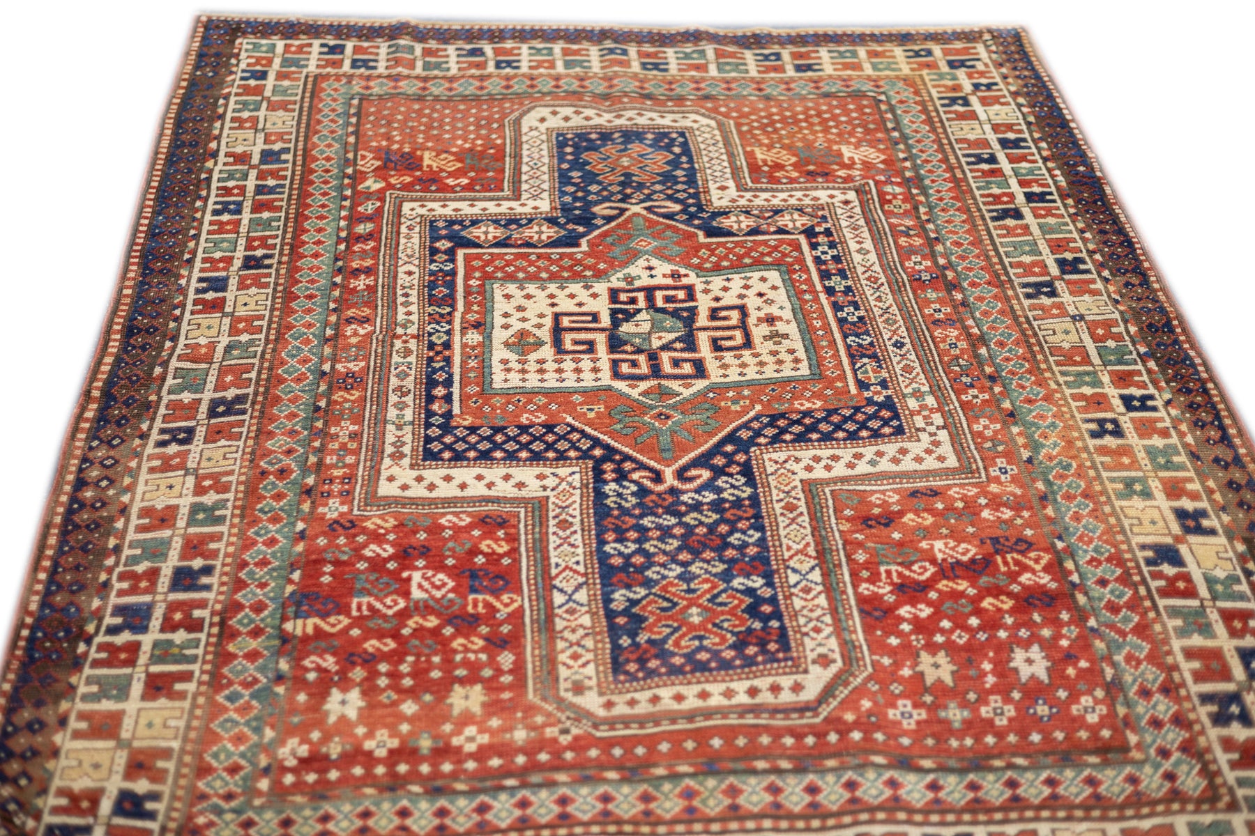 This sub-type of Kazak rug is related to the larger Sewan group, but here it shows a red and ecru central medallion, on a dark blue panel with end extensions, all speckled. The red field shows dots, stars and simple birds. The ivory border has a modular design with squares of four radiating buds. The weave is moderate and the dyes are all natural and the materials are handspun. An unusual and desirable antique Kazak rug. Good condition for the age and use.