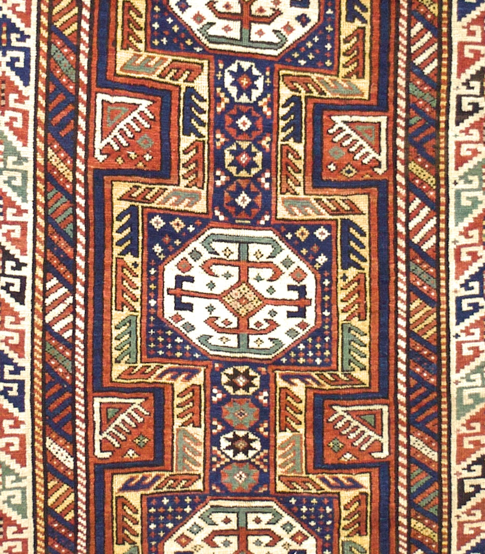 Azeri Turks inhabit the Kuba area of the central west Caspian Caucasus and weave a wide variety of geometric scatters, runners, long rugs and niche (prayer) pieces, in geometric allover and medallion designs. Some flat-weaves in kilim/tapestry and sumak (weft-wrapping) techniques are also woven. Numerous identified types/villages: Zeychur, Alpan, Chi-chi, etc. Generally all-wool, moderate to medium weave. Colorful.