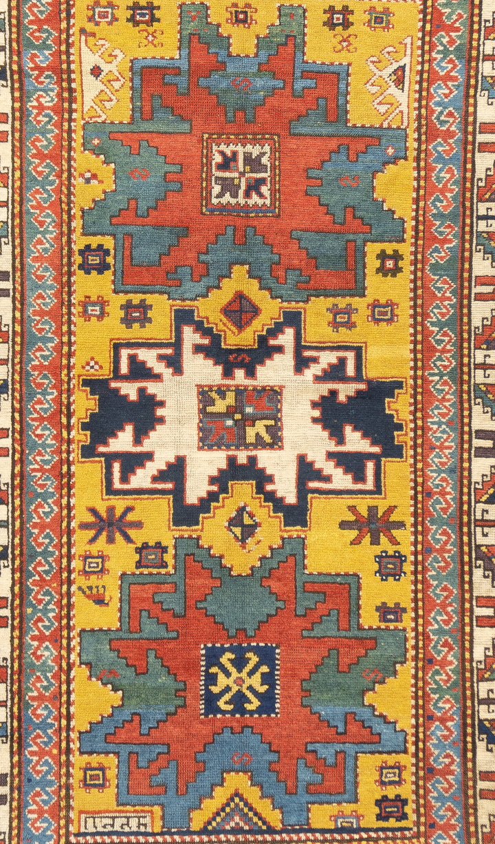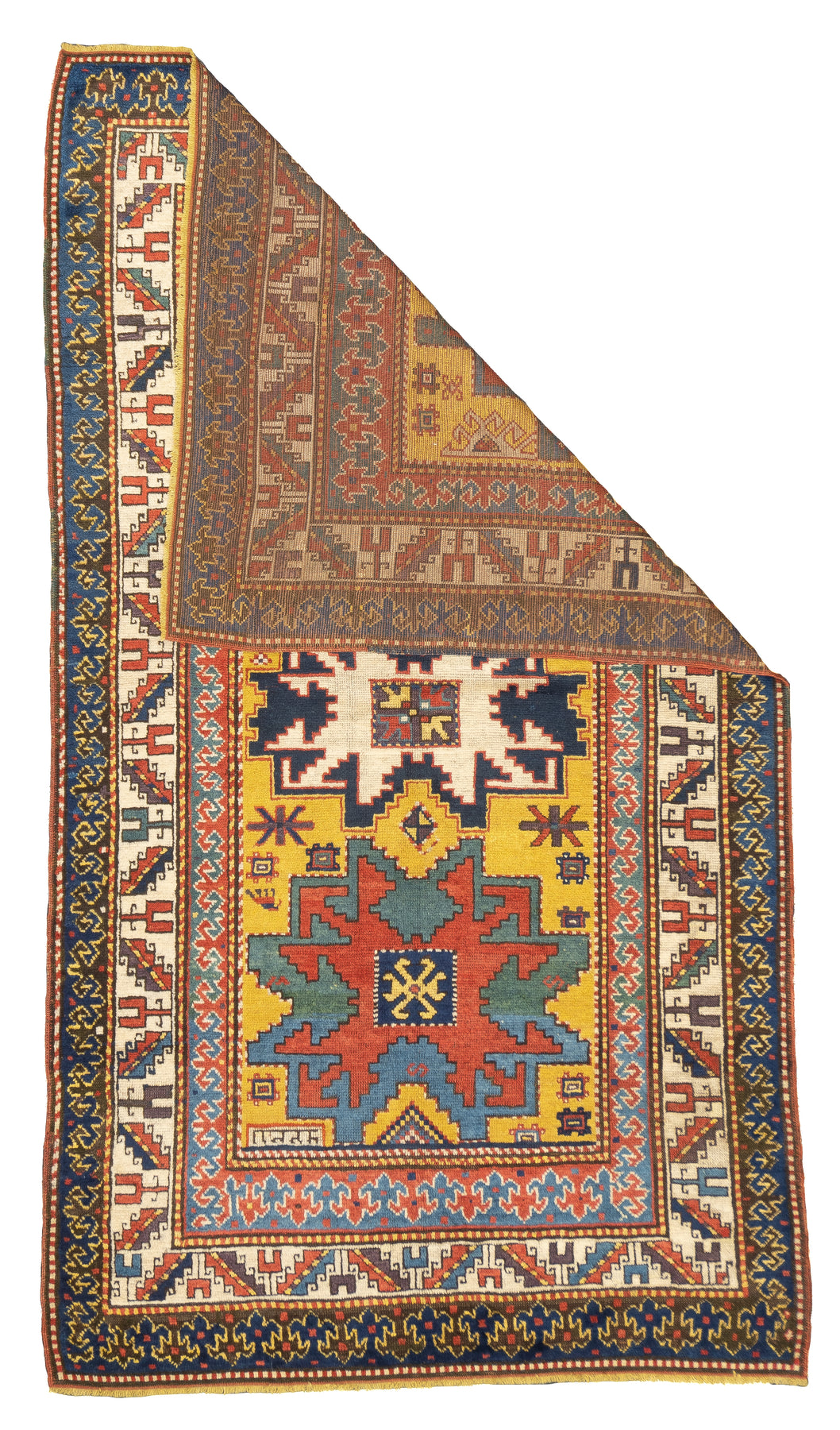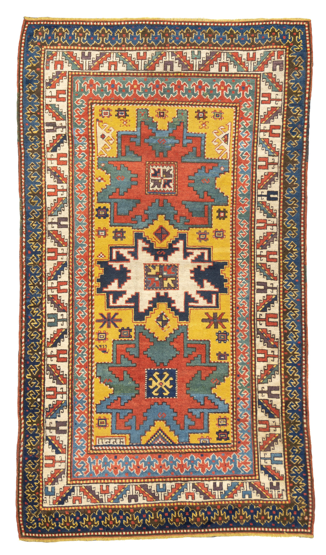 Eastern Caucasian, west Caspian Caucasian rugs, primarily scatters, in geometric layouts, some prayer, from a wide range of local villages. Marasali prayer rugs are considered as the best. Some pictorials.  Wool warps, often cotton wefts. Lowish pile, moderate to fine weaves. Natural dyes exclusively until 1890’s, then synthetics appear. Moderate to high priced.