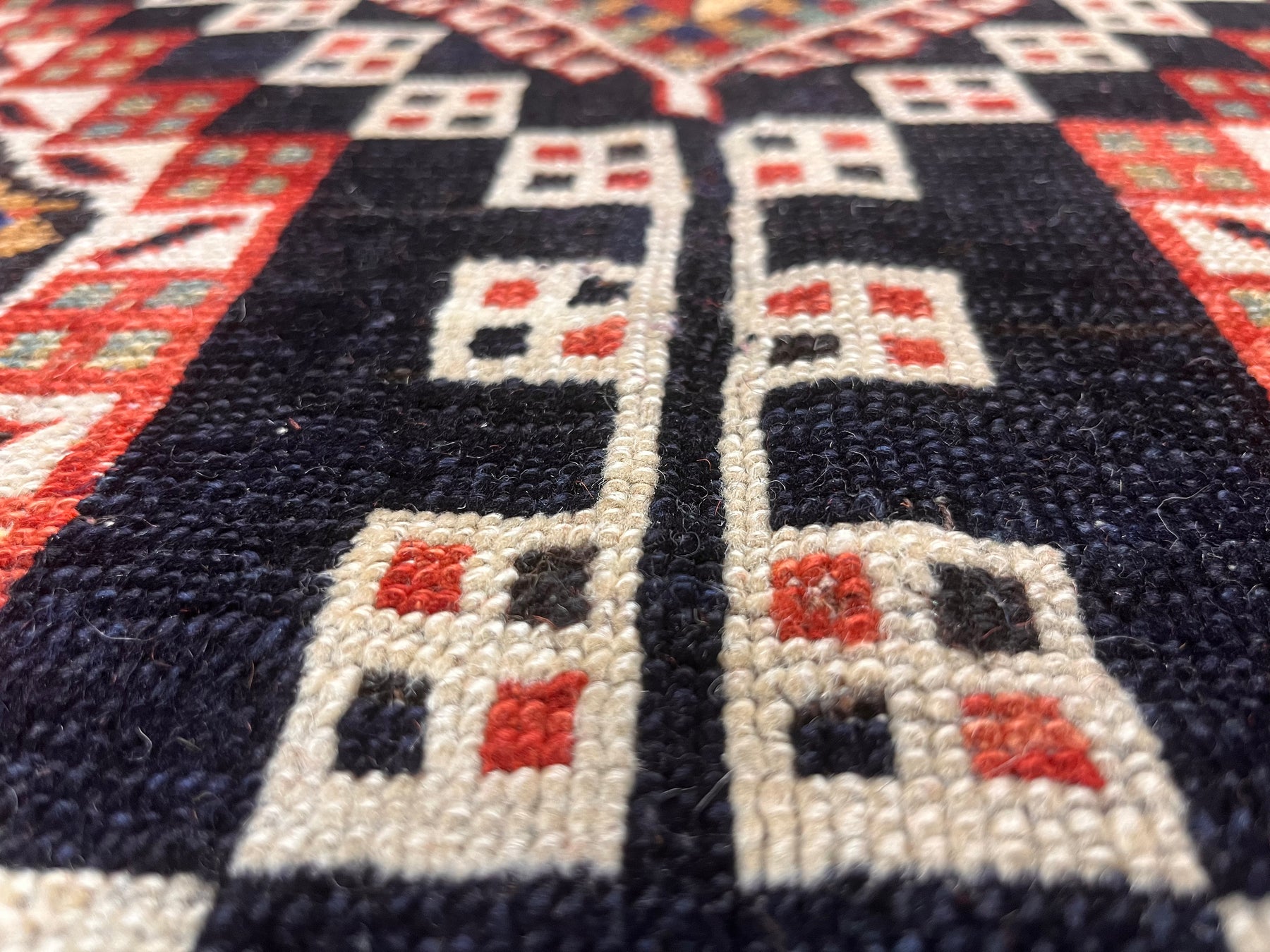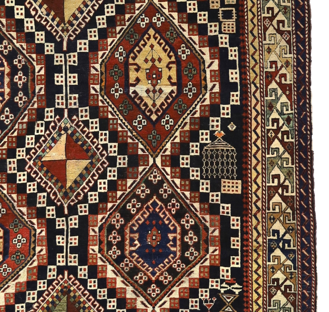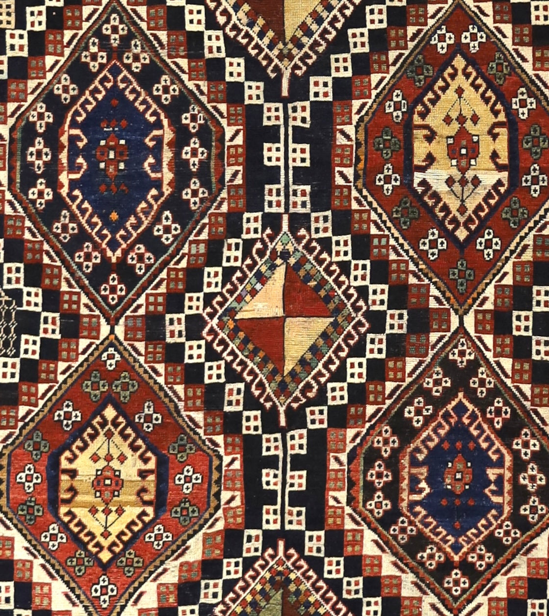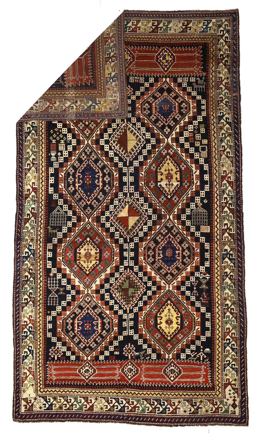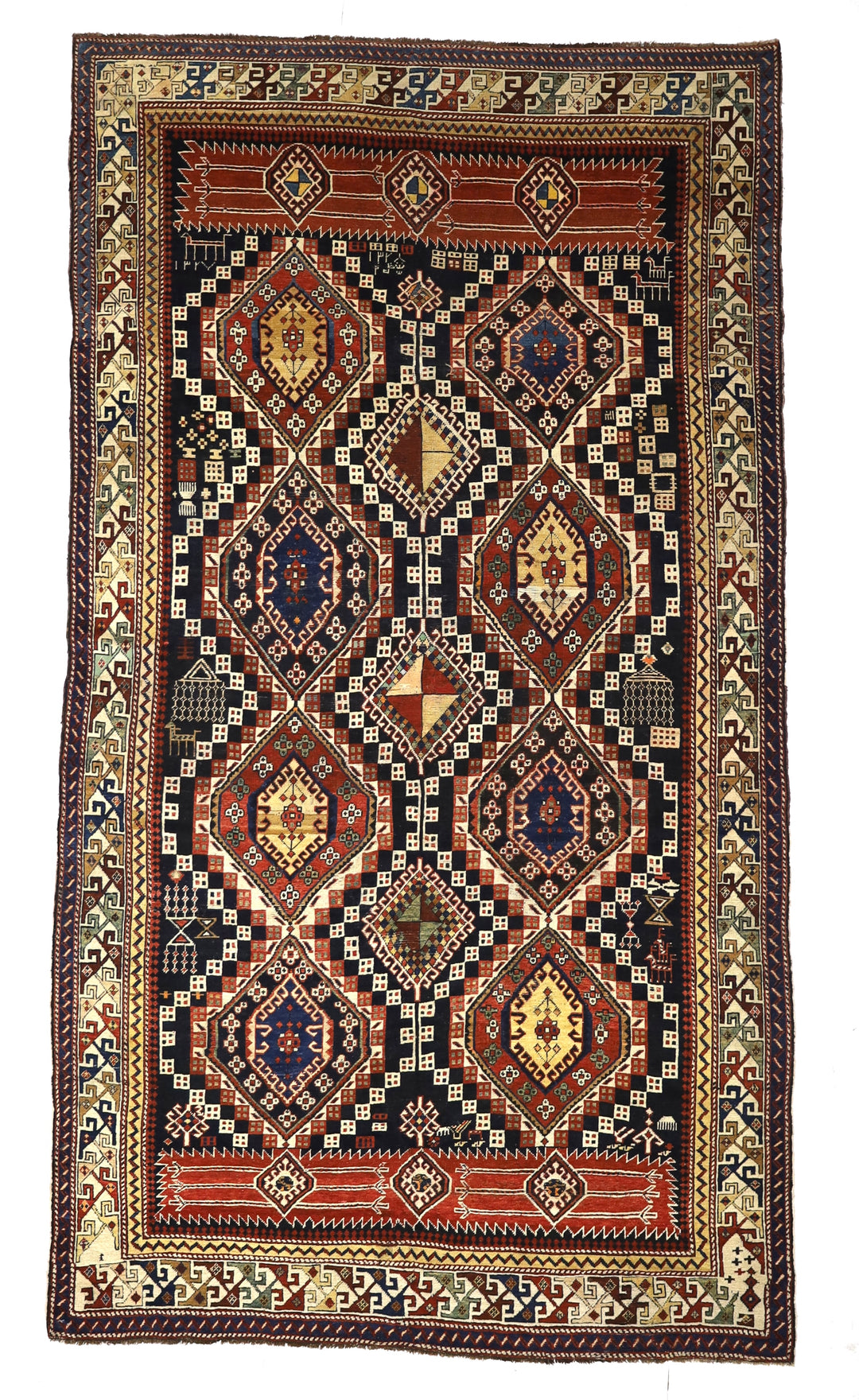 Eastern Caucasian, west Caspian Caucasian rugs, primarily scatters, in geometric layouts, some prayer, from a wide range of local villages. Marasali prayer rugs are considered as the best.. Some pictorials.  Wool warps, often cotton wefts. Lowish pile, moderate to fine weaves. Natural dyes exclusively until 1890’s, then synthetics appear. Moderate to high priced.