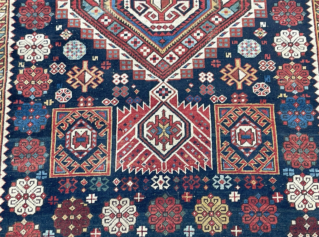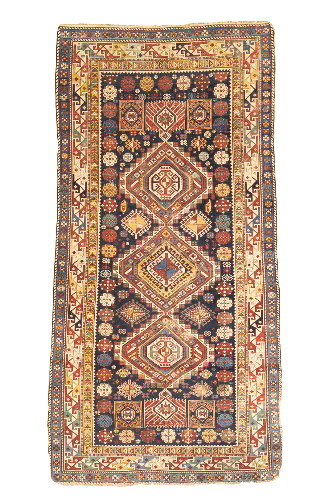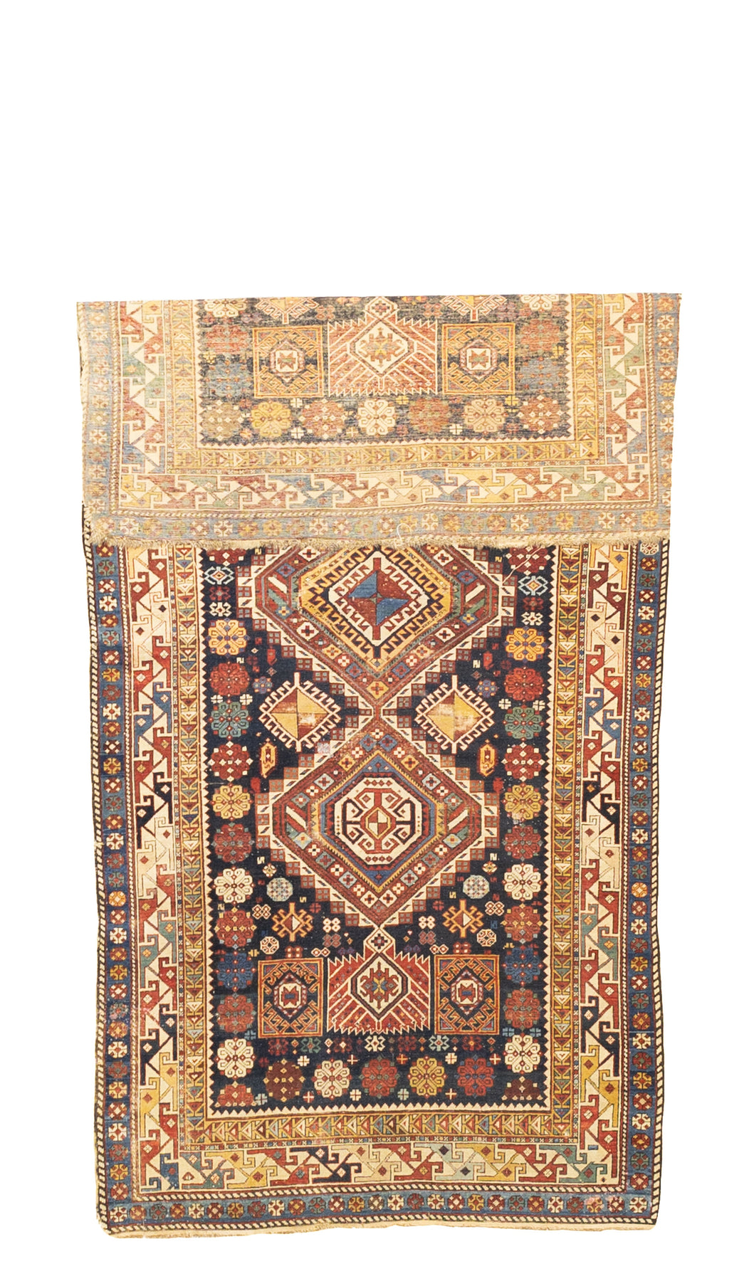 Eastern Caucasian, west Caspian Caucasian rugs, primarily scatters, in geometric layouts, some prayer, from a wide range of local villages. Marasali prayer rugs are considered as the best. Some pictorials. Wool warps, often cotton wefts. Lowish pile, moderate to fine weaves. Natural dyes exclusively until 1890’s, then synthetics appear.