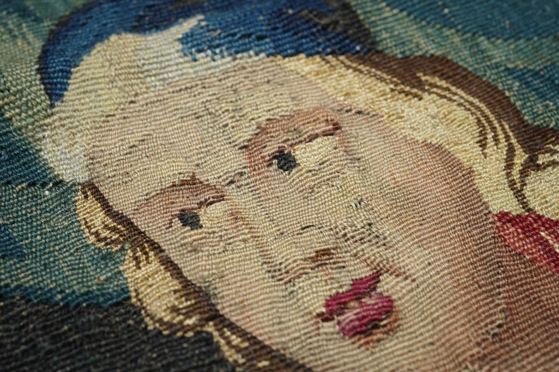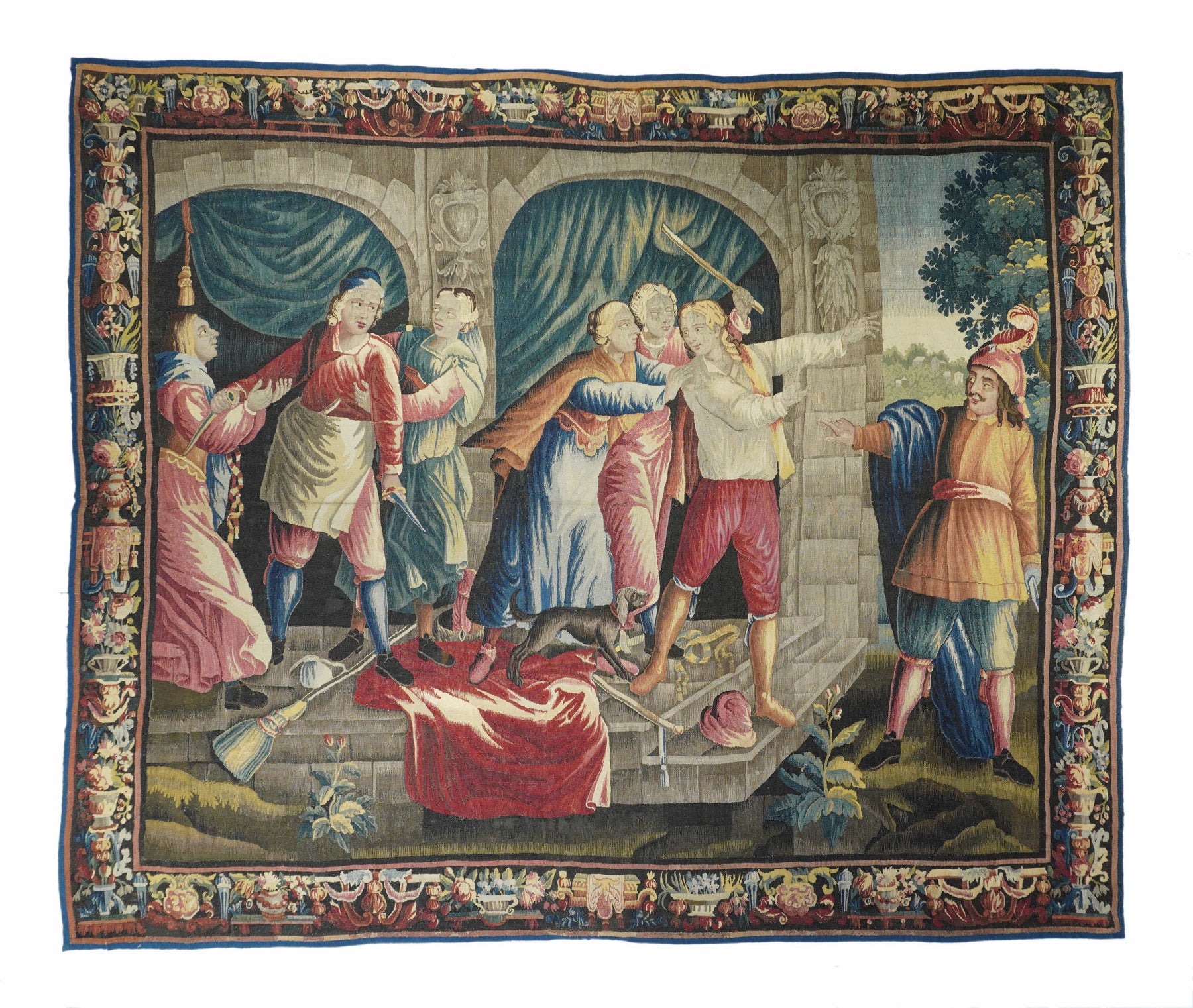 This French tapestry shows a male figure (Don Quijote?) being expelled by a group of women, in a colonnaded and draped porch, with a male figure standing outside in the surrounding landscape. A dog assists in the action. Wool and silk pattern wefts. The natural dyes are still crisply saturated, even after three centuries. Border with vases, trays and planters, all exuberantly displaying garden flowers. Good condition.