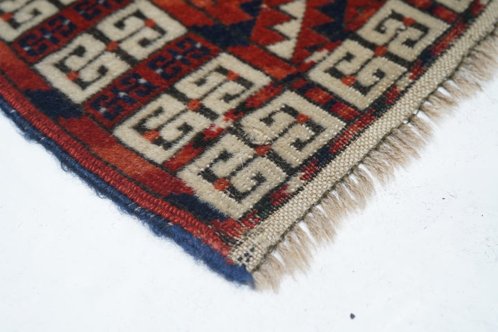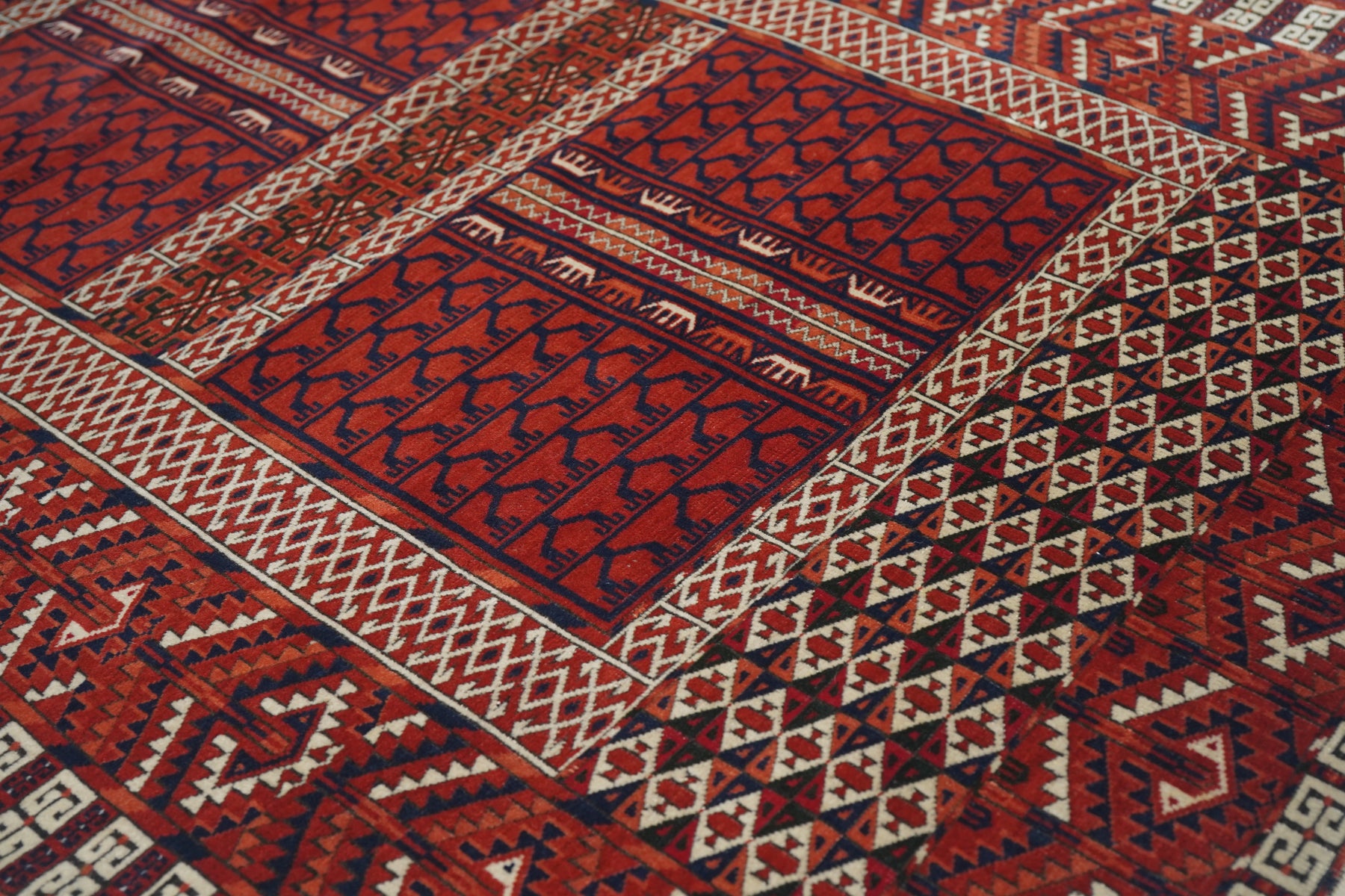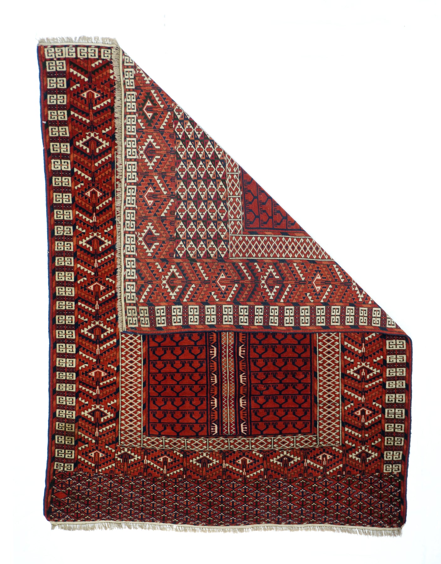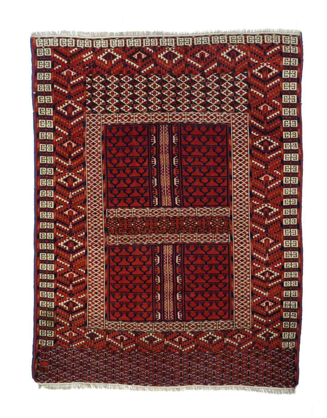 The four panel red field design is characteristic of many types of Turkmen door rugs (engsis). Usually those of the large Tekke tribe show a niche protracting into and through the upper “bulls’ eye’ panel. but here it is lacking. Pine tree ashik borders, double E outer band and an additional lower panel (elem) with a small, lozengoid triple flower repeat. Essential palette of red, burnt orange, navy and ivory. Surviving plain woven ends,. Good condition.