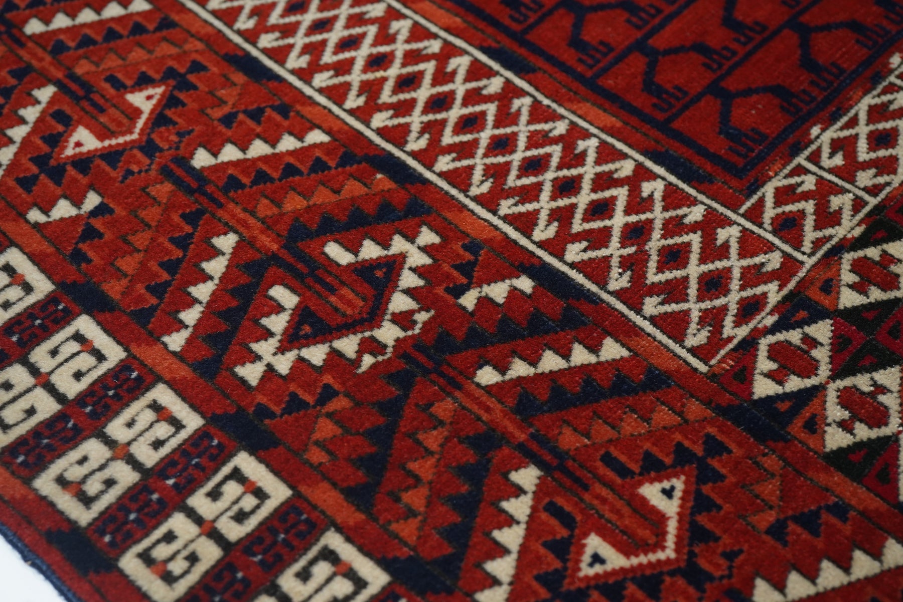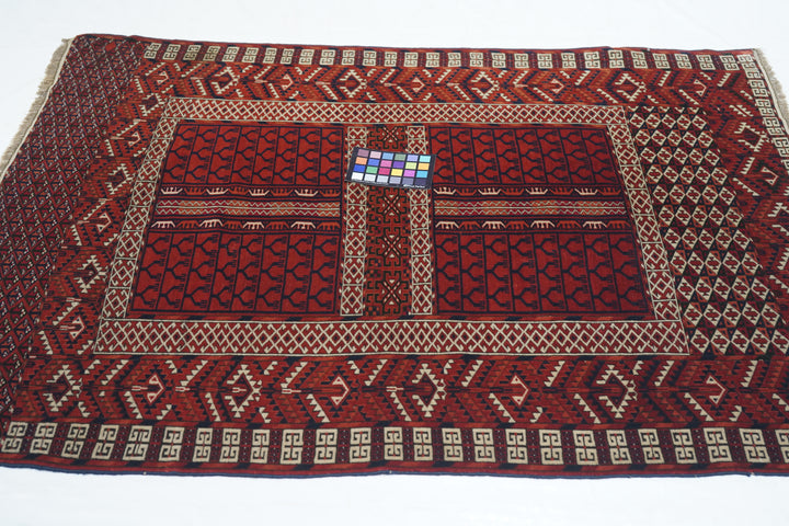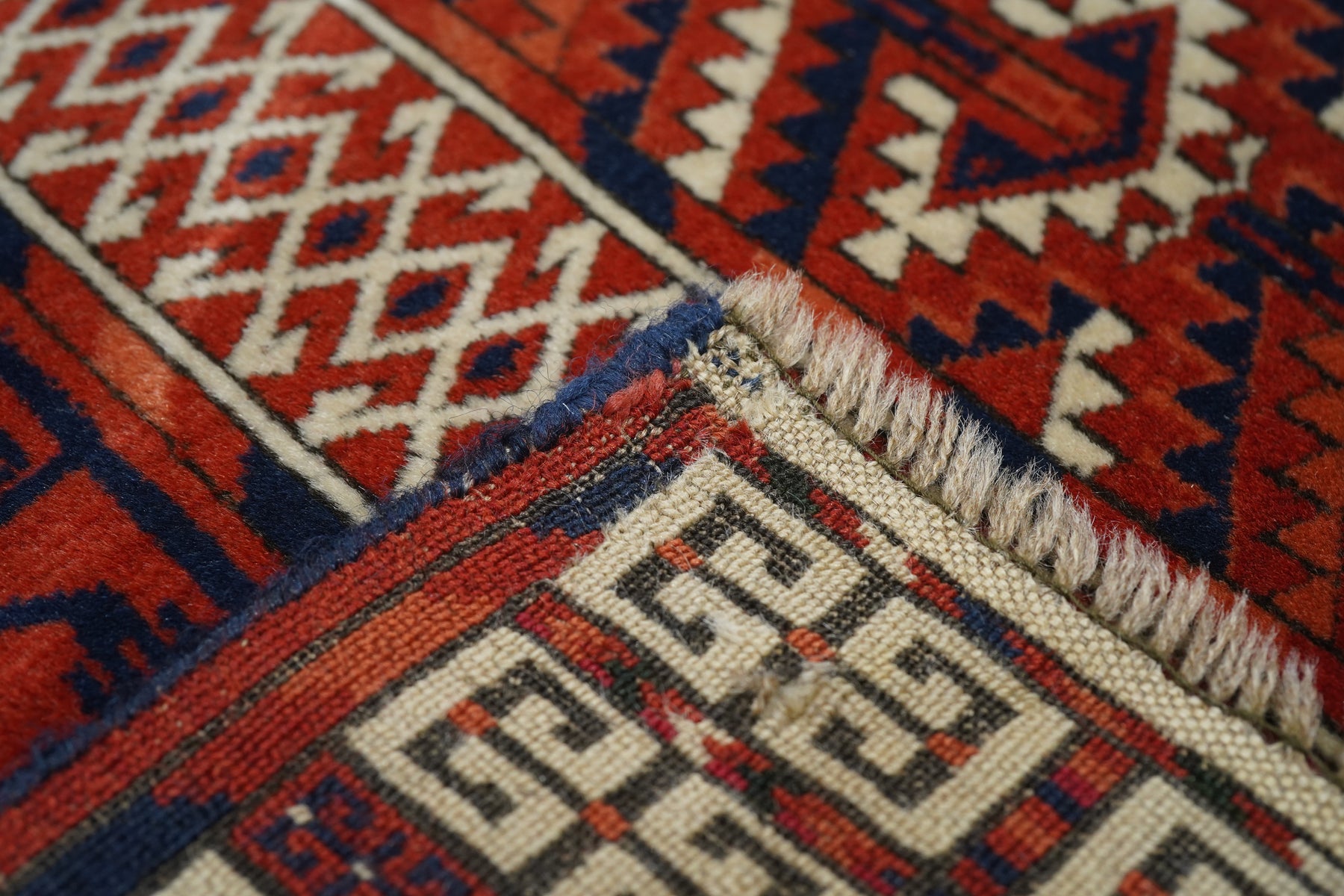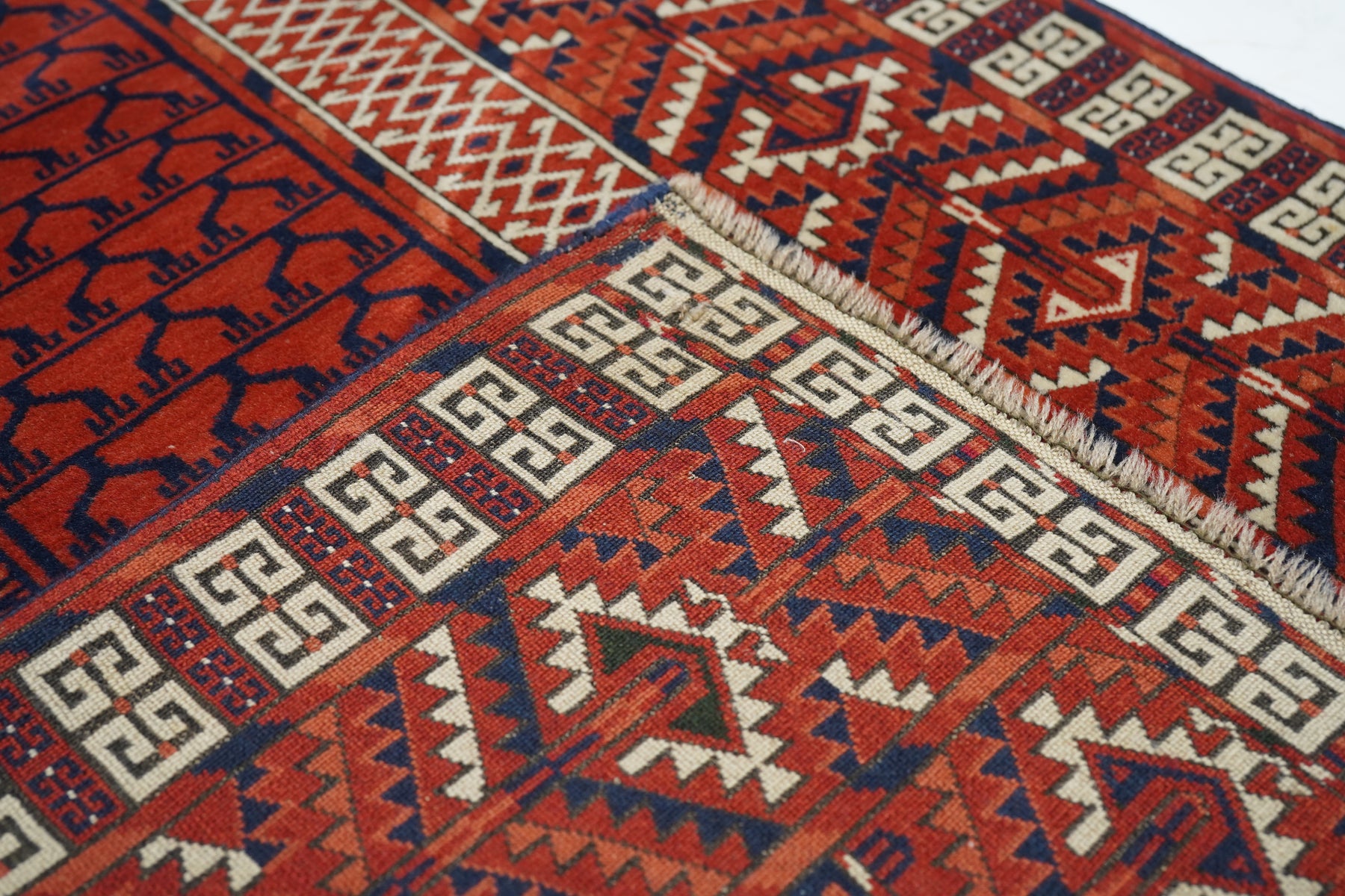The four panel red field design is characteristic of many types of Turkmen door rugs (engsis). Usually those of the large Tekke tribe show a niche protracting into and through the upper “bulls’ eye’ panel. but here it is lacking. Pine tree ashik borders, double E outer band and an additional lower panel (elem) with a small, lozengoid triple flower repeat. Essential palette of red, burnt orange, navy and ivory. Surviving plain woven ends,. Good condition.