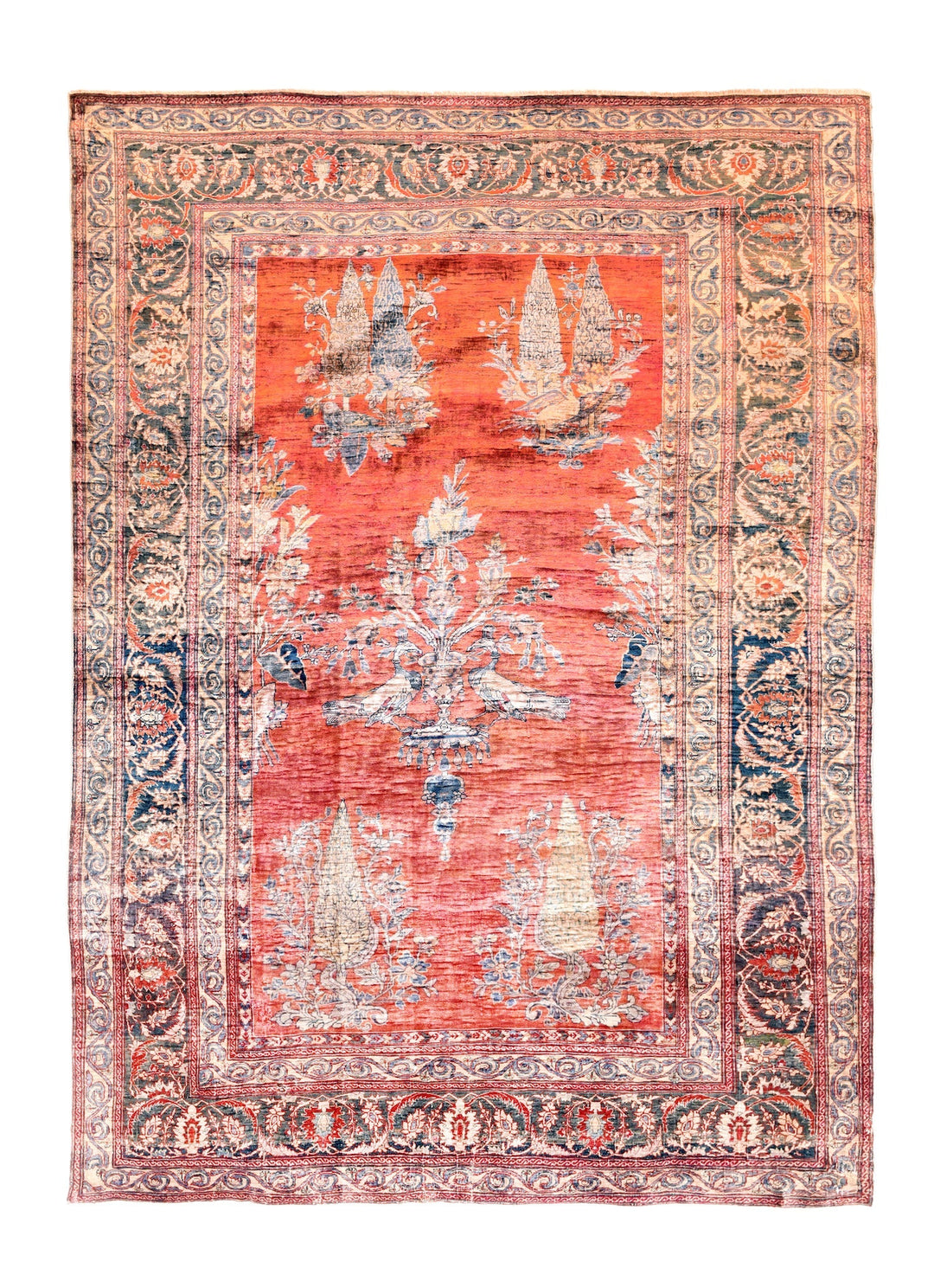 This very finely woven, well-preserved NW Persian antique scatter presents a rust field with five full vignettes: a central vase, iris, and twin bird composition; lower pair with cypresses and serpents; upper pair with twinned cypresses and a single bird. Half floral motives at the mid-sides. Main slate border of palmettes, serrated leaves, and multiple arabesque vines. Scrollery minors and innermost polychrome chevron stripe. All silk construction.